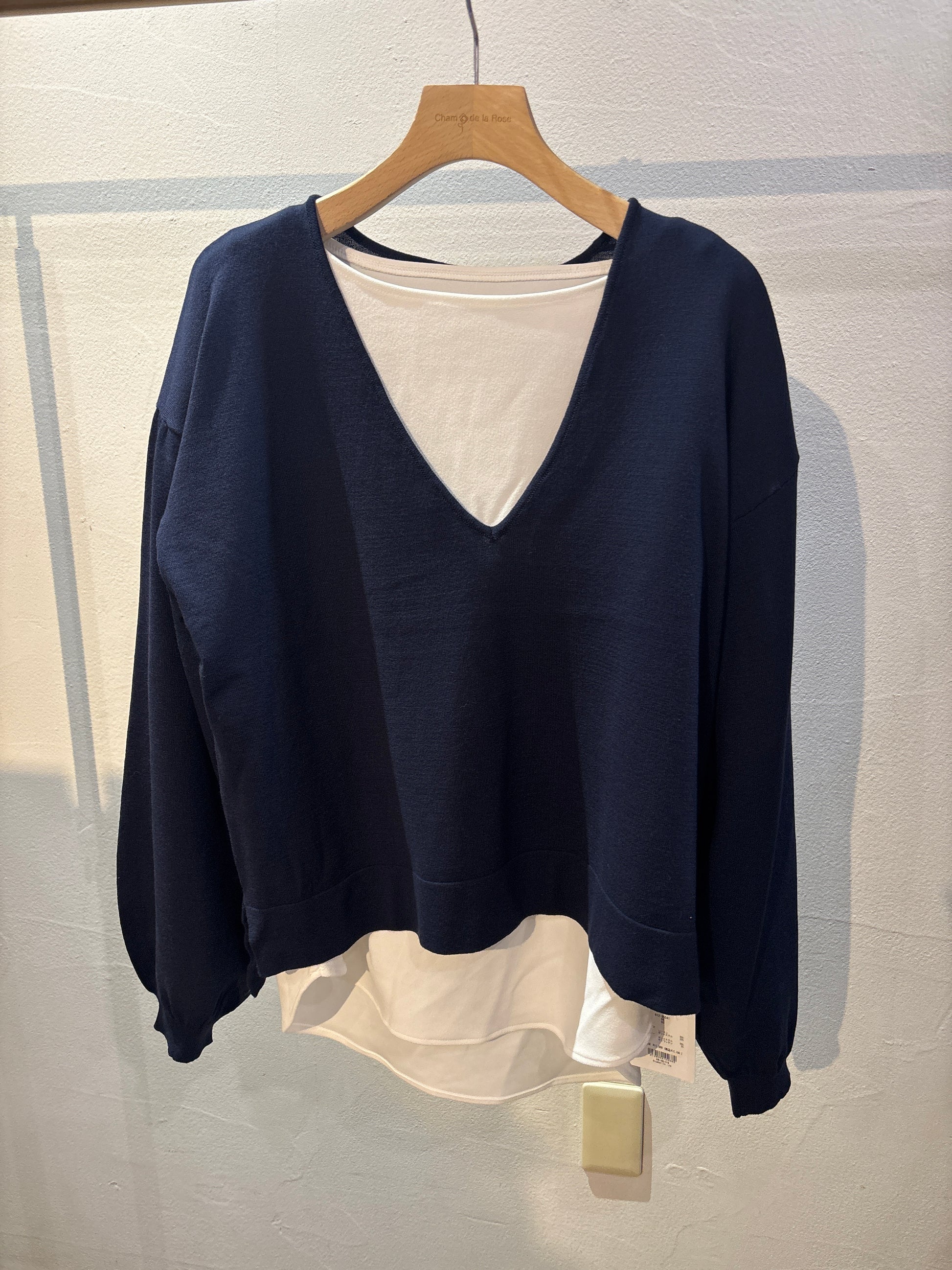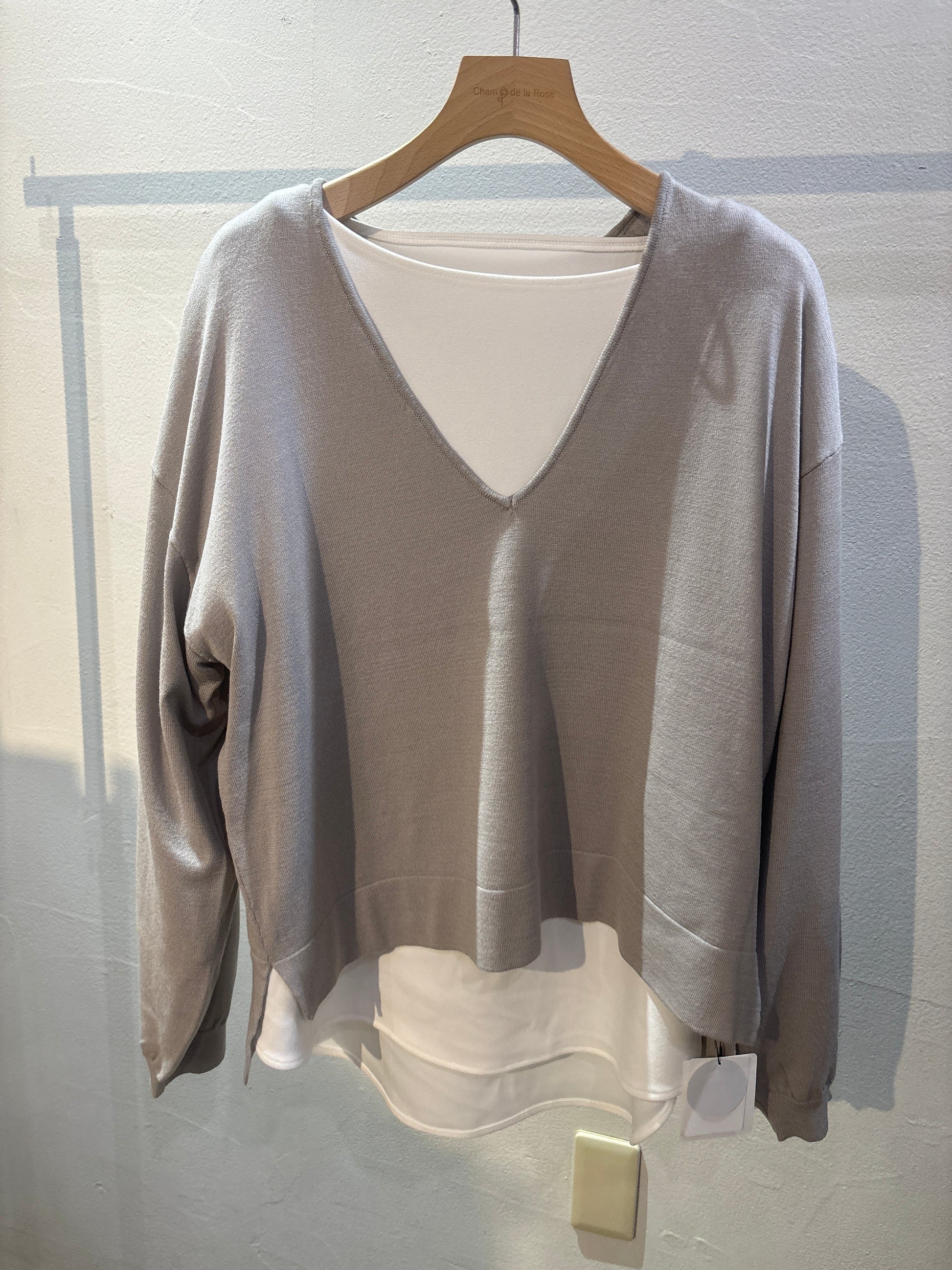 [CLOCHE] V-neck knit and Georgette long tee ensemble