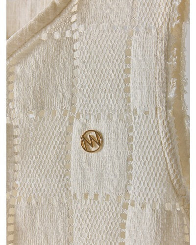 This lace top features a striking, mannish square-patterned lace. The raw-edge piping and cut-off details on the shoulders create a relaxed, relaxed look. Randomly placed shell buttons add a playful touch and depth to the look. The diagonal cut at the front hem creates a balanced look when paired with bottoms, creating a natural, flattering silhouette.