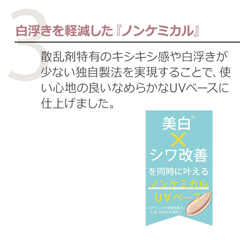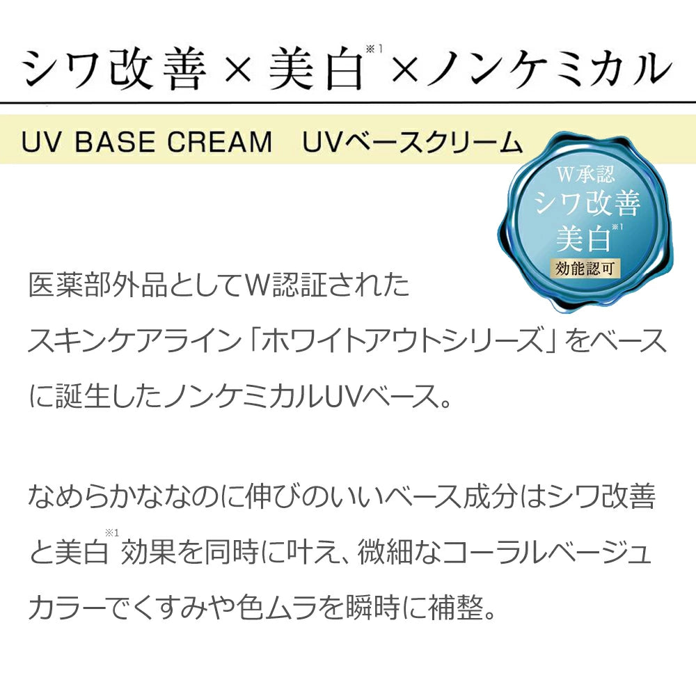 This non-chemical UV base is based on the "Whiteout Series" skincare line, which is certified as a quasi-drug. The smooth yet easy-to-spread base ingredients simultaneously improve wrinkles and whiten skin*, while the subtle coral beige color instantly corrects dullness and uneven skin tone. *Suppresses melanin production and prevents dark spots and freckles.