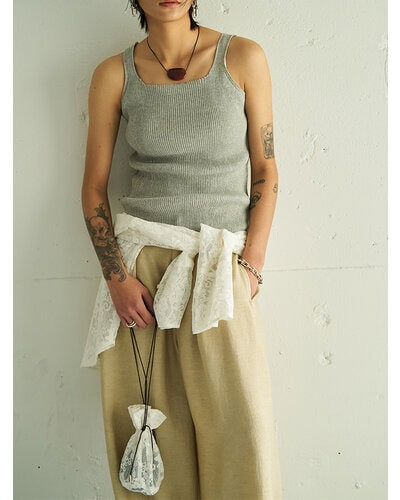 The delicate 14-gauge rib knit, combined with the rough texture of the material, creates a casual knit tank top for adults with just the right amount of craftsmanship. The neckline and armholes are left uncovered, leaving the lace-up for a minimalist look, allowing you to enjoy the rough texture that appears frayed at first glance. This item combines elegance with a rough texture, making it a cool piece to wear in the summer.