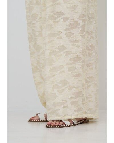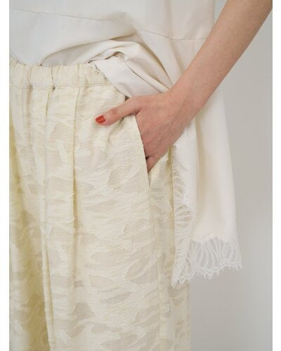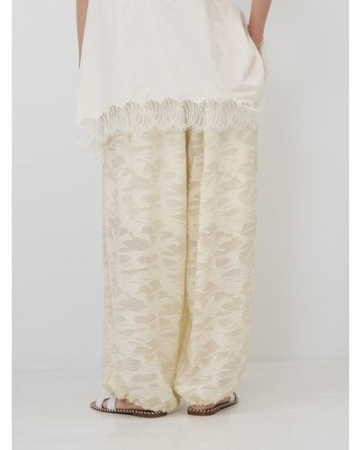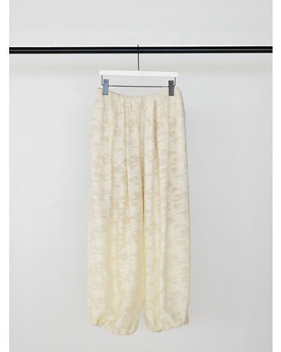 This season's trendy balloon pants are now available in a design fabric. They feature expressive cut jacquard with thick threads running horizontally. The immediately noticeable texture and shadows create a luxurious feel that exudes a craftsmanship feel, while also emanating a somewhat modern vibe.