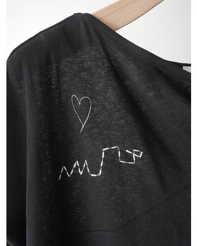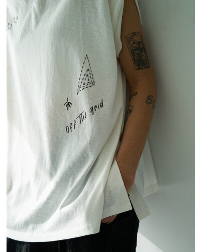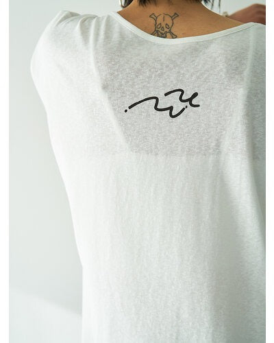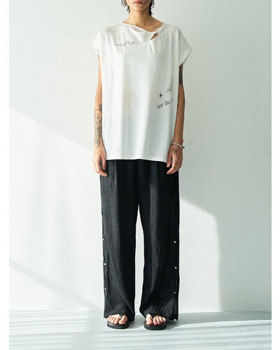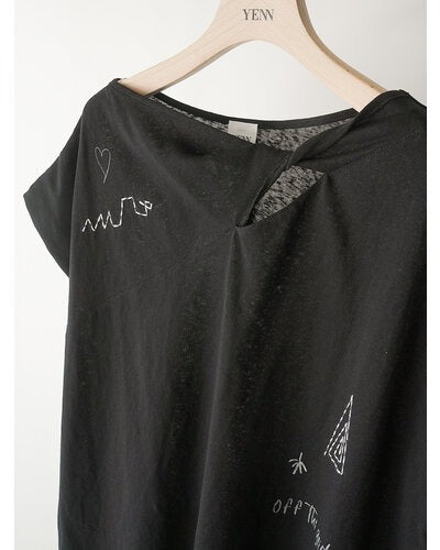 This French sleeve top features a twisted fabric design at the collar, allowing for a subtle exposure of skin. The modestly open neckline creates a sophisticated, relaxed look. The slightly puffy cuffs add a feminine softness. The rough, graffiti-like print is layered with hand-stitched embroidery, creating a graphic look that combines luxury with just the right amount of casualness. The YENN logo motif print on the back adds a touch of style to the back as well. This versatile piece can be paired with clean-cut pants, or you can tuck in just the front of the top, taking advantage of the vents on both sides.