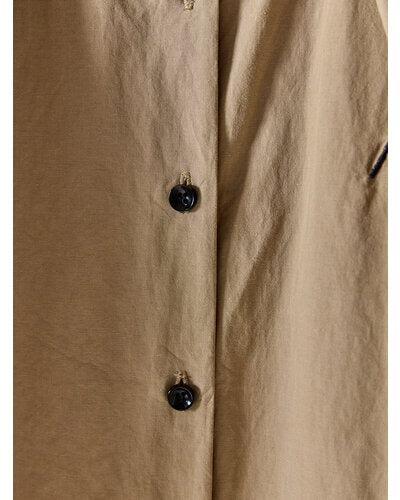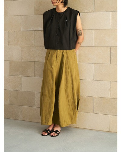When viewed from the front, this simple no-collar shirt blouse features a boxy silhouette created by the gusset and tucks on the back. It was made with care to be worn as if it was being placed on top rather than being worn.