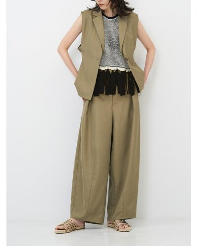 ノースリーブ仕様ですっきりとした印象に仕上げつつ、異素材使いで華やかさをプラス。