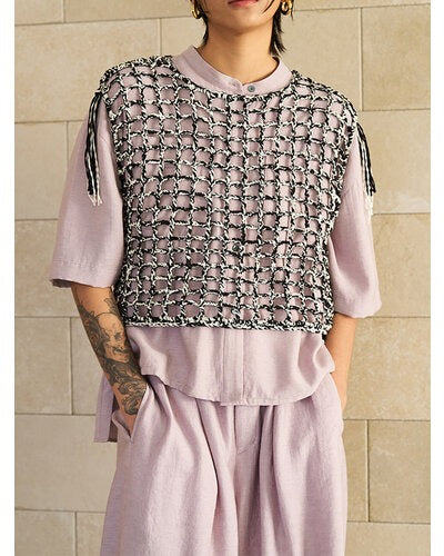 手編みで編み上げたスクエアメッシュ柄のニットトップスです。