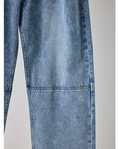 ウエストベルトをタックのように折り込んでボタンで止めるデザインが特徴のデニムパンツです。