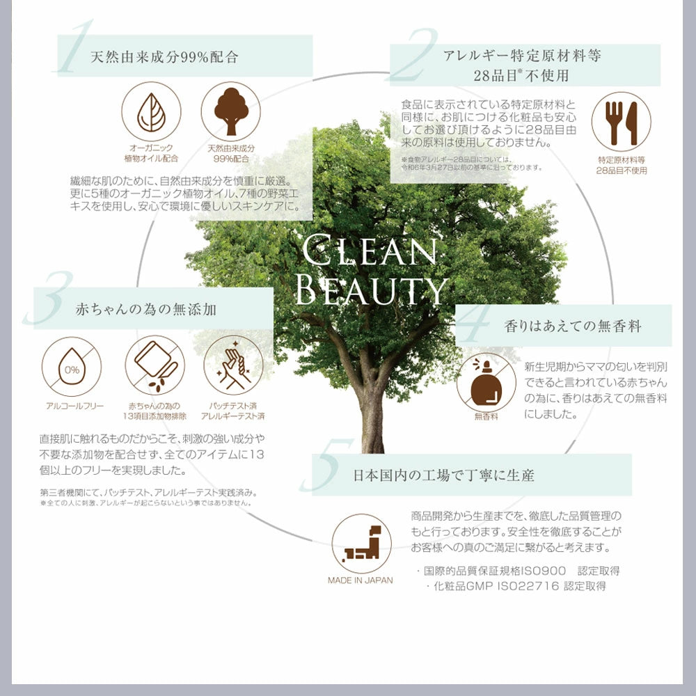 0歳の赤ちゃんの全身に使えるオーガニックオイル配合で、敏感肌の方の保湿ケアにもおすすめです。アレルギー特定原料28品目を全く使わないのはもちろん、大切な赤ちゃんを守るため、14項目の添加物を徹底排除。また、アレルギーテストやパッチテストもクリアしています。