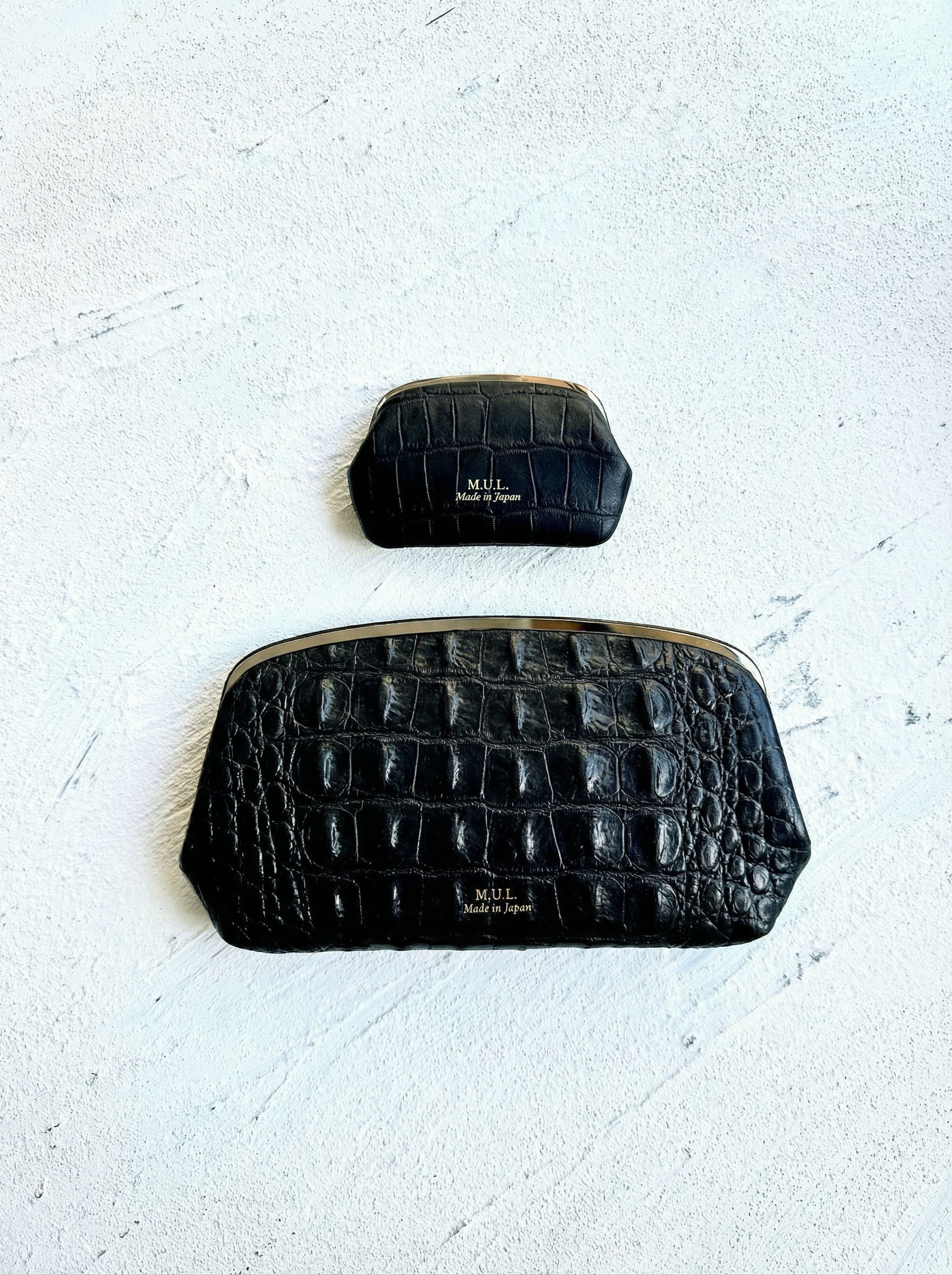 【限定】500.がま口ウォレットセット ブラック クラウンクロコダイル型押し シルバー金具 MUL159
