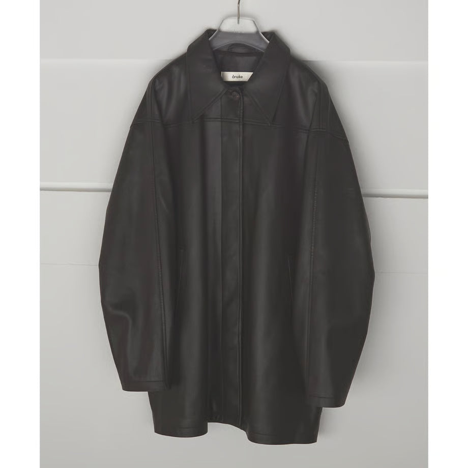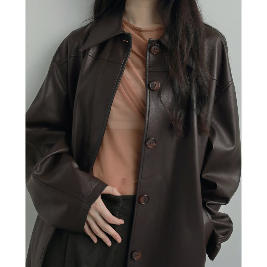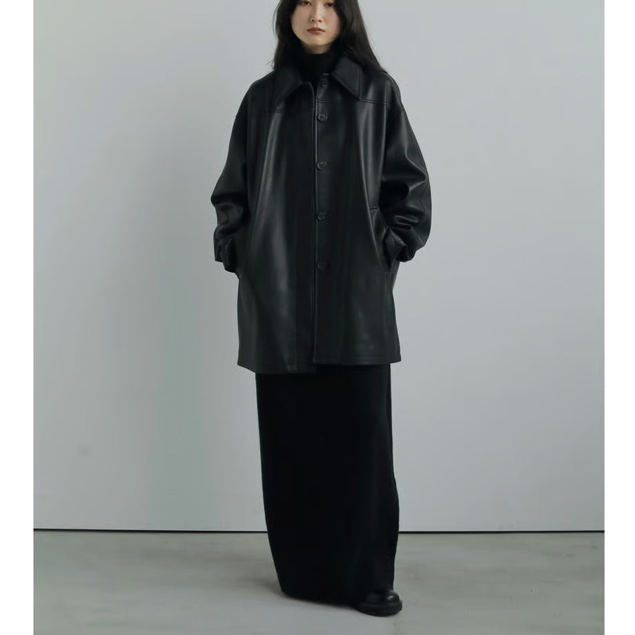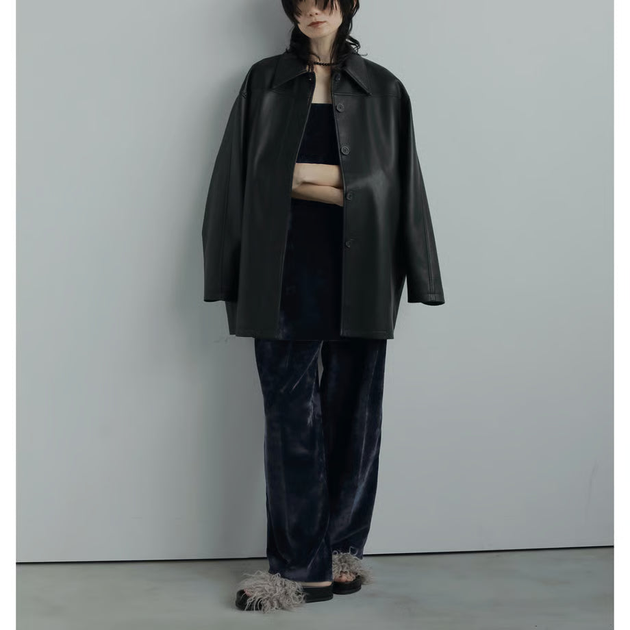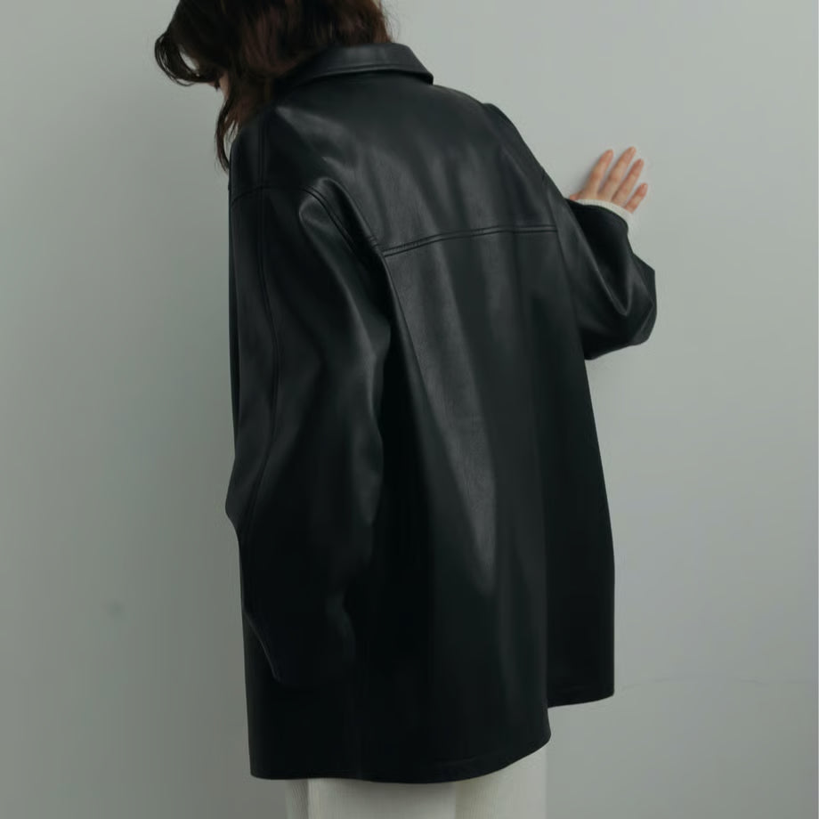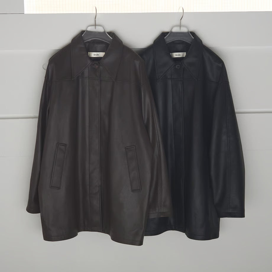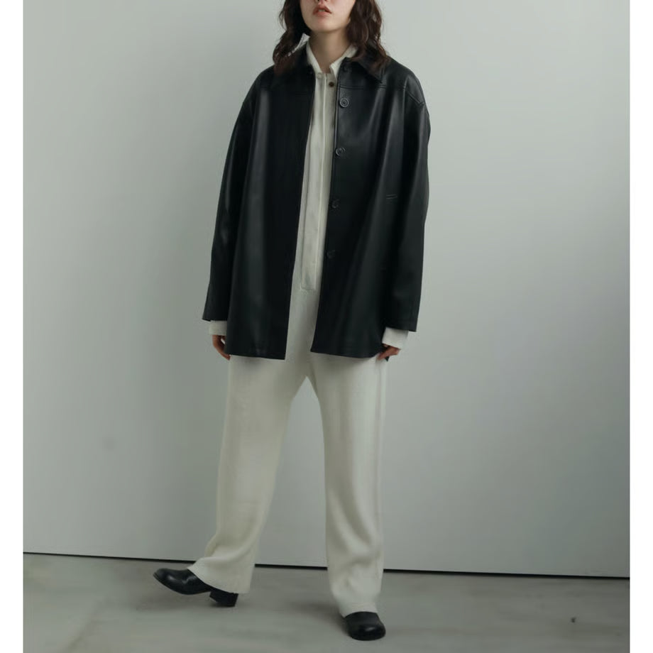 昨年もご好評いただいたエコレザージャケット。上質なエコレザーを使用しました。適度な光沢、細かいシボ、程よいハリ感のある生地で、カジュアルなアイテムですが上品に見せてくれます。オーバーサイズなので、中に肉厚のニットも着ていただけます。袖にタックを入れて少丸みを帯びたシルエットに仕上げています。幅広いスタイリングに合わせやすく、秋だけでなく、寒さの残る春先など、長く使っていただける一枚です。