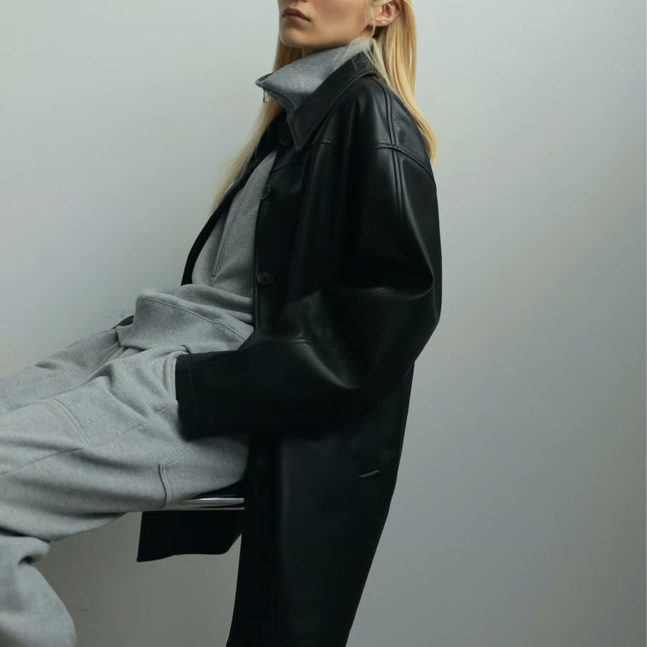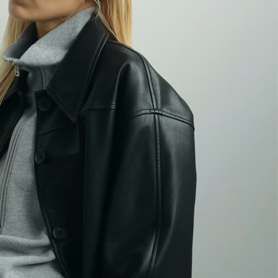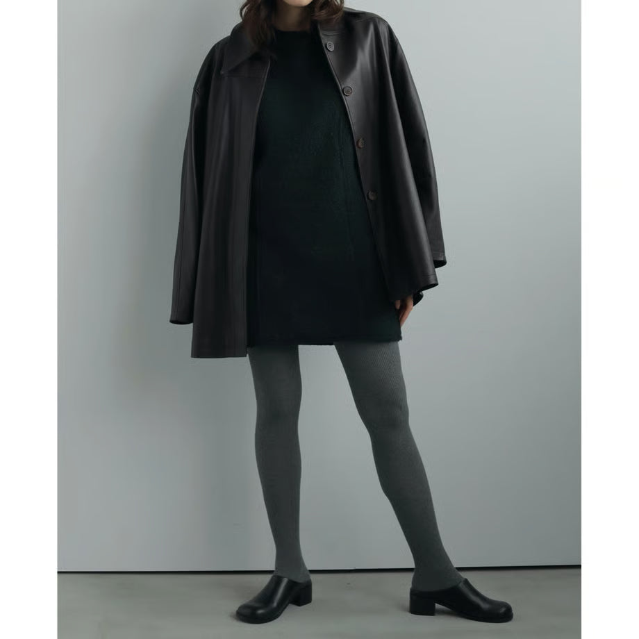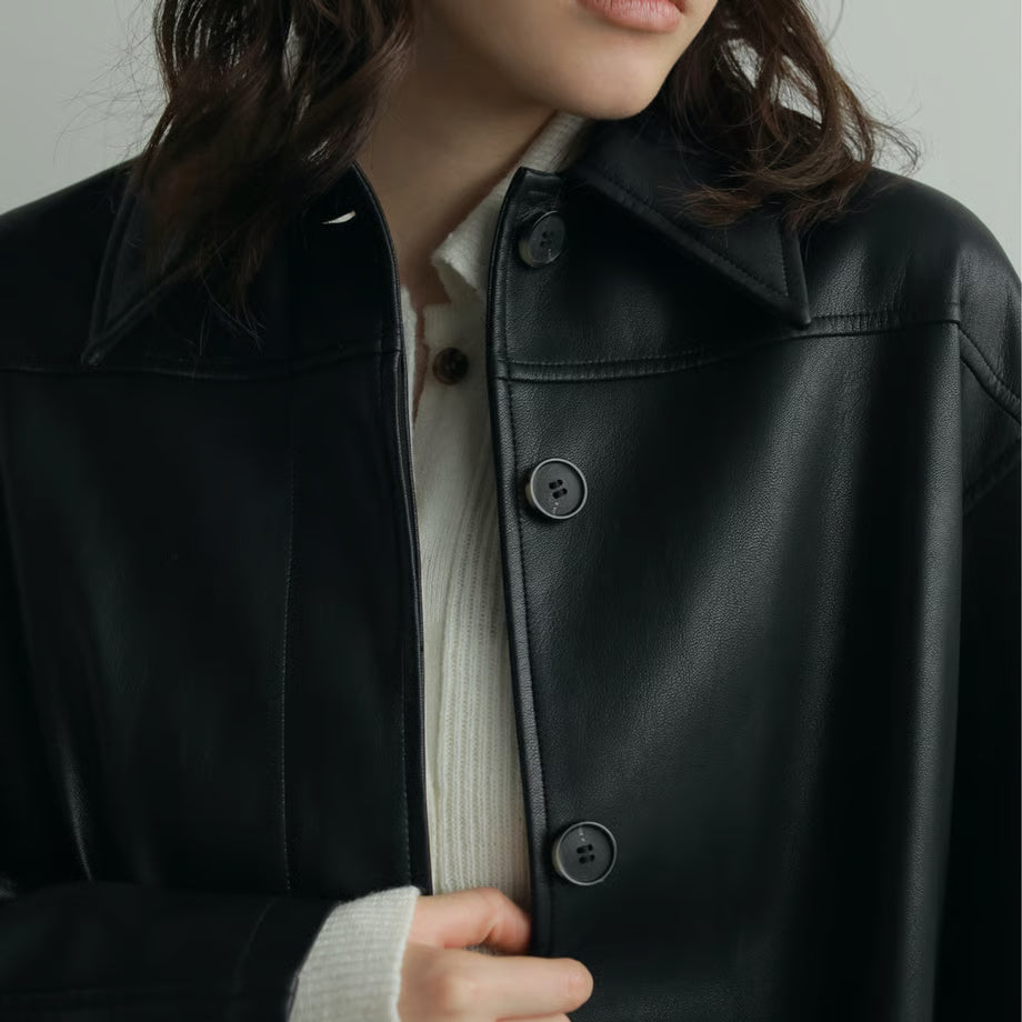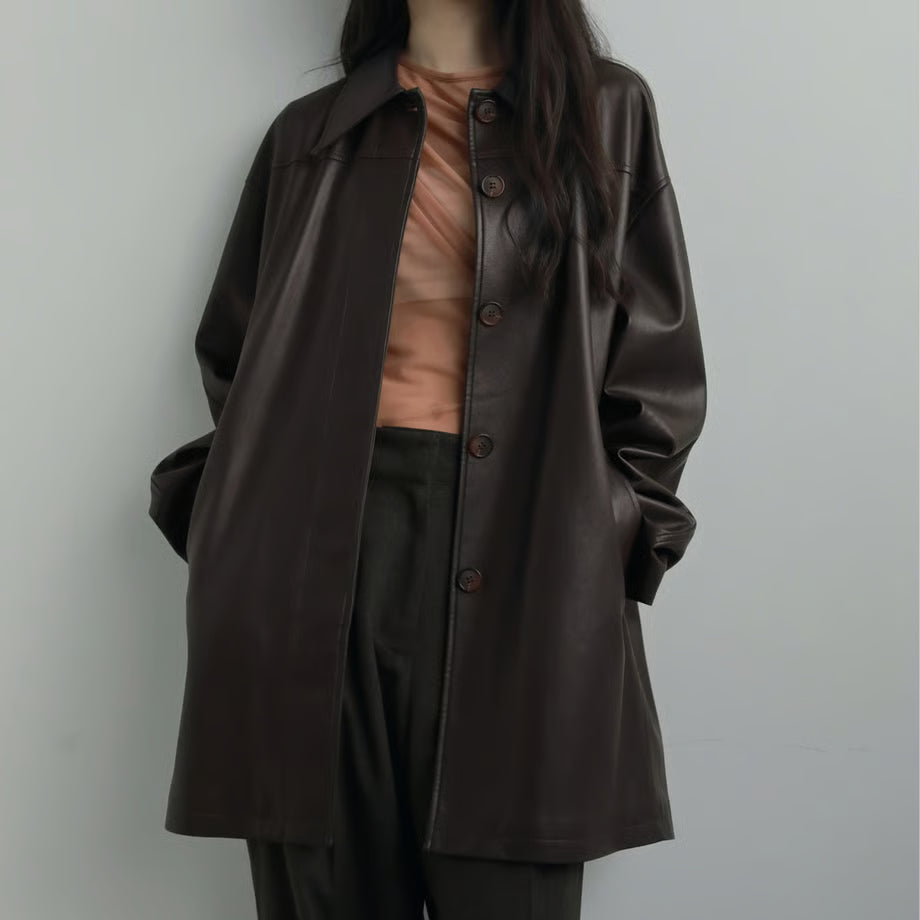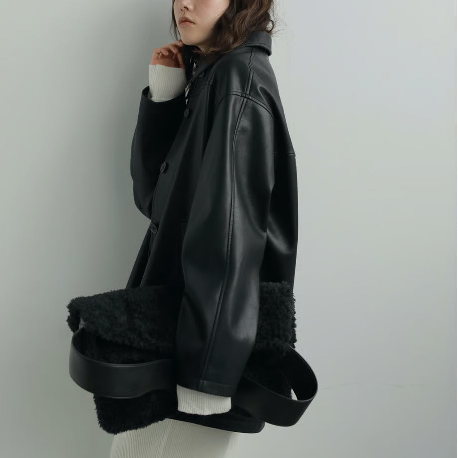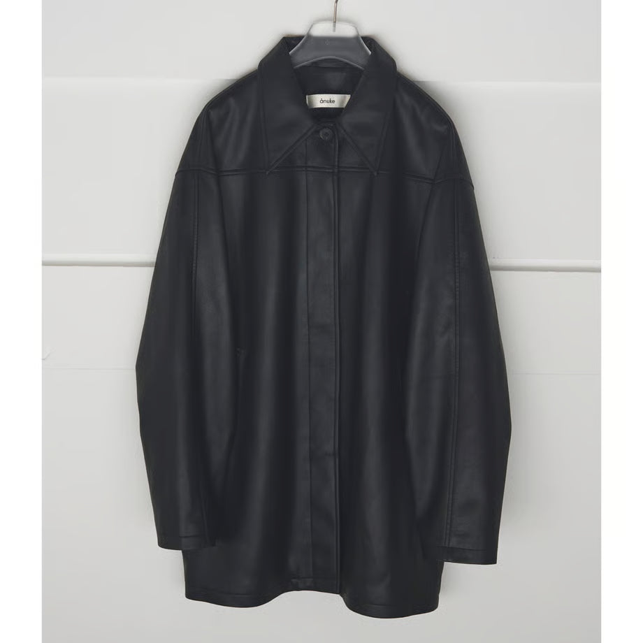 昨年もご好評いただいたエコレザージャケット。上質なエコレザーを使用しました。適度な光沢、細かいシボ、程よいハリ感のある生地で、カジュアルなアイテムですが上品に見せてくれます。オーバーサイズなので、中に肉厚のニットも着ていただけます。袖にタックを入れて少丸みを帯びたシルエットに仕上げています。幅広いスタイリングに合わせやすく、秋だけでなく、寒さの残る春先など、長く使っていただける一枚です。