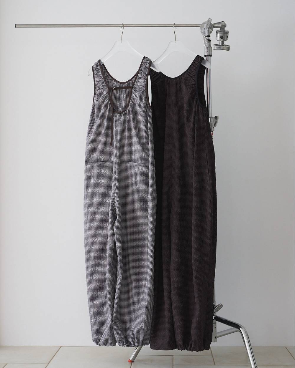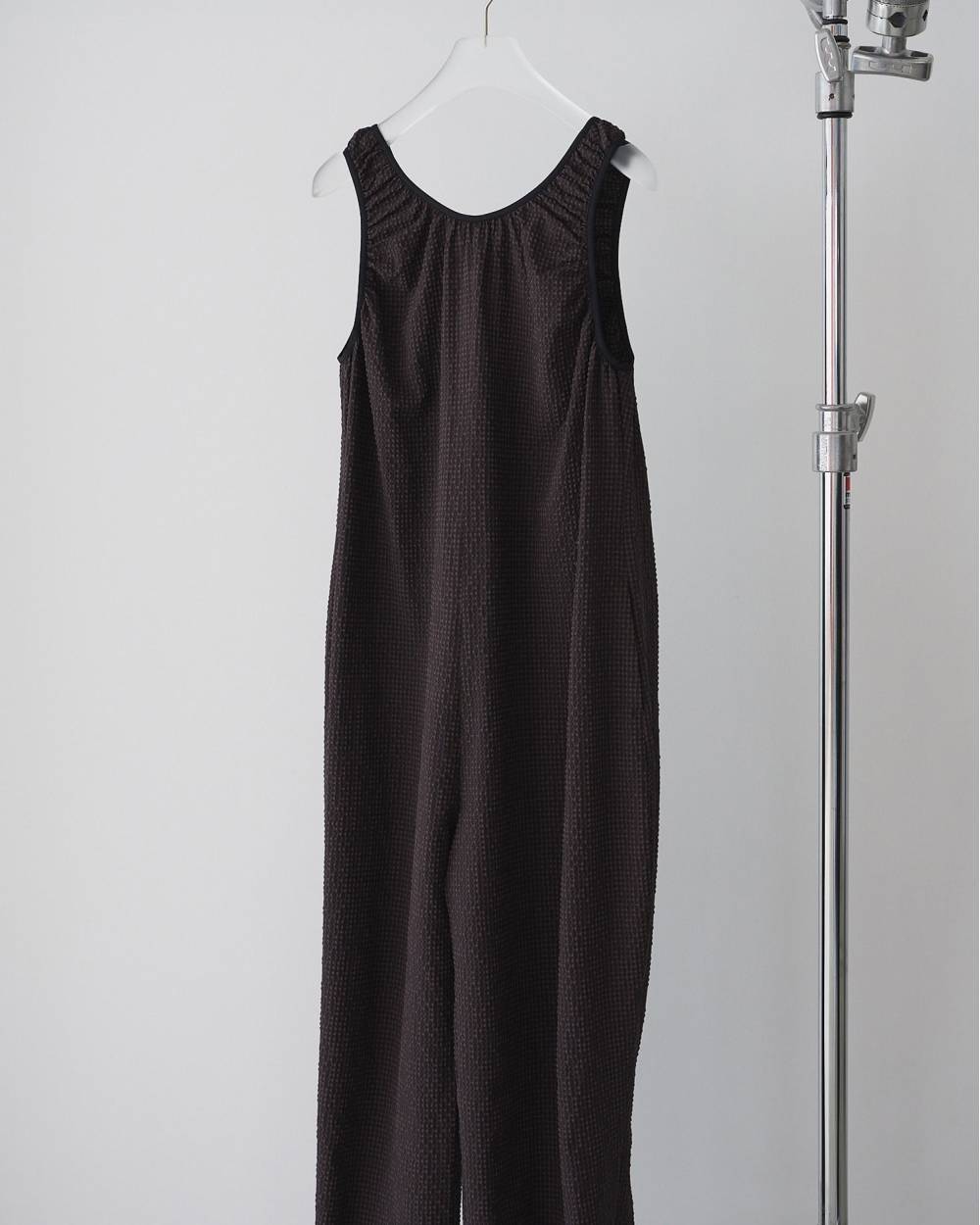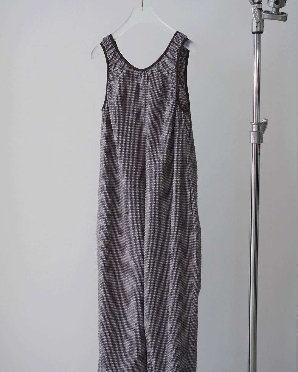 立体的なチェック柄のサッカー素材を使用したコンビネゾン。