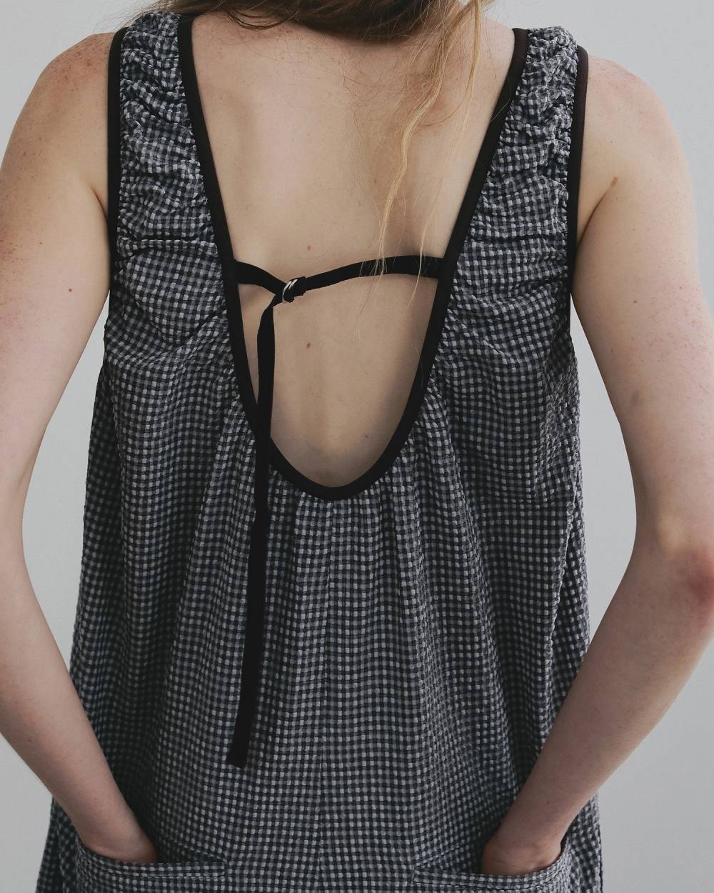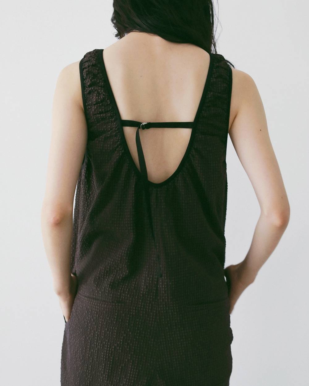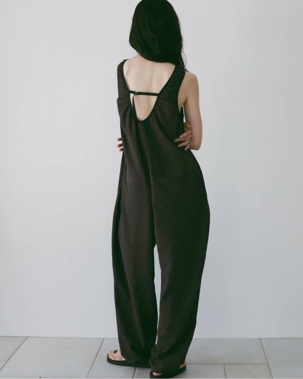 体のラインを拾わないラフなシルエットに、深めに開いた後ろのUネックデザインのバランスが、抜け感を演出。