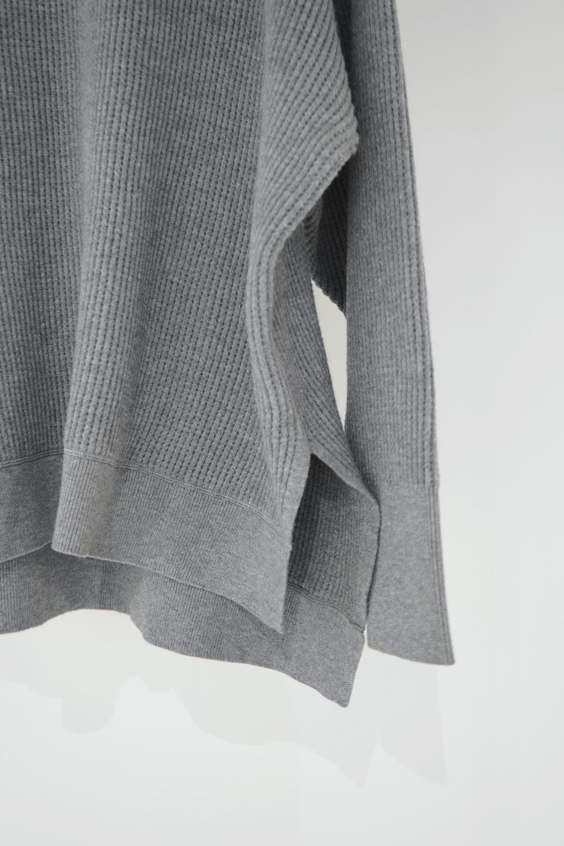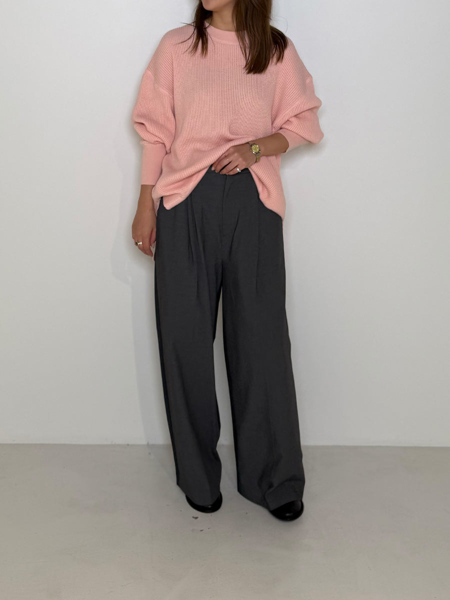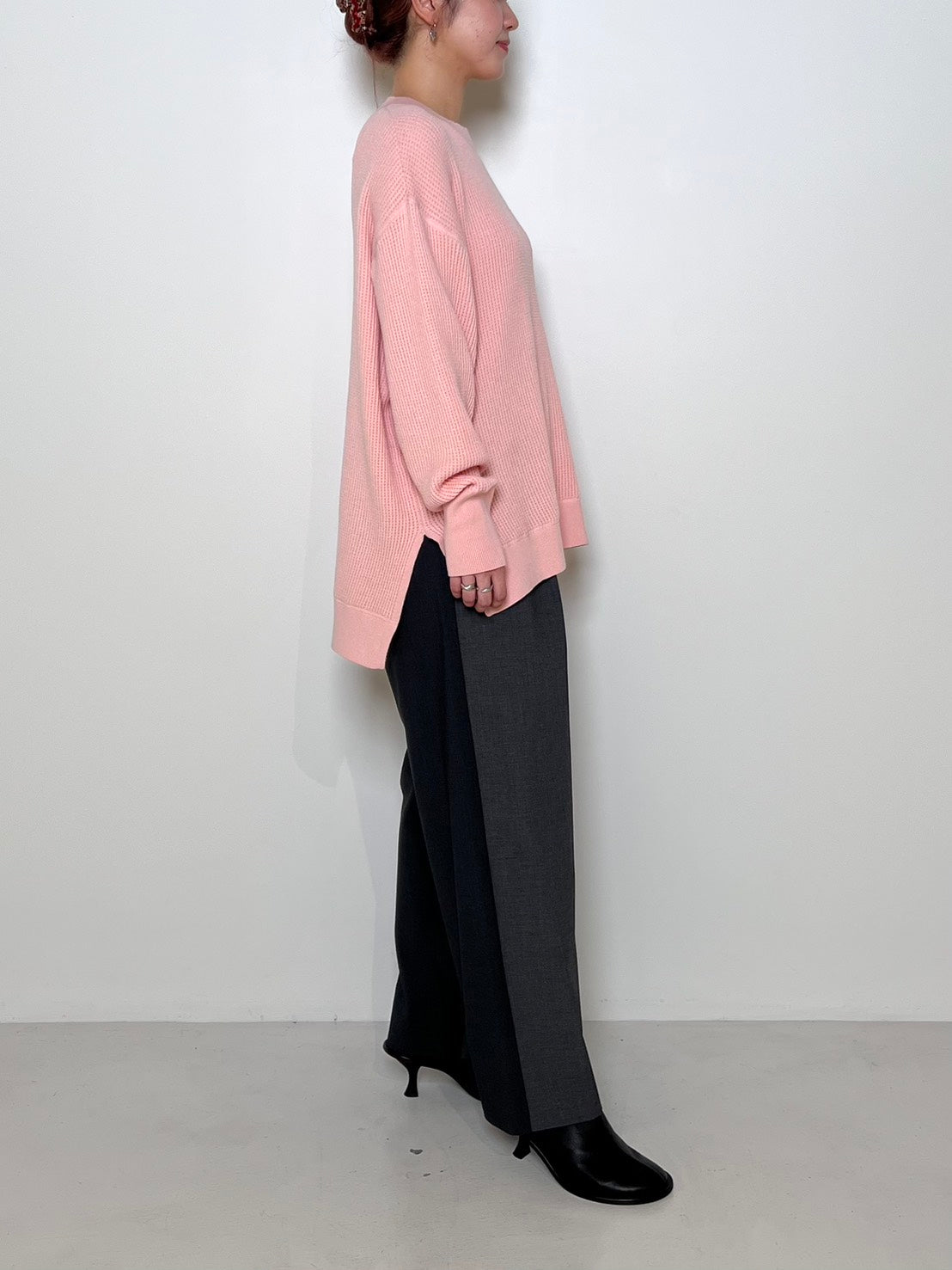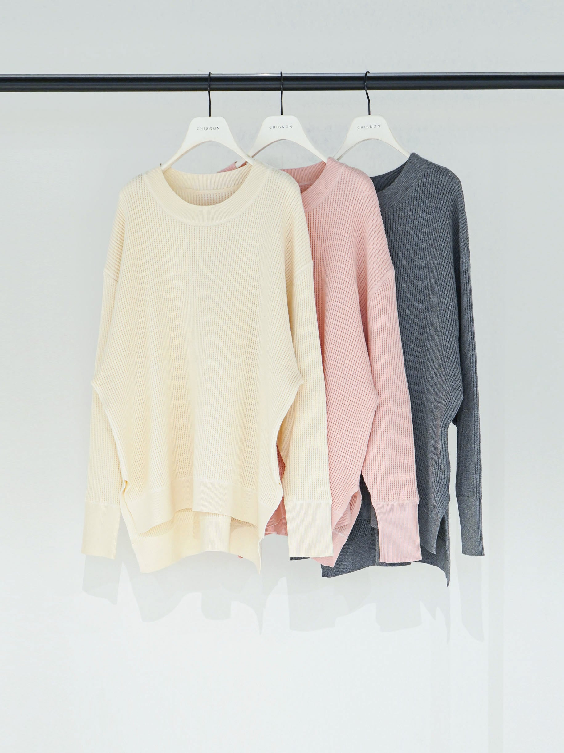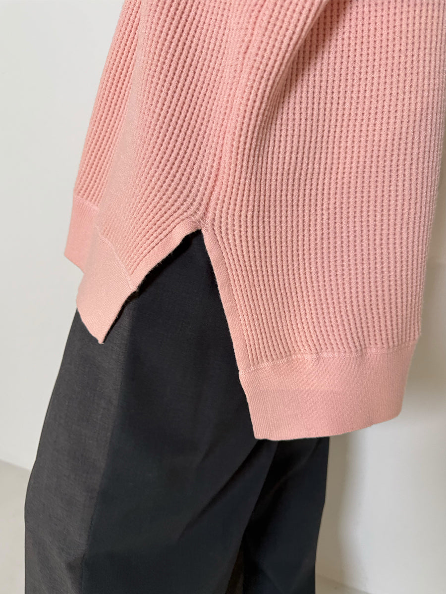 サーマル生地のようなワッフル組織の編地で作るトップスは、衿や袖などの切り替え位置に3本針のデザインステッチを施して、カットソーライクでカジュアルな雰囲気に仕上げました。
