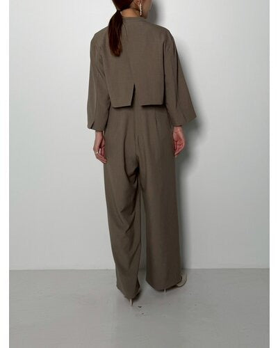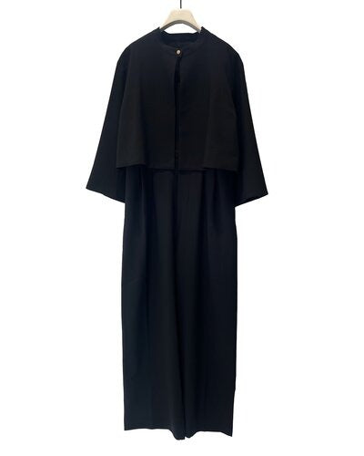 コンビネゾンは少しウエストの切り替えを上側に設定し、ショート丈のジャケットと合わせることでスタイルアップ効果を持たせました。