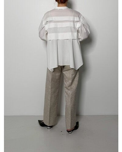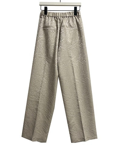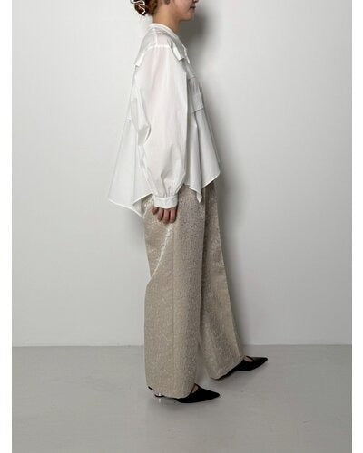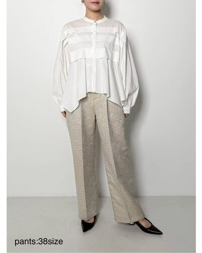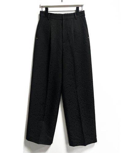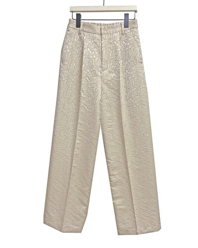 程よいはり感のある花柄のジャガード素材を使用したパンツ。すっきりとしたストレートシルエットのパンツは、タックからセンタープレスをいれることで、縦長効果でスタイアップの効果があります。