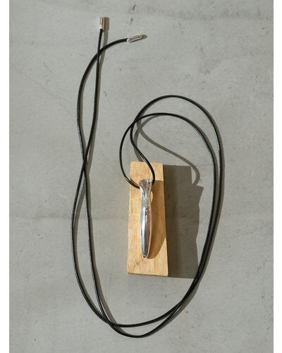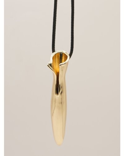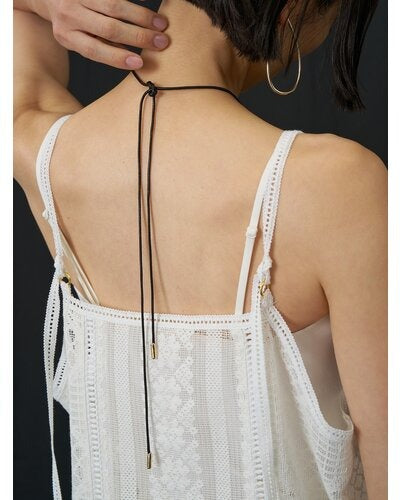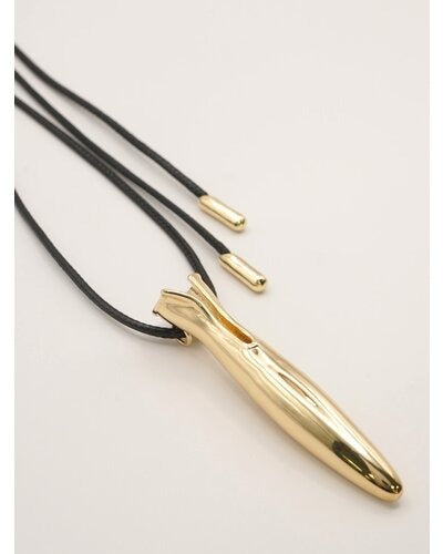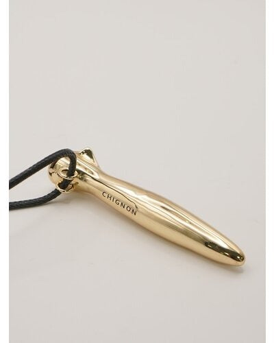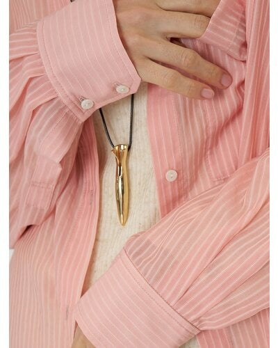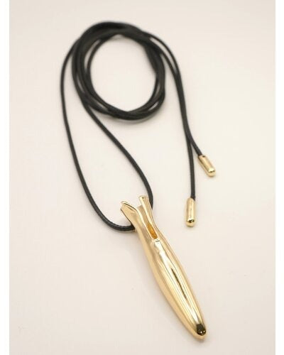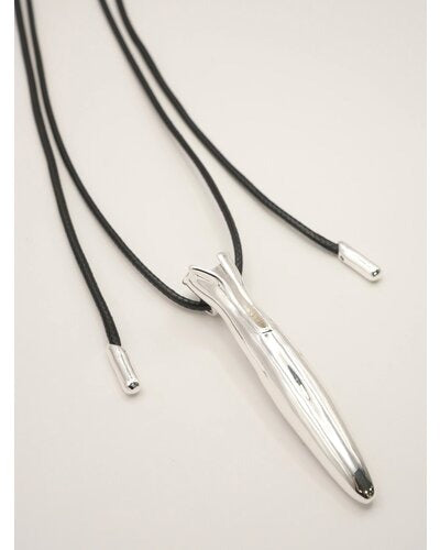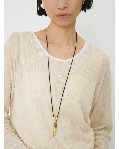 シャツの前開きスリットのようなデザインと花瓶のような長い筒が特徴的なコードタイプのロングネックレス。有機的なモチーフと黒コードの組み合わせは、いつものコーデにプラスするだけでさらりとかっこよく決まります。コード先端にはCHIGNONオリジナルキャップを施しており、結び目で長さ調節が可能なのでトップスに合わせてお好きな位置に着けられます。また、モチーフは取り外し可能なのでコードのみチョーカー風に使用することも可能となっております。