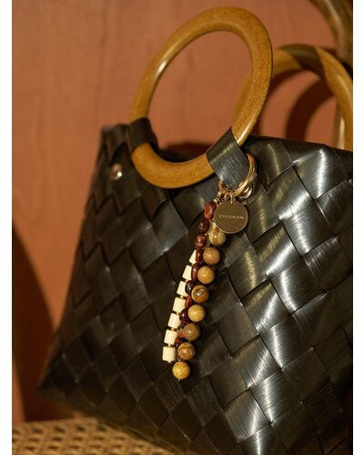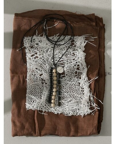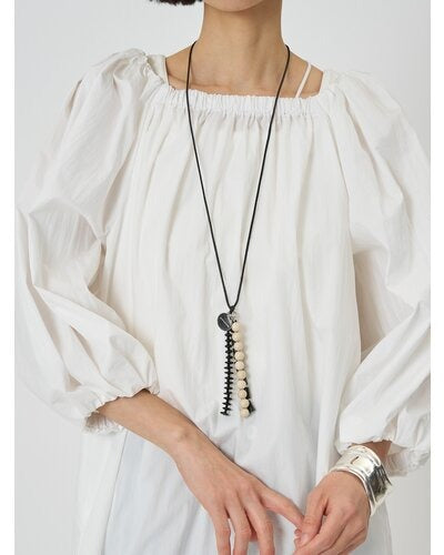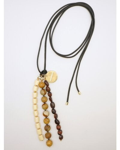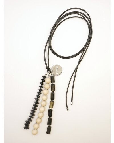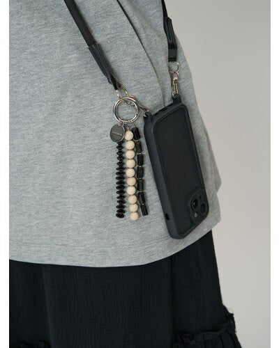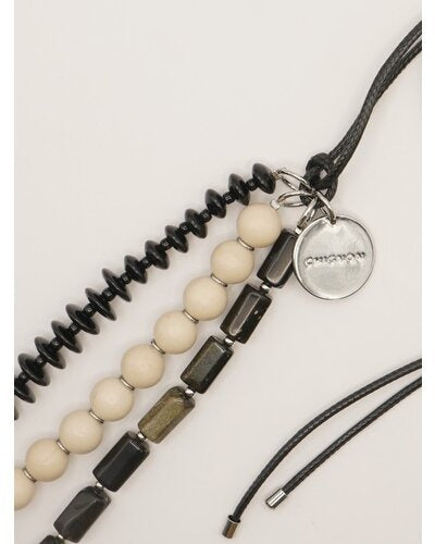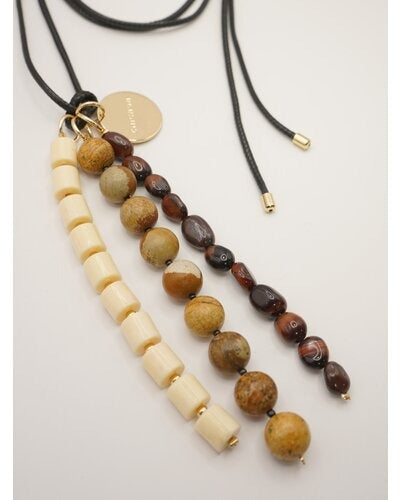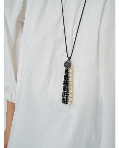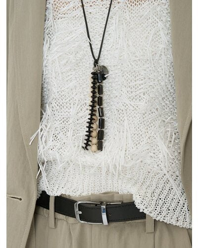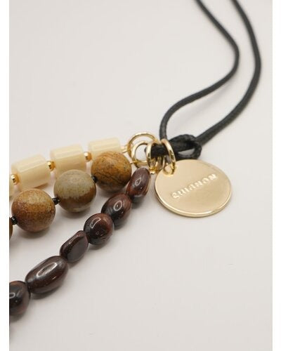 大人配色の組み合わせが目を惹く天然石ネックレスはコードを取るとバッグチャームとして使えるのも嬉しいポイントです。天然石は間にビーズや丸カンを挟め間隔を出すことでより洗練されたデザインに仕上げています。結び目で長さ調節が可能なのでトップスに合わせてお好きな位置に着けられます。また、モチーフは取り外し可能なのでコードのみチョーカー風に使用することも可能となっております。丸プレートには「CHIGNON」の刻印入り。