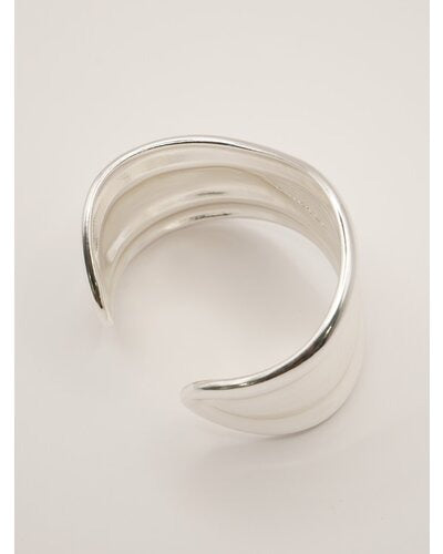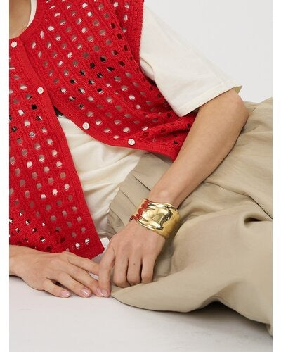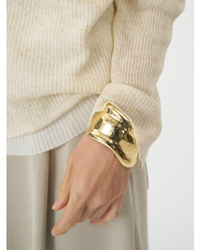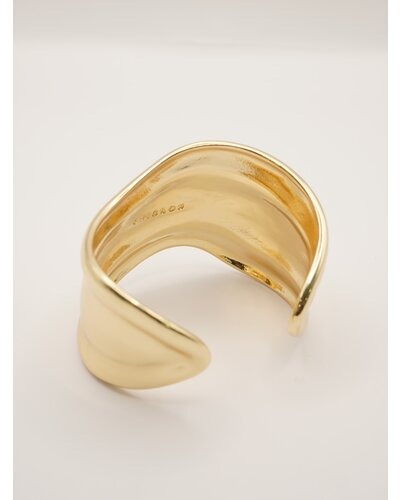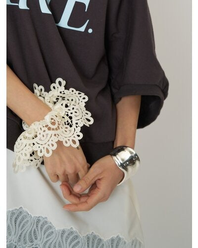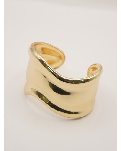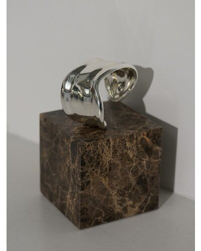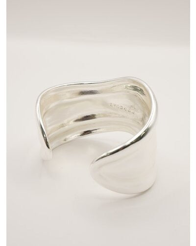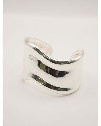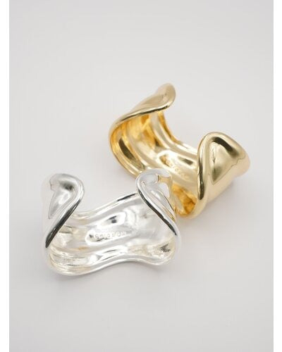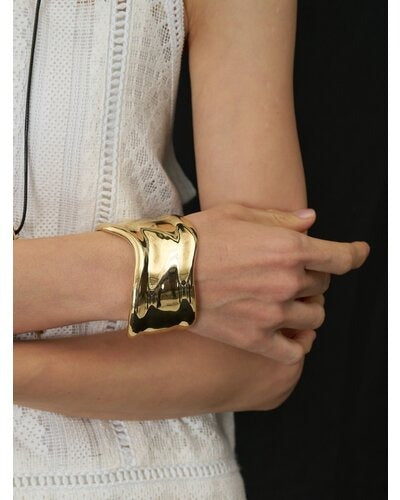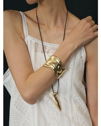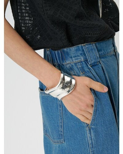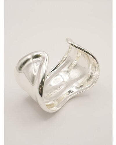 ボリュームのある幅広バングルは、滑らかなウェーブラインとやや厚みのあるメンズライクな重量感が特徴的で、1本着けるだけでシンプルなカジュアルコーデにアクセントを与えてくれます。素肌にそのままつけるのはもちろん、シャツやロンTの上から包み込むようにつけるとぐっとこなれ感が増します!また、ワイドバングルなので手元の細見え効果も◎
