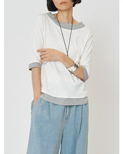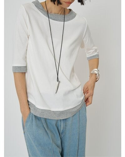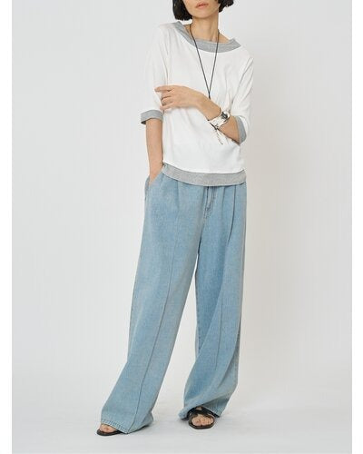 からだに沿いながらも適度にゆとりあるサイズ感と、肘のかくれる5分袖丈が、上半身を華奢に女性らしく見せてくれます。衿ぐりも開け過ぎず、ヘルシーにまとめました。