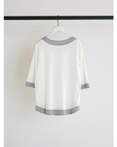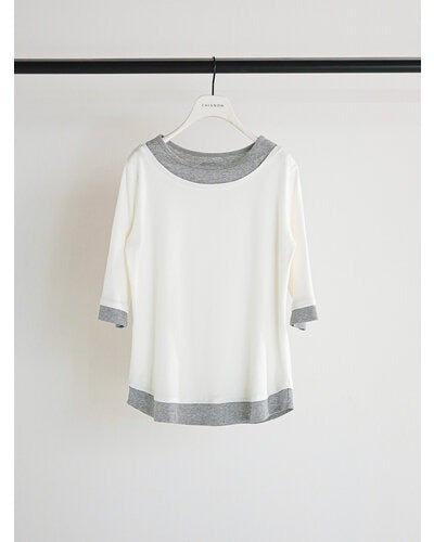 衿ぐり、袖口、裾の配色部分が効いた、シンプルながら印象的なテレコプルオーバー。配色部分は表地同素材の色違いを使用しています。