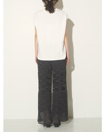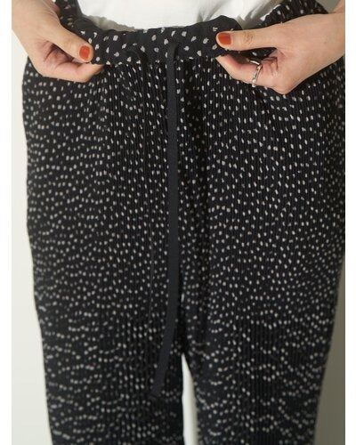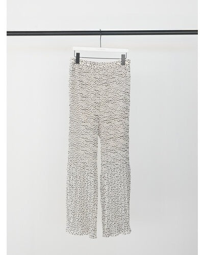 ドットプリントが入ったサッカー素材に2種類のプリーツをかけた、表情豊かなプリントパンツ。