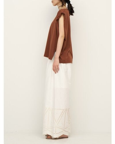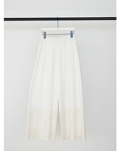 裾に施されたカットワーク刺繍が印象的なストレートワイドパンツです。