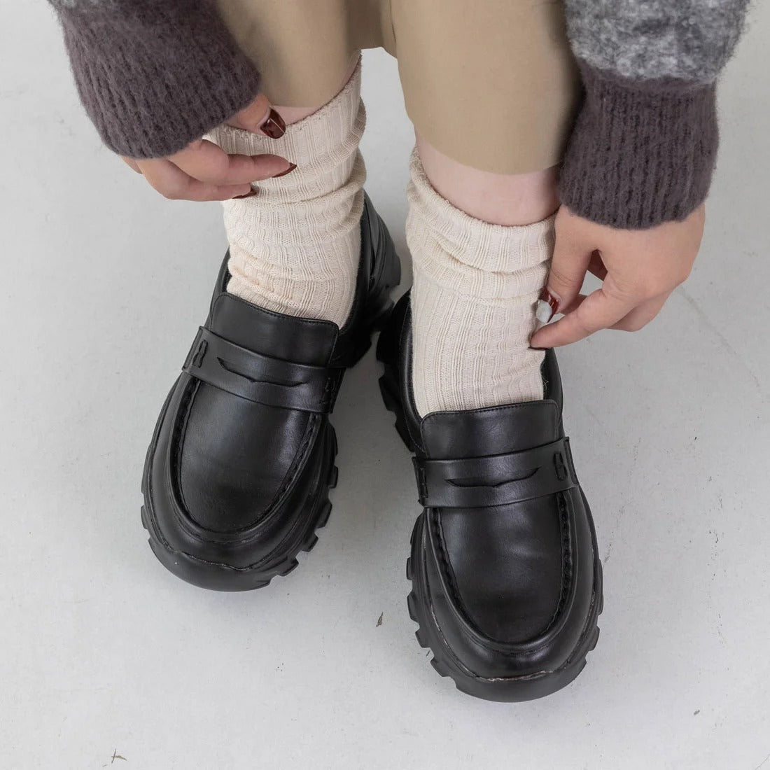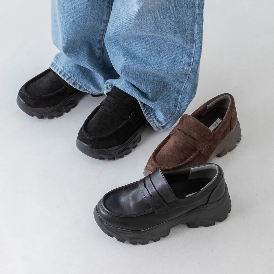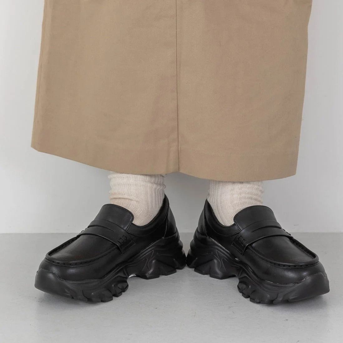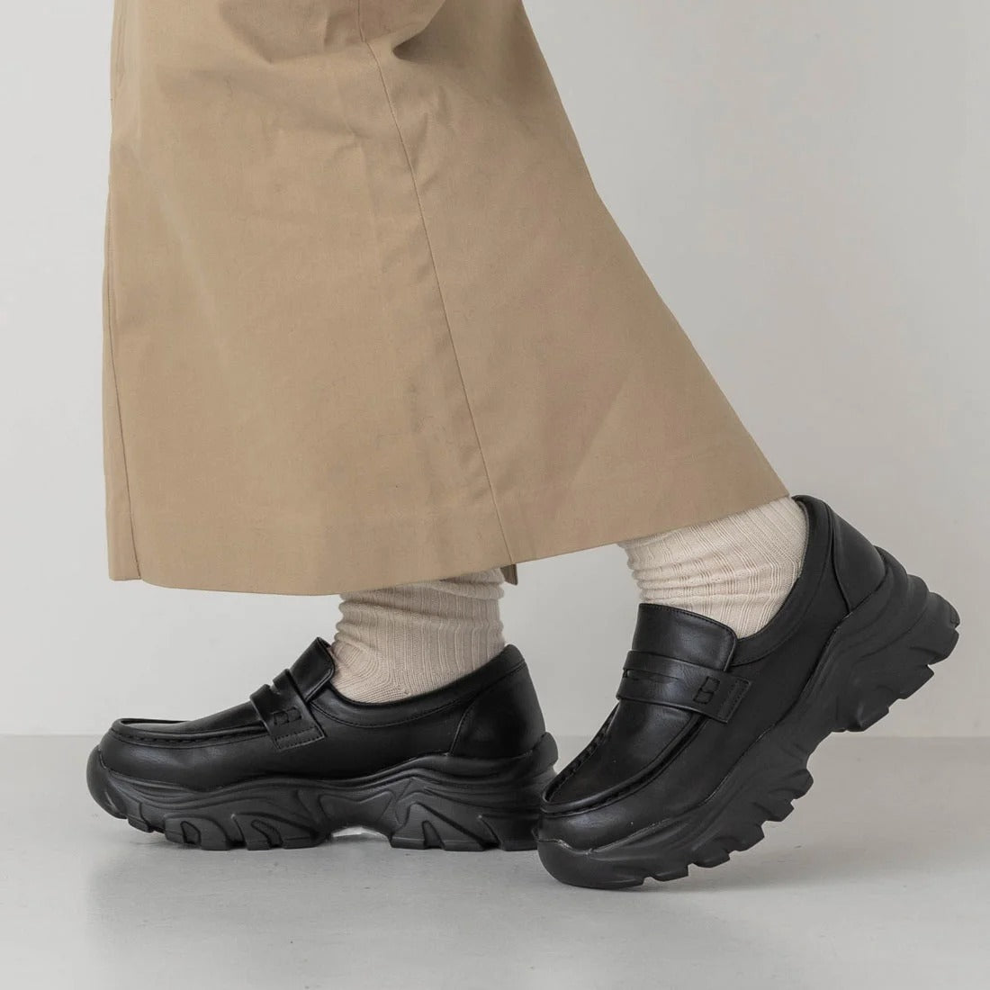 ボリューム感のあるソールと掛け合わせた厚底ローファー。旬のボリュームソールは履くだけでスタイルアップが叶います!もっちりしたしっかりと厚みのある中敷きは、足に優しくストレスフリーな履き心地。超軽量で傾斜がほとんどない厚底ソールは、デイリー使いはもちろん、たくさん歩く日やお出かけにもおすすめ◎どんなコーディネートにもハマる万能アイテム!