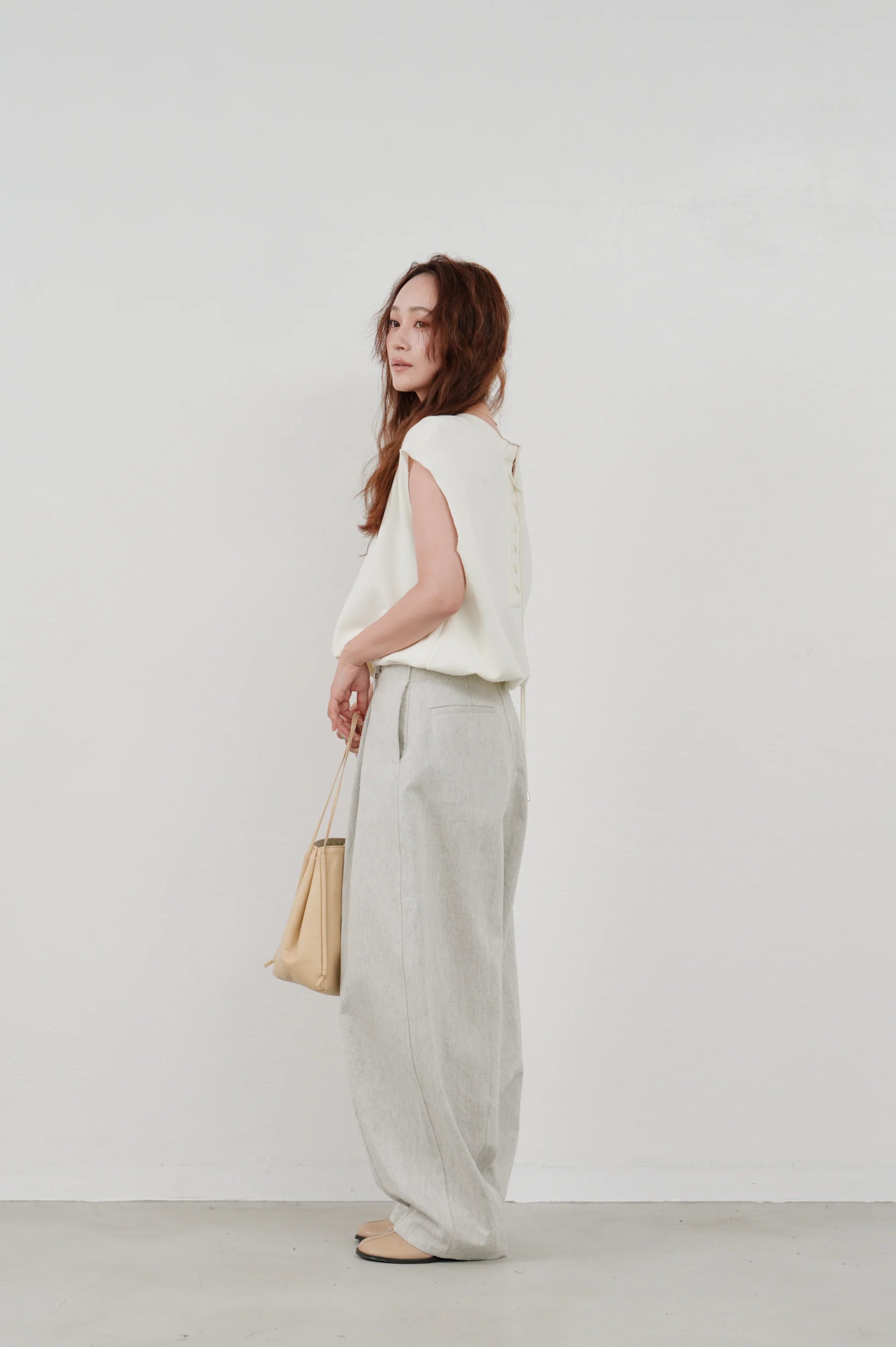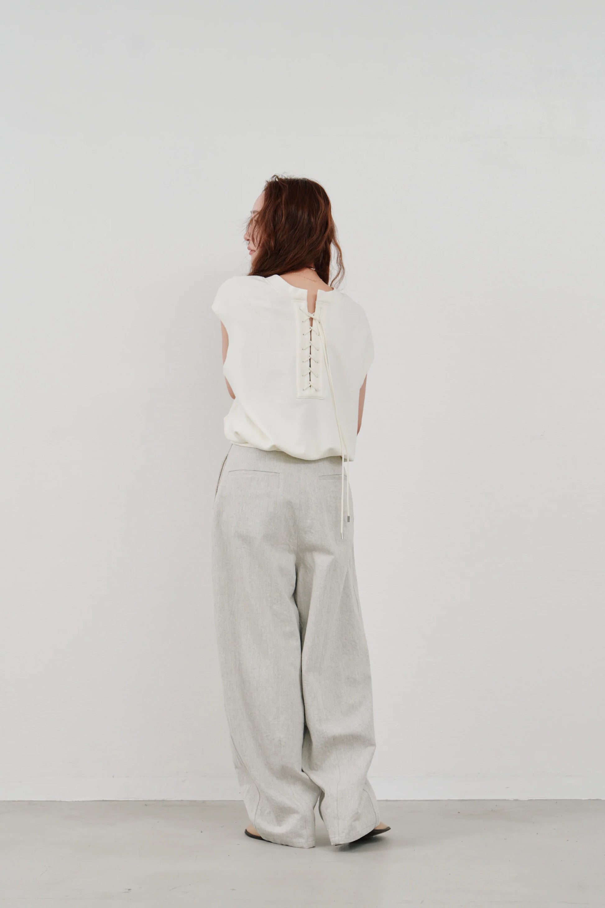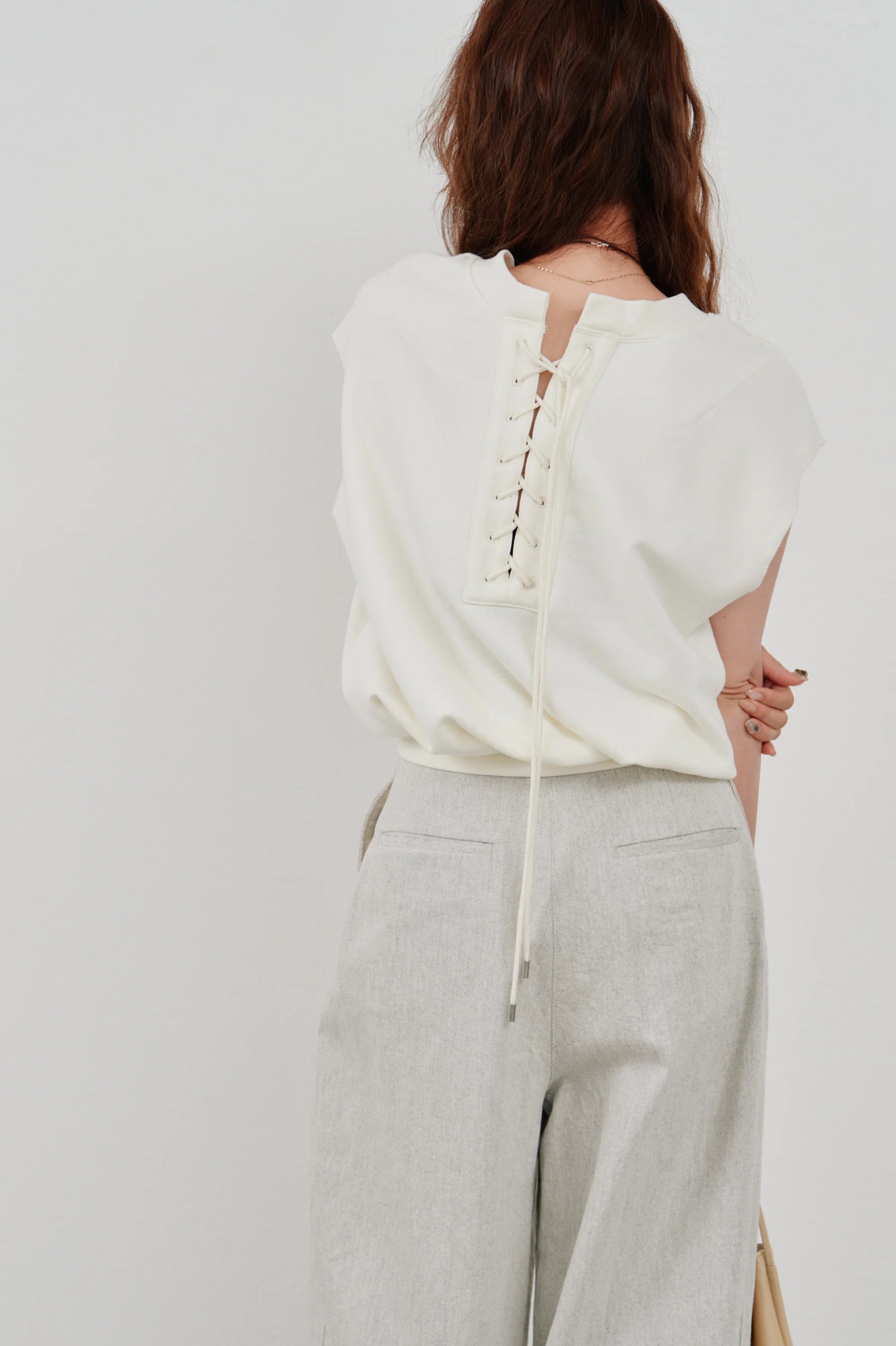 後ろ姿にアクセントを添える、レースアップ仕様のノースリーブトップス。