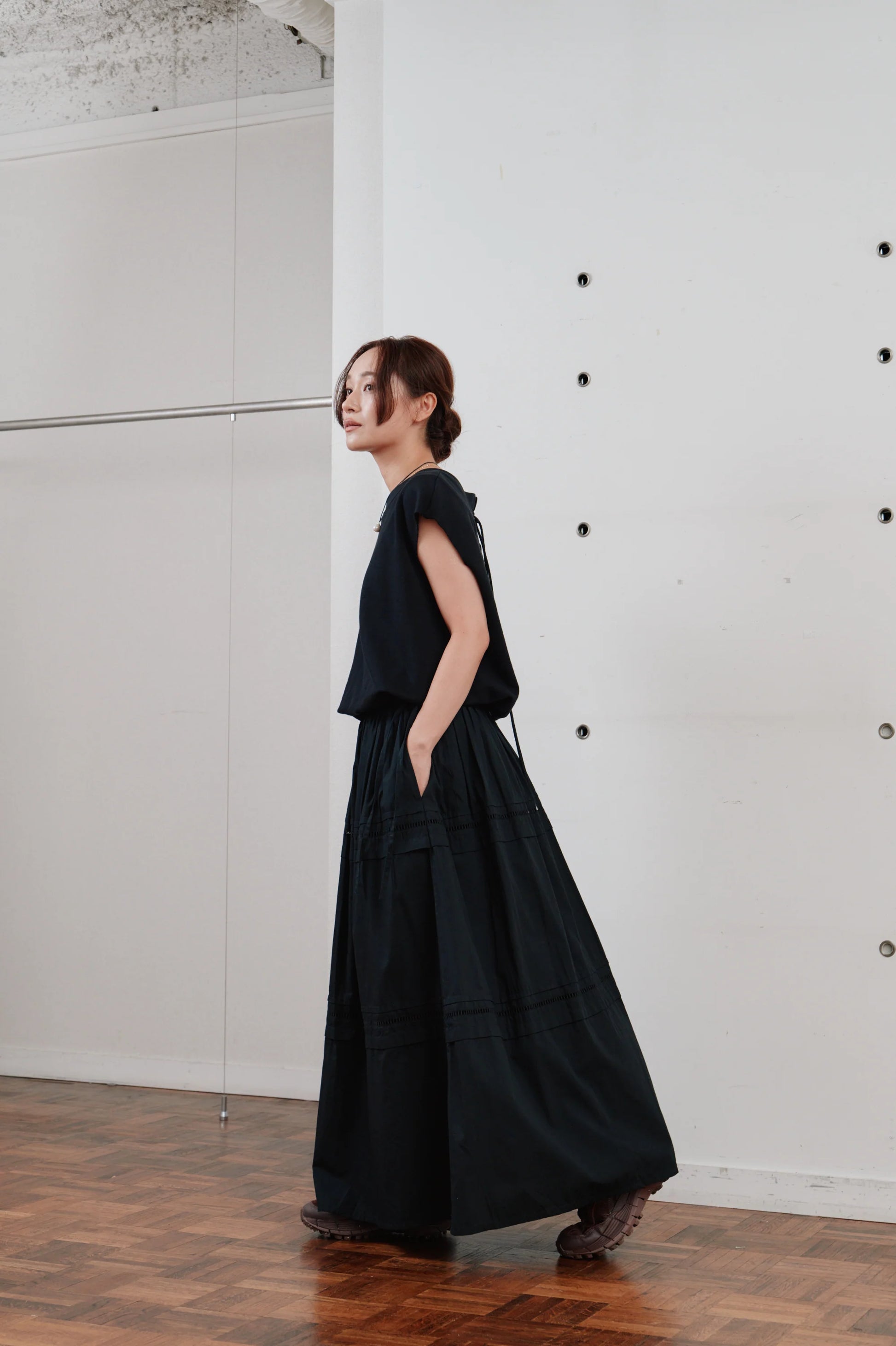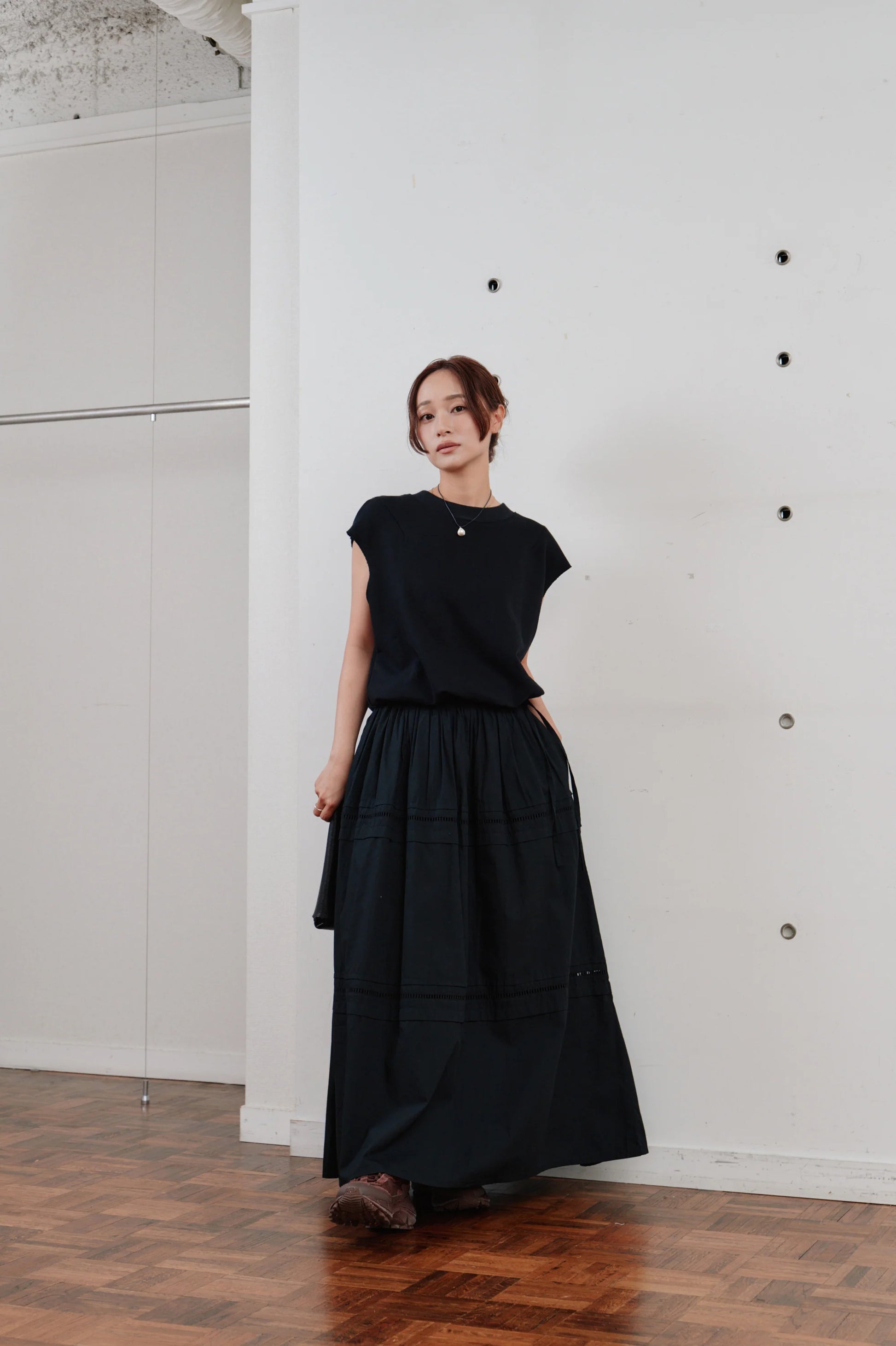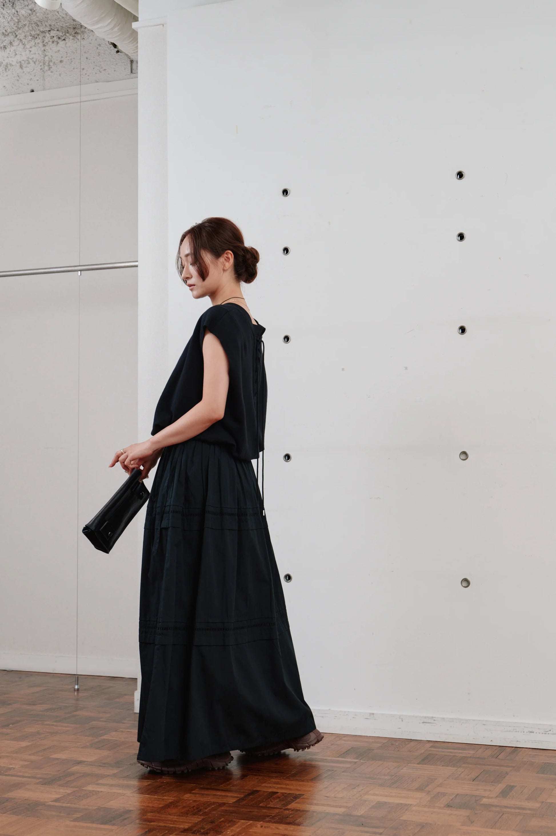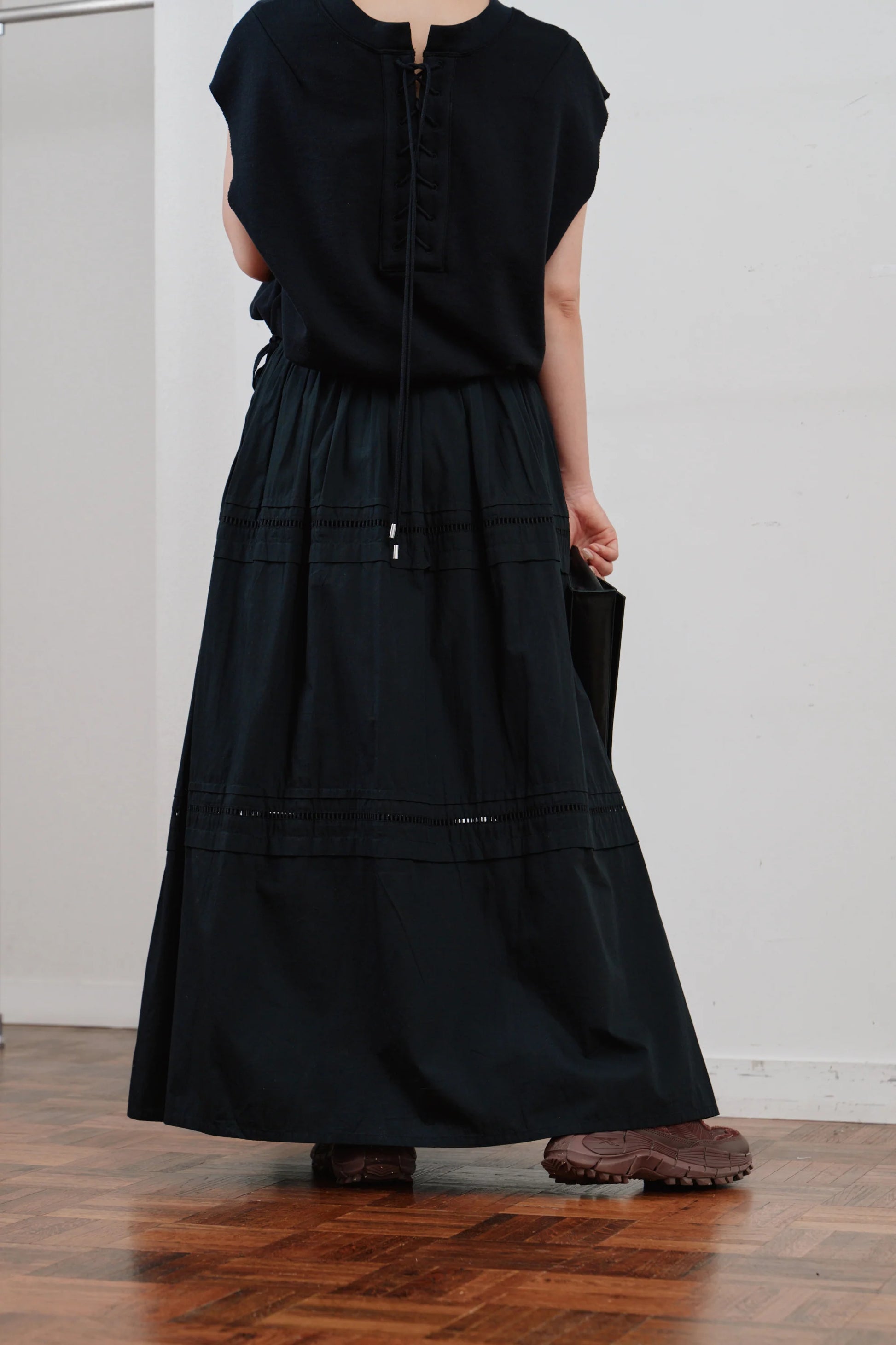 後ろ姿にアクセントを添える、レースアップ仕様のノースリーブトップス。
