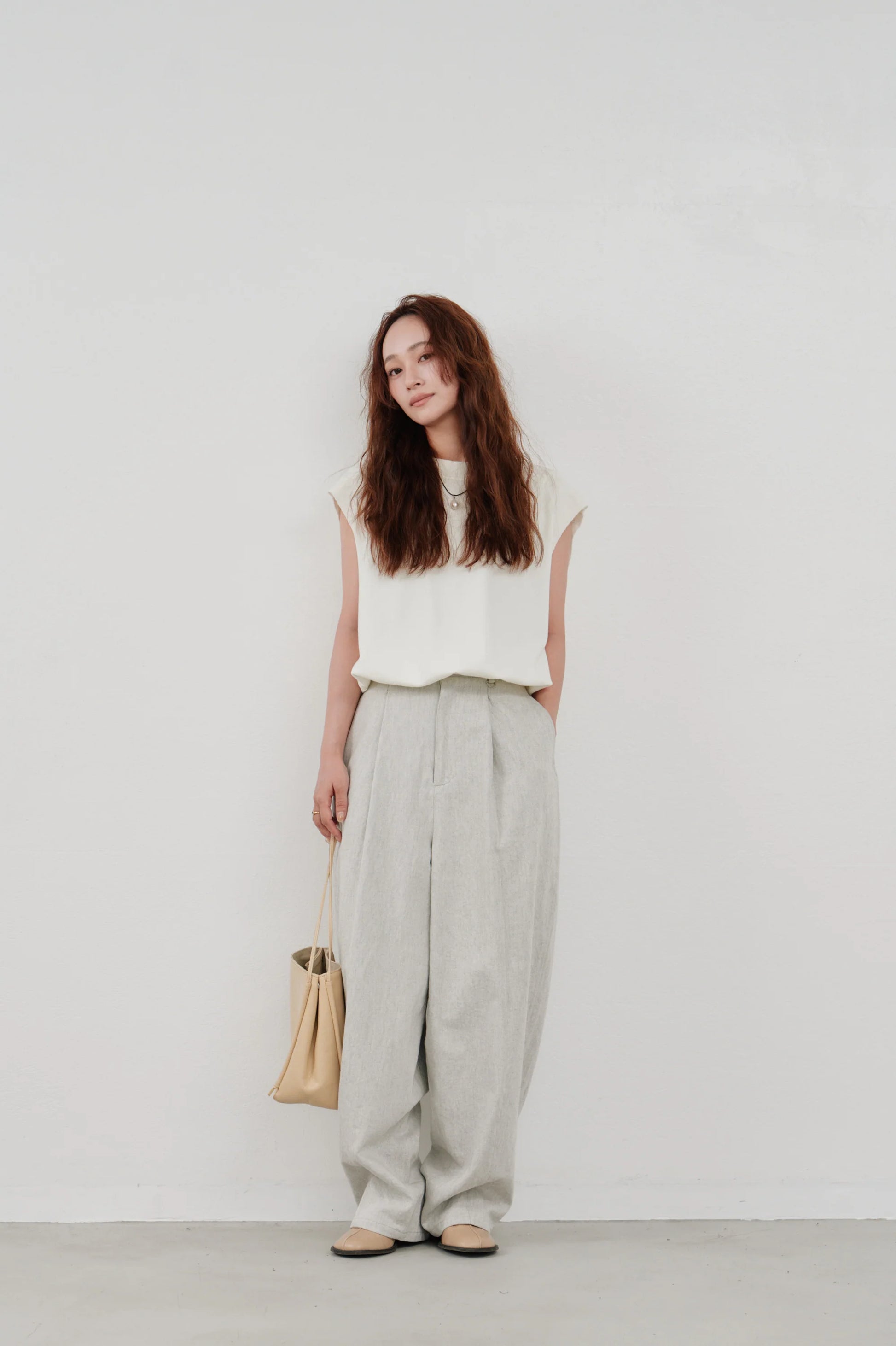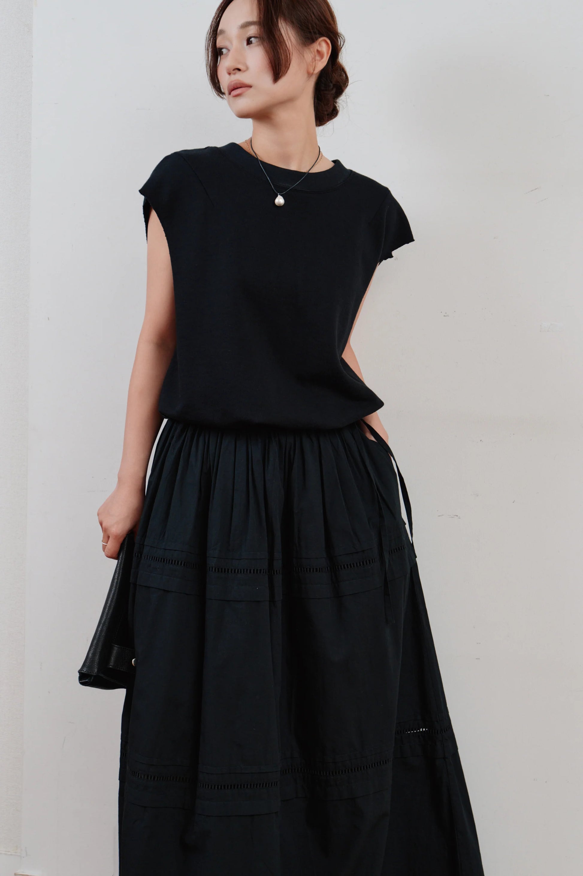 肩をほんのり覆うスリーブラインは、さりげない華奢見えが叶う設計に。