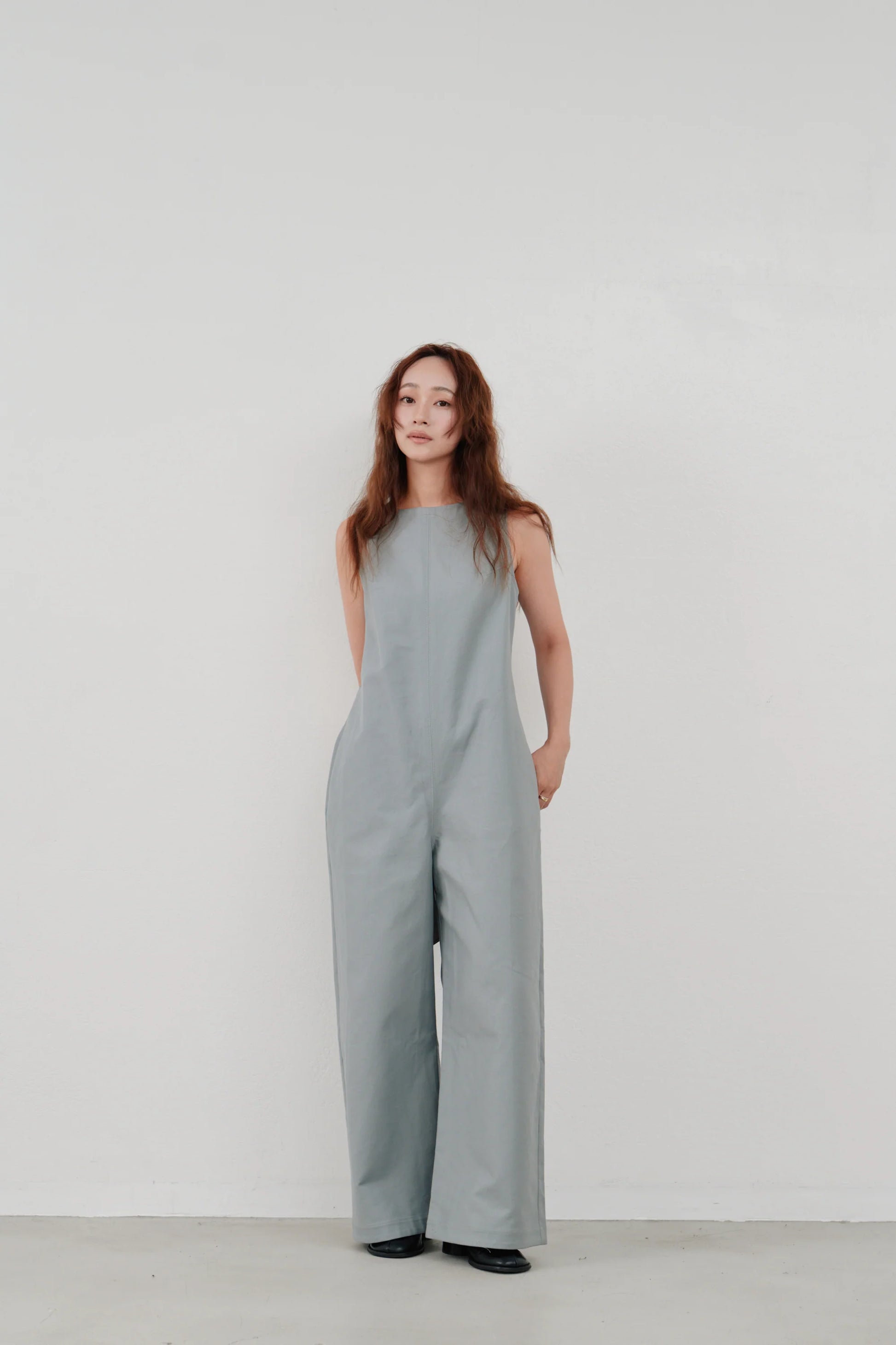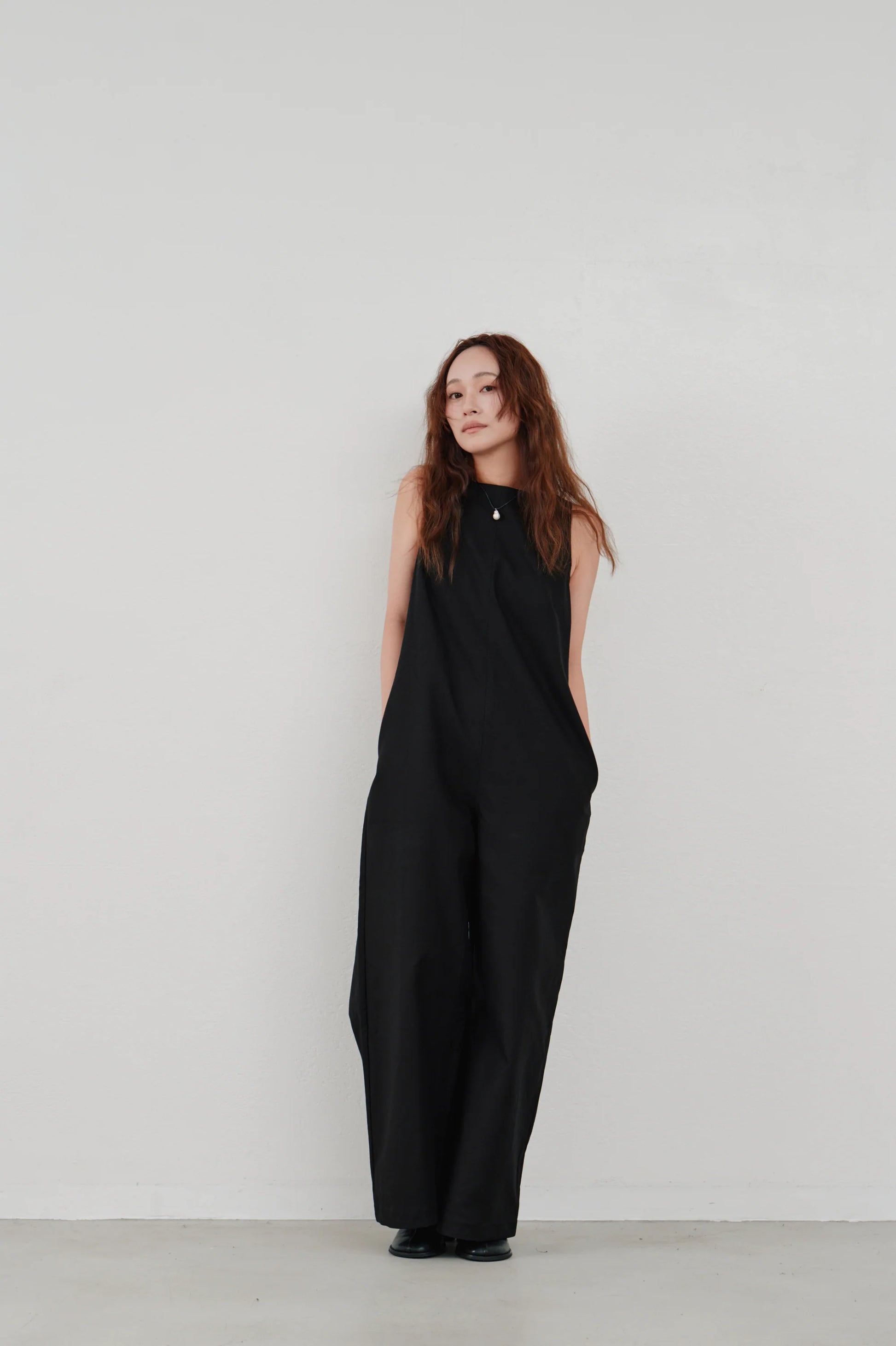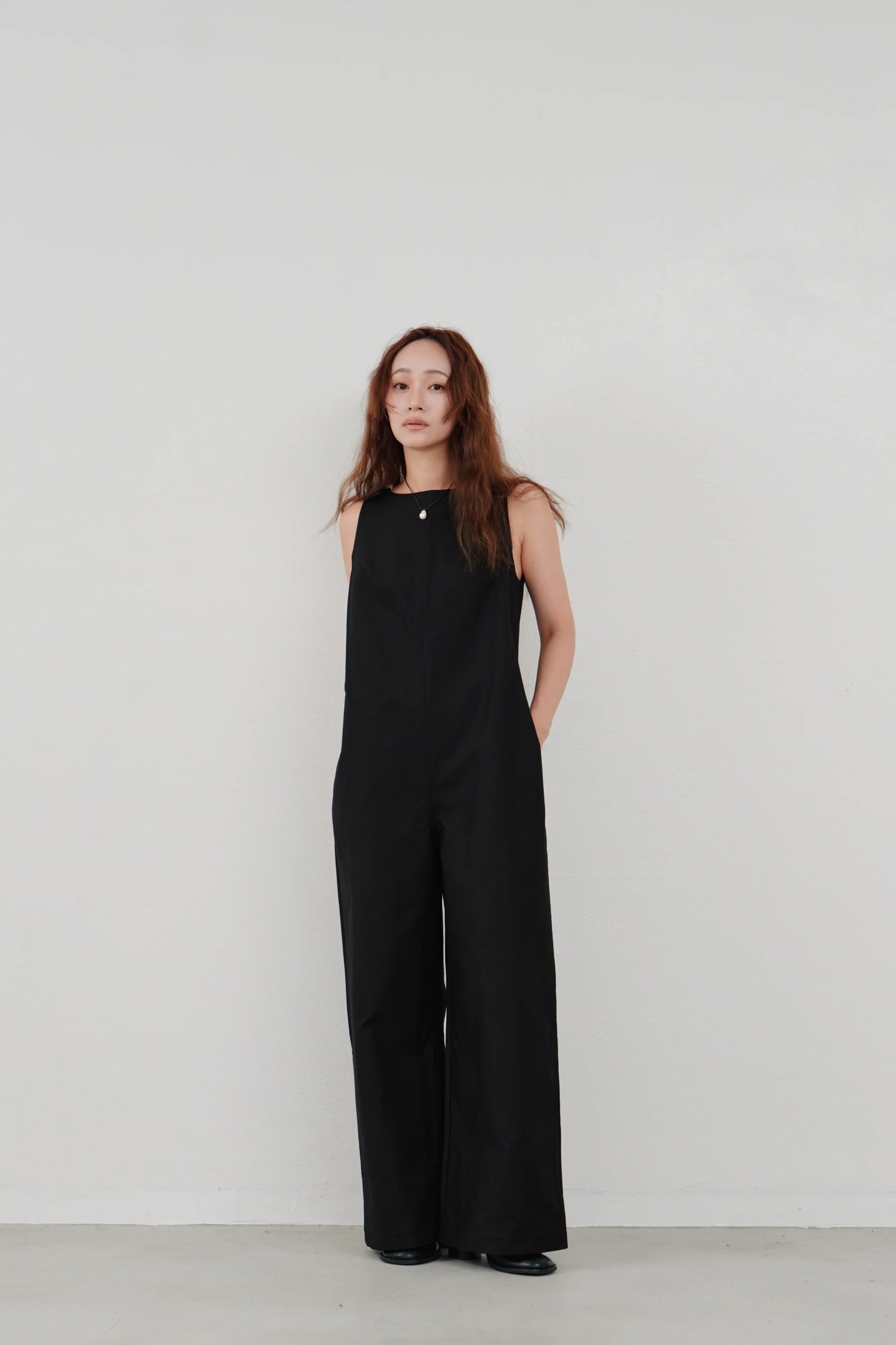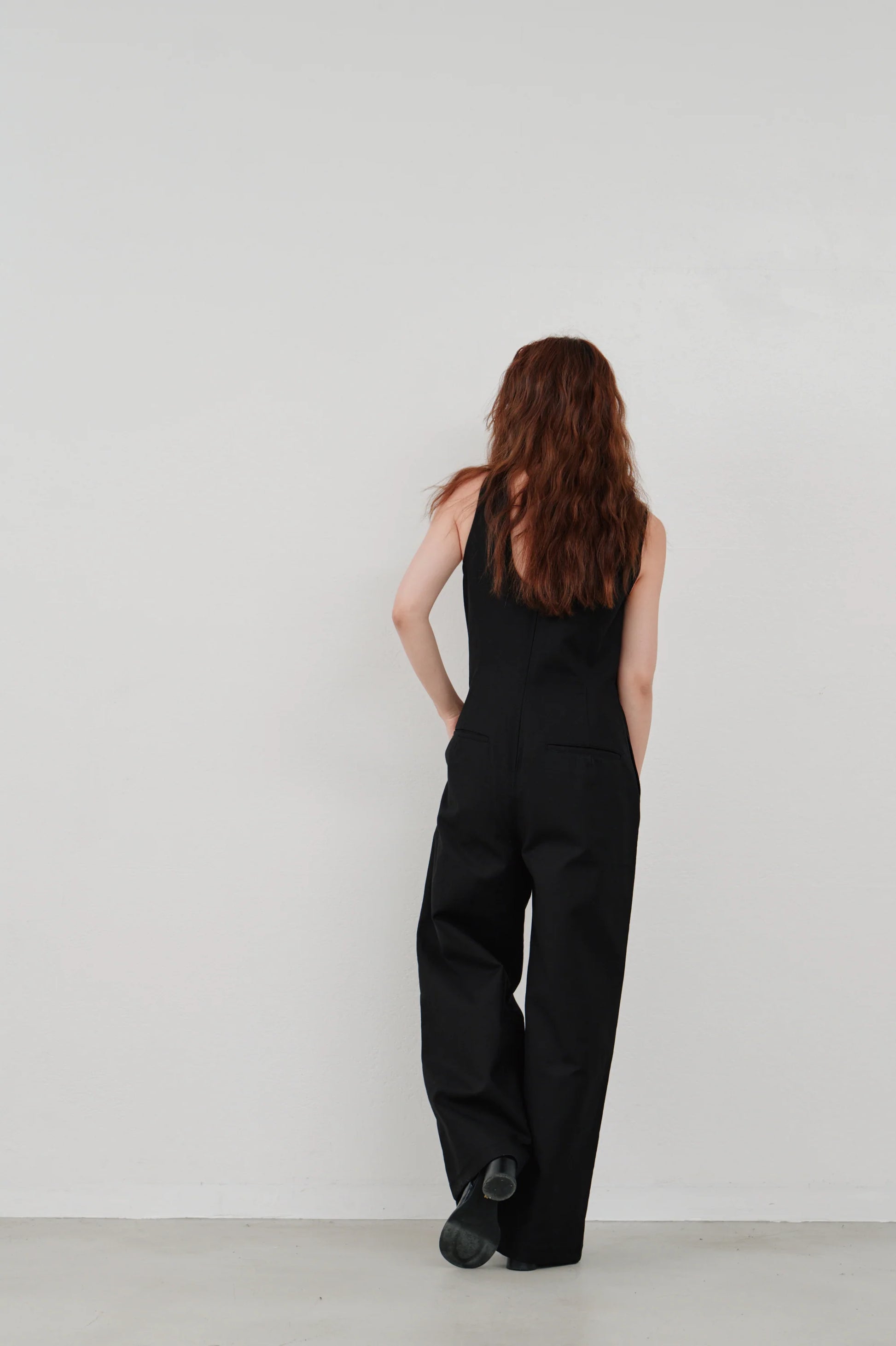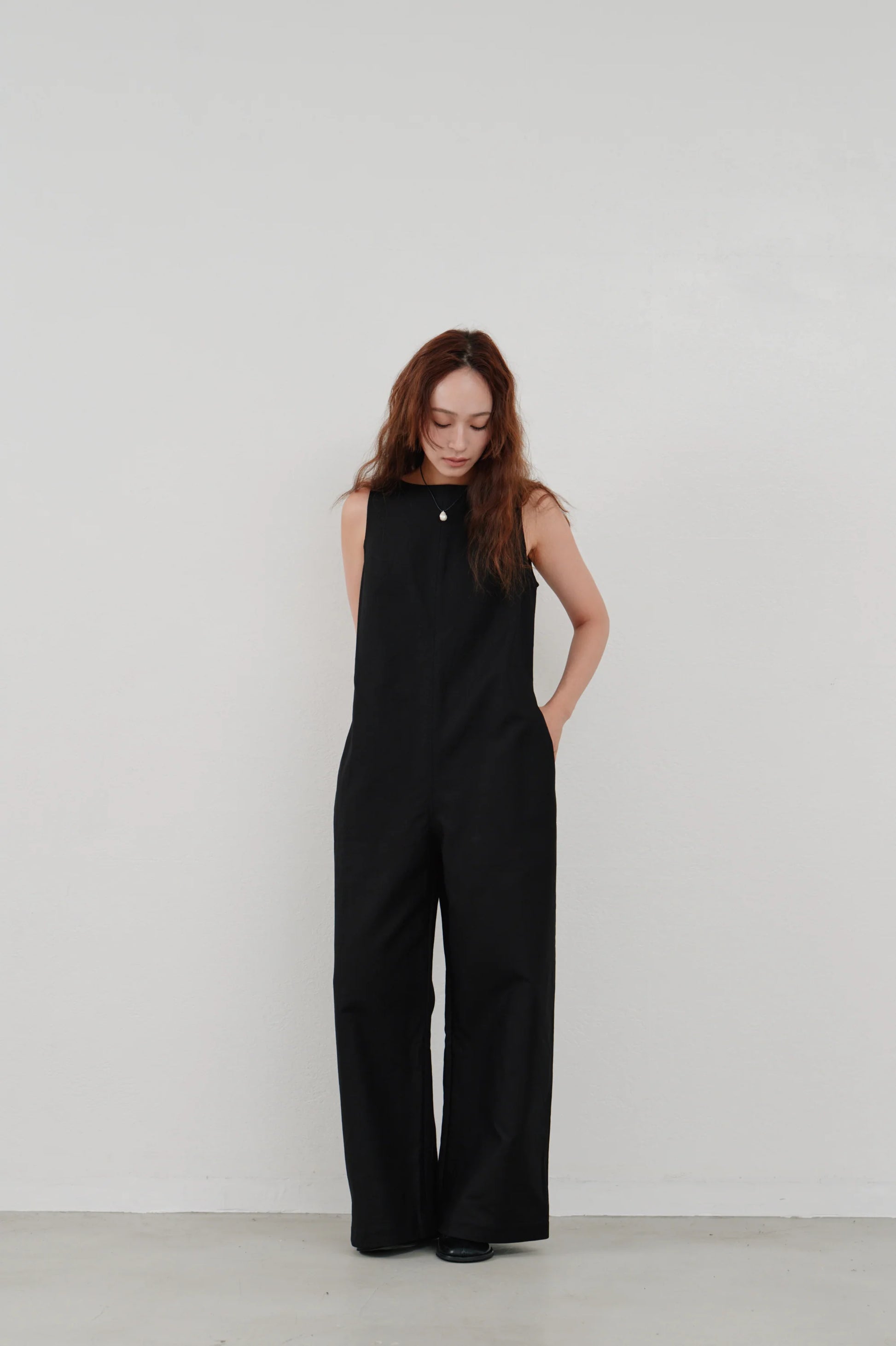 直線的な切替とすっきりとしたIラインが魅力の、大人のジャンプスーツ。