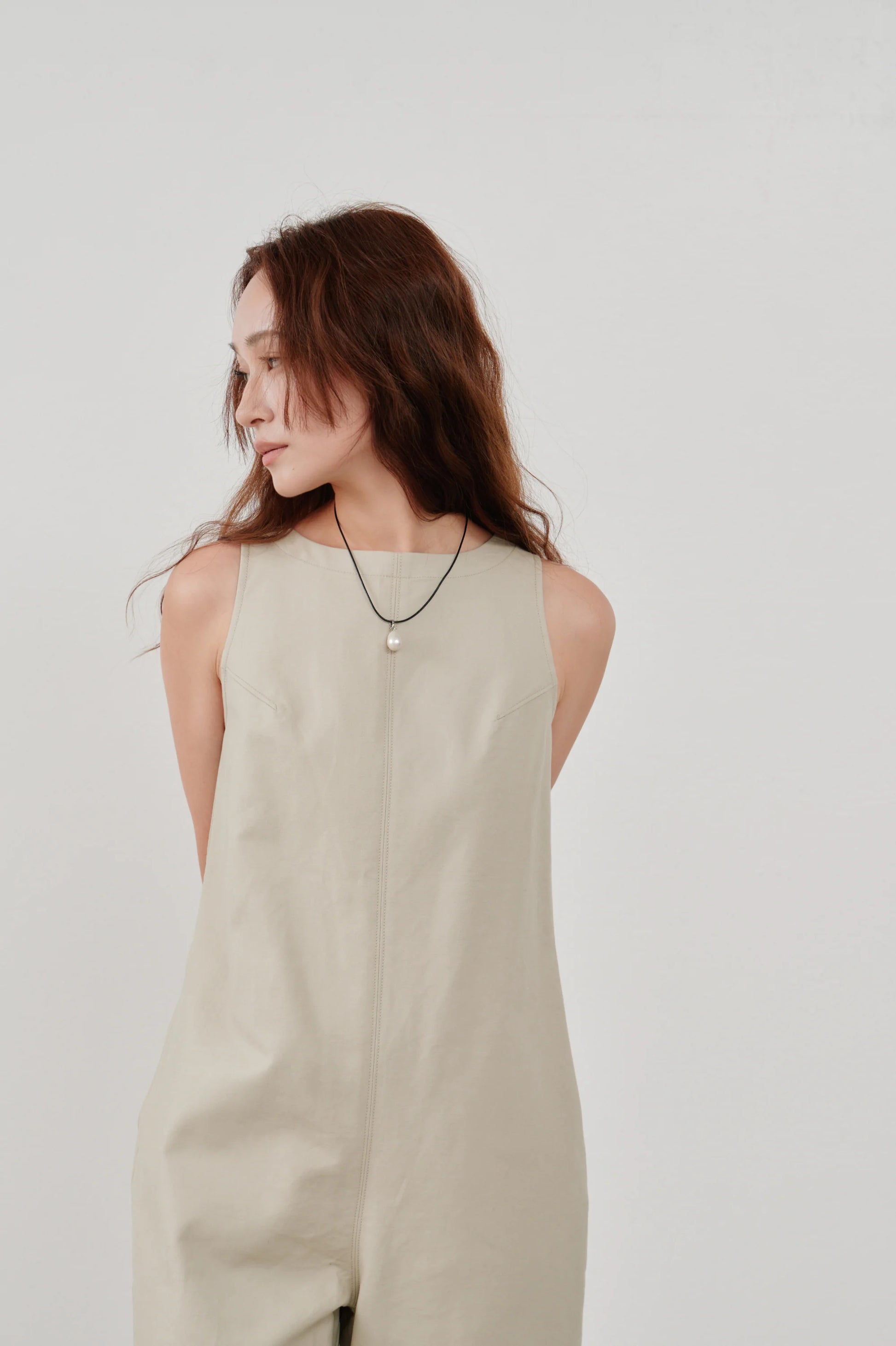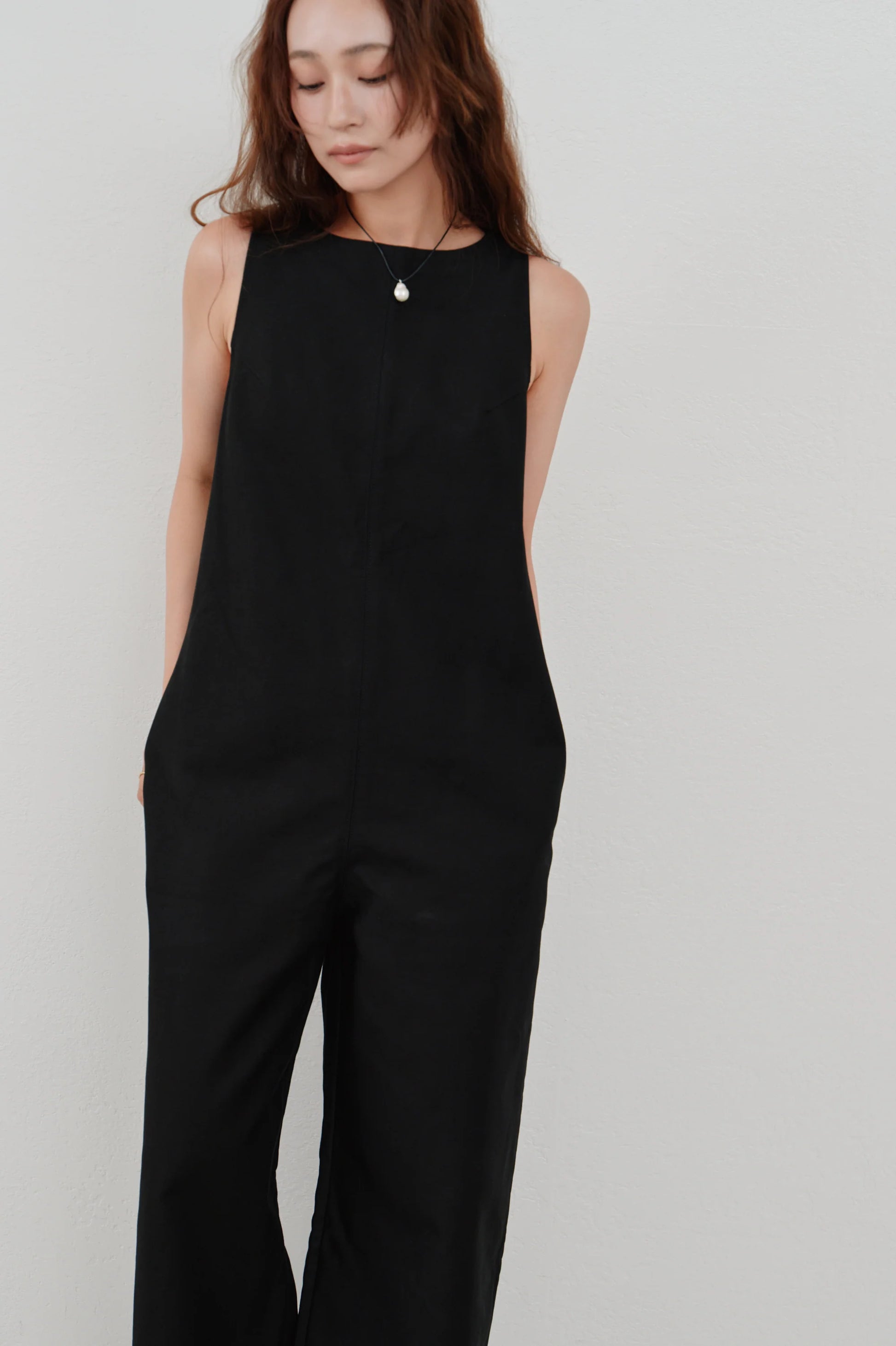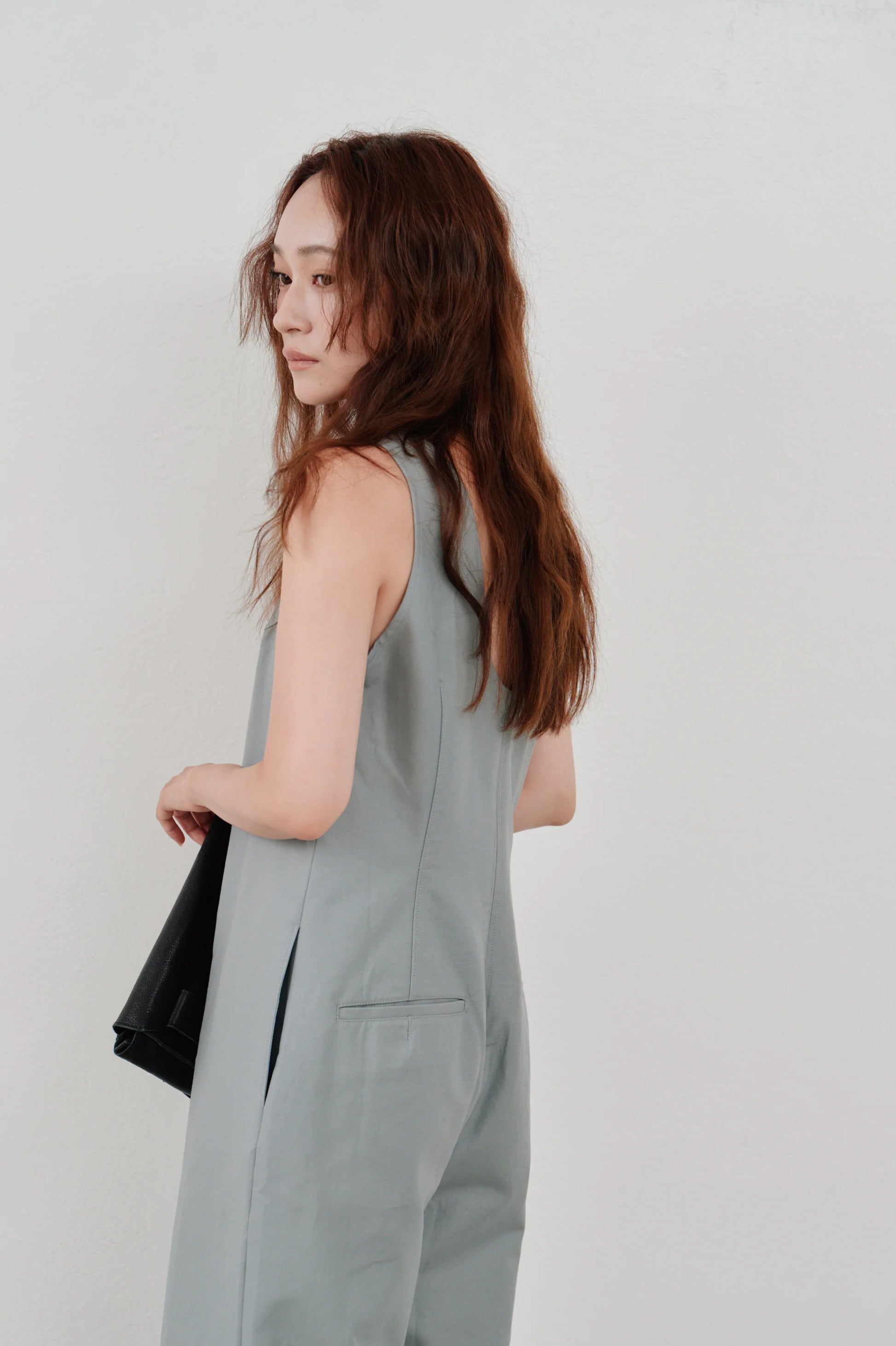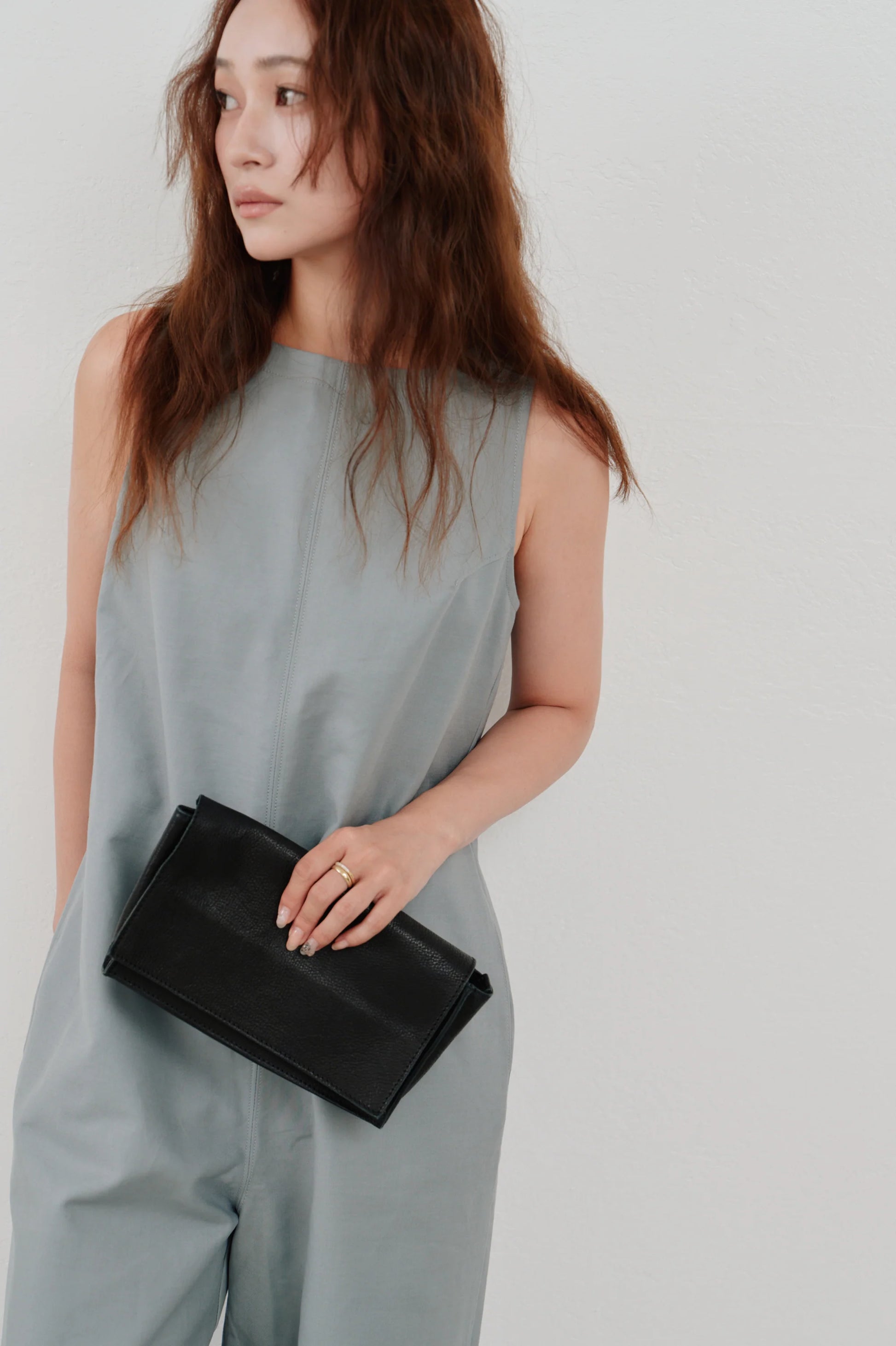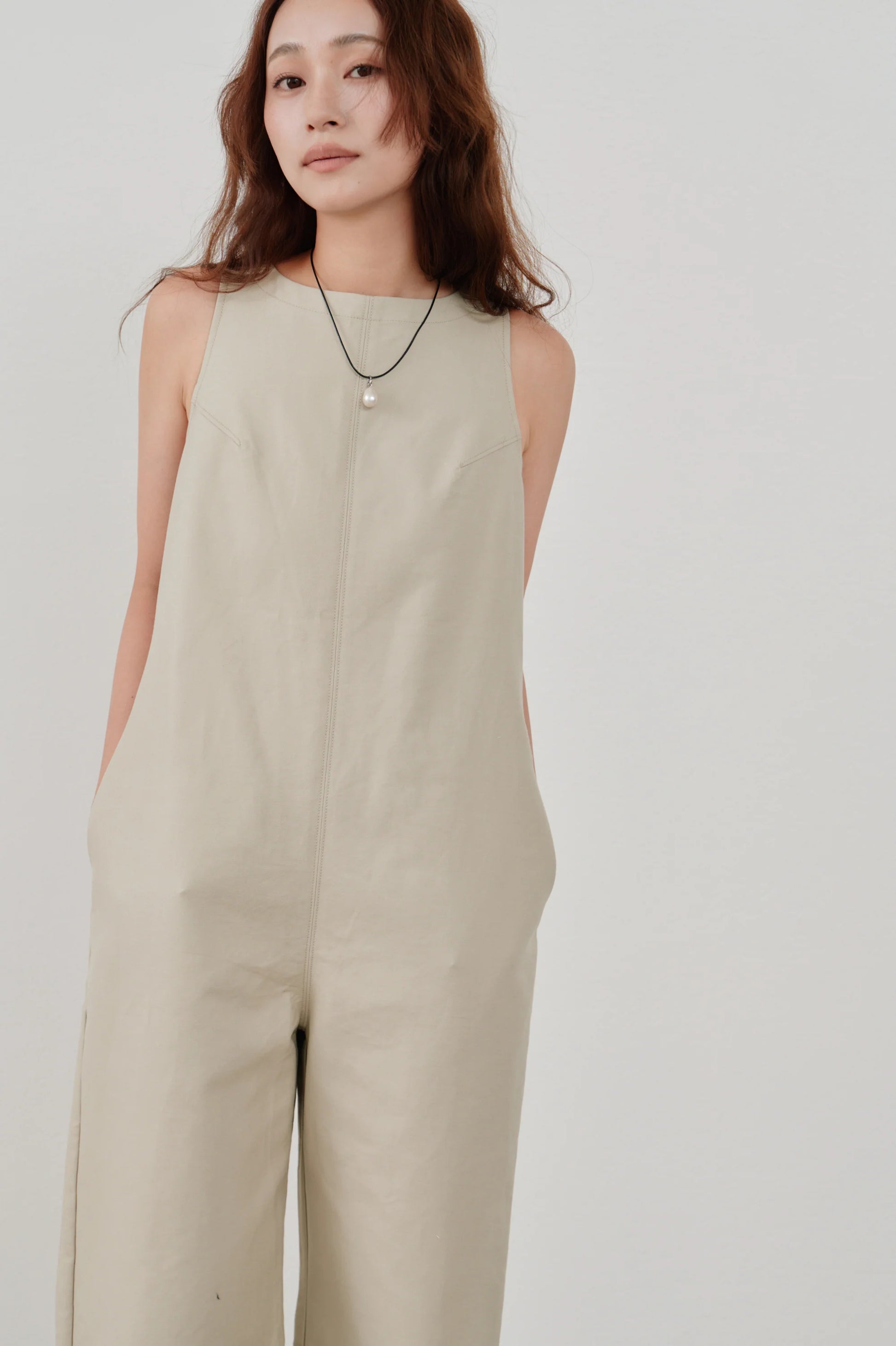 直線的な切替とすっきりとしたIラインが魅力の、大人のジャンプスーツ。