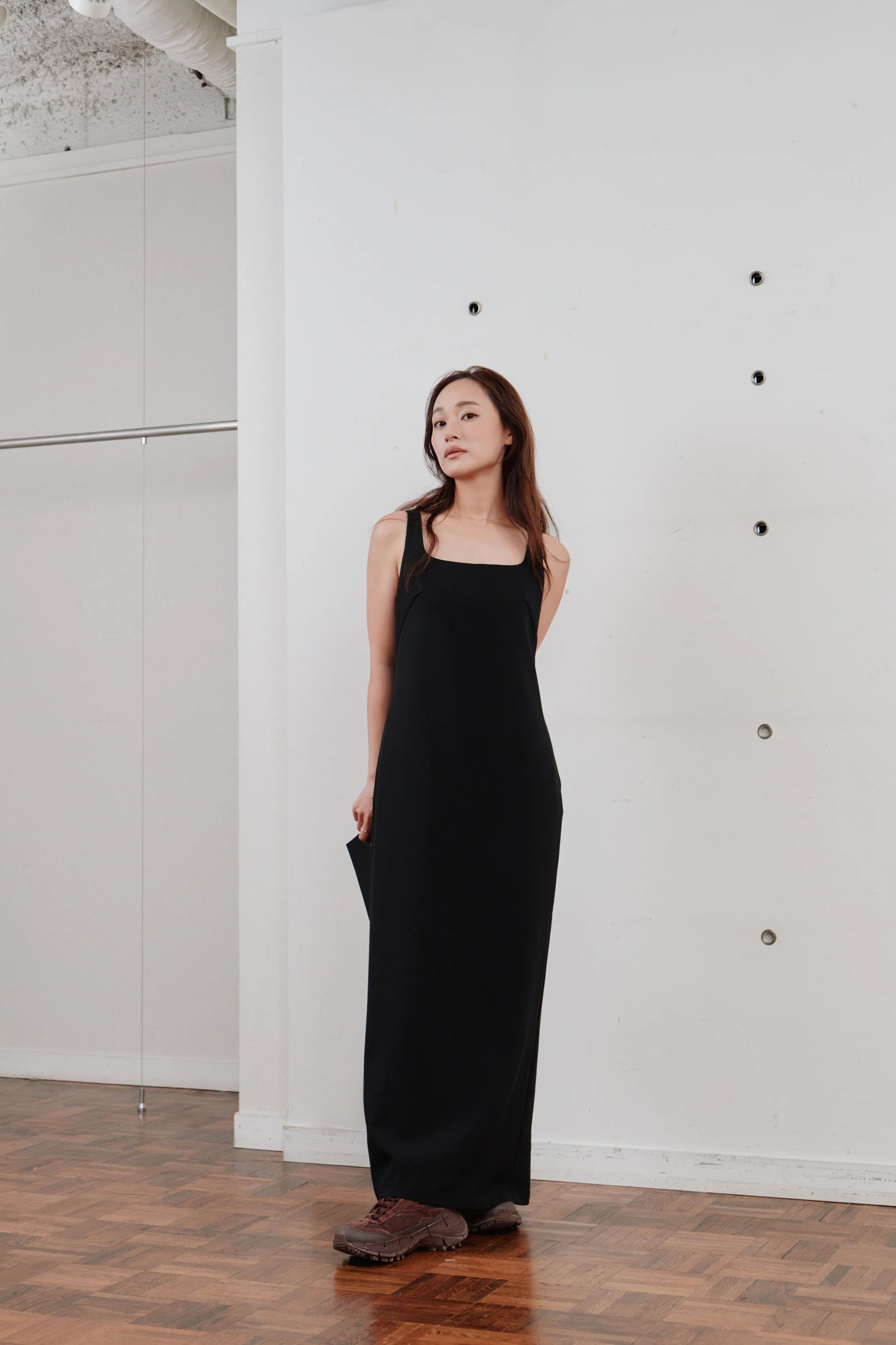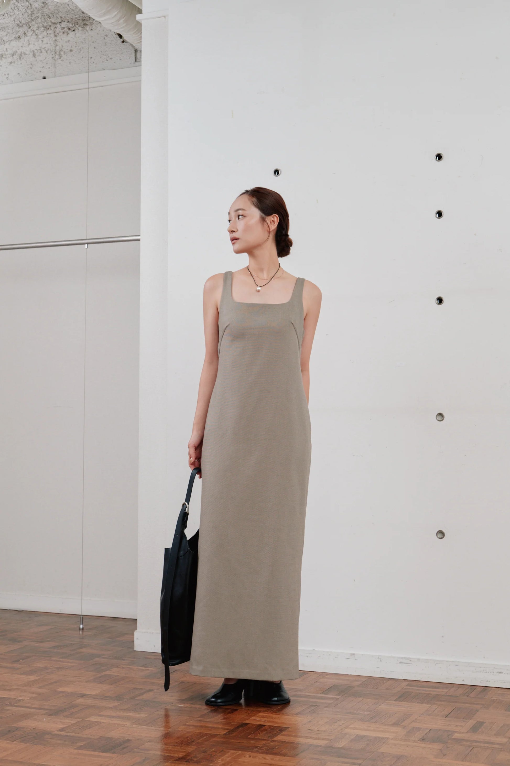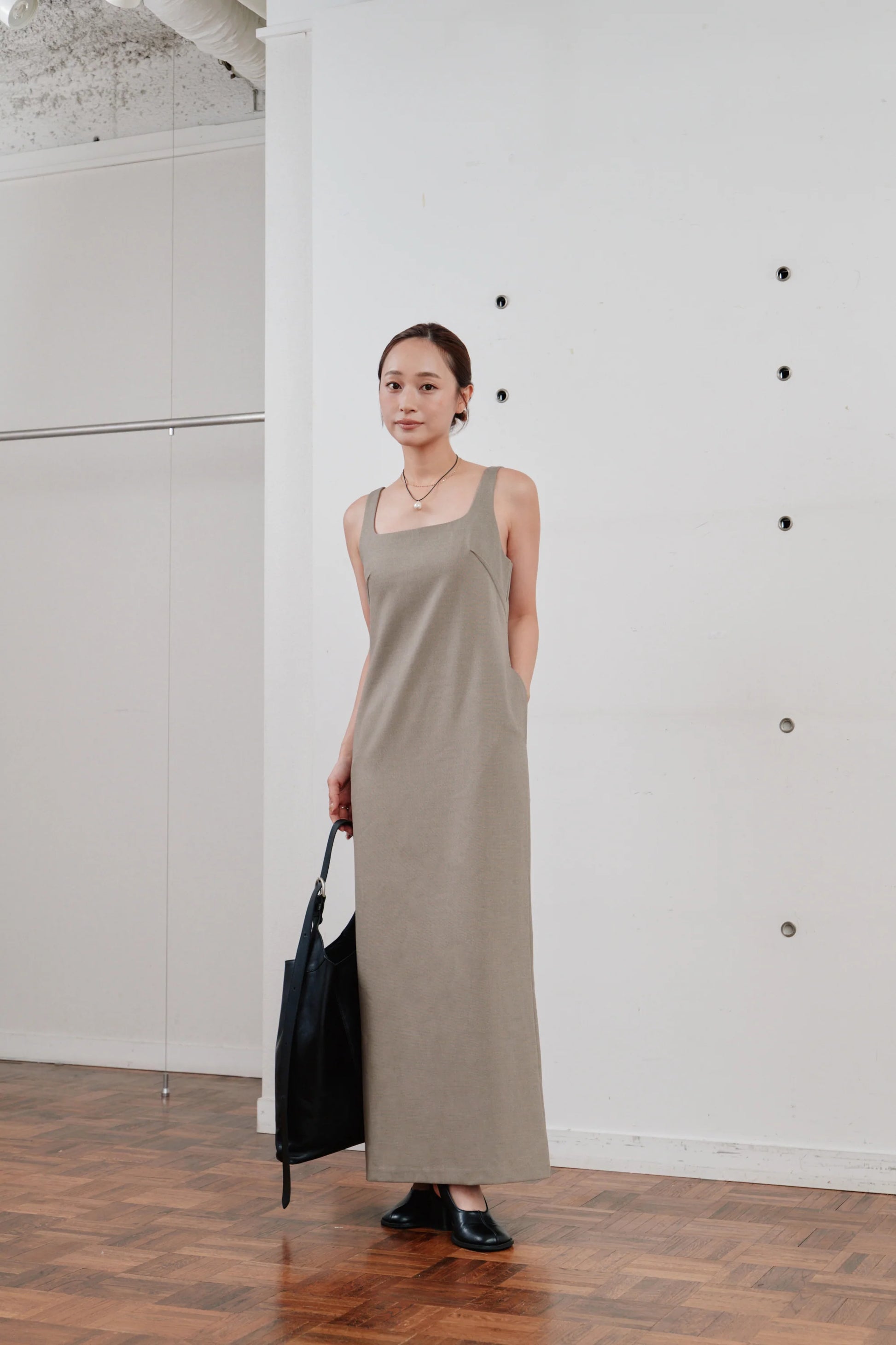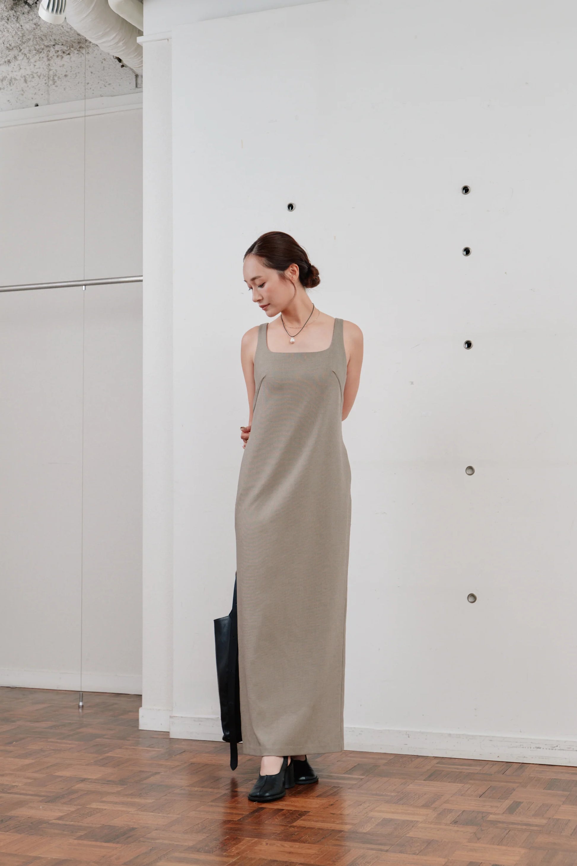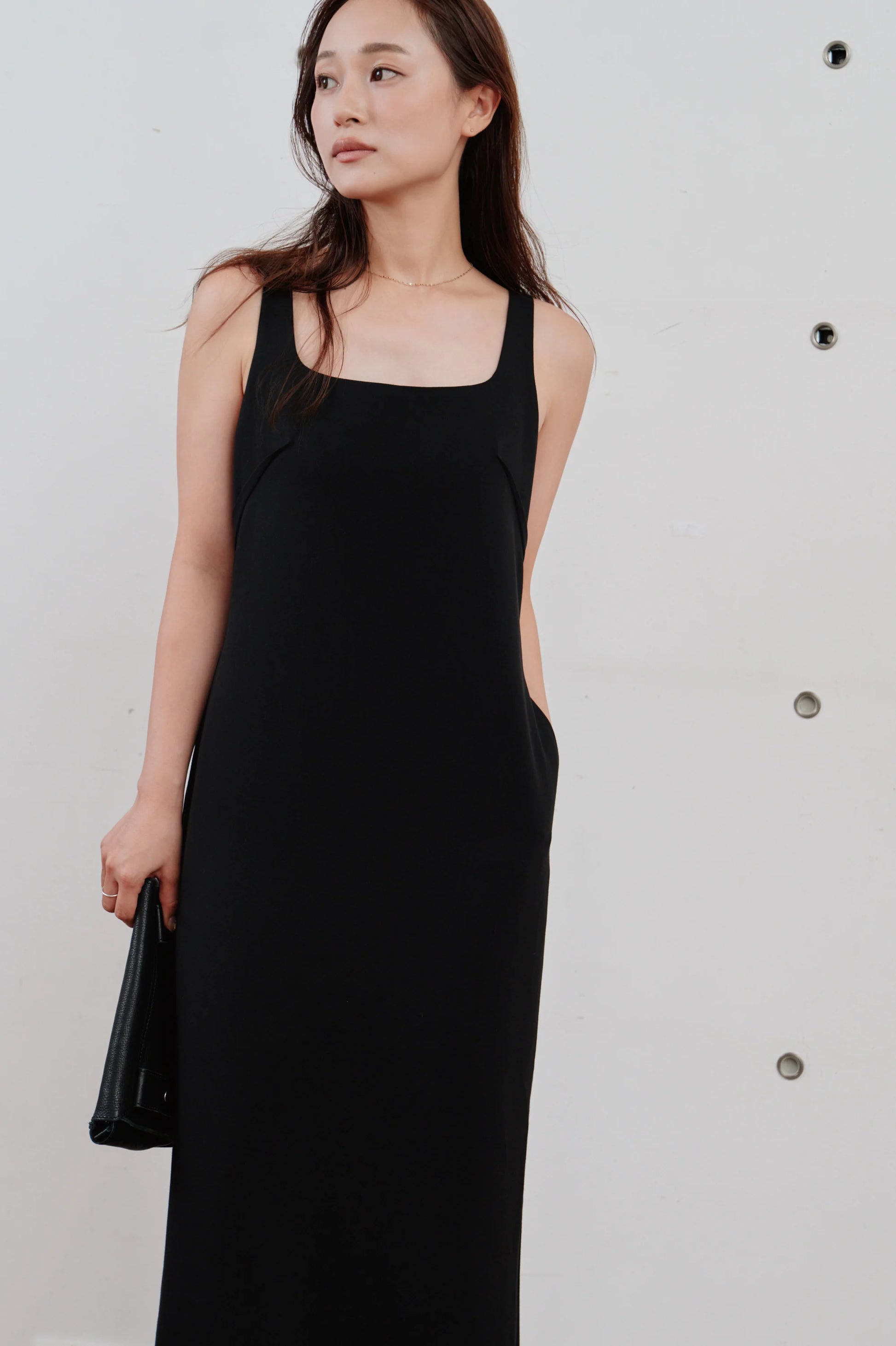 洗練された印象を与える、ミニマルなロングワンピース。