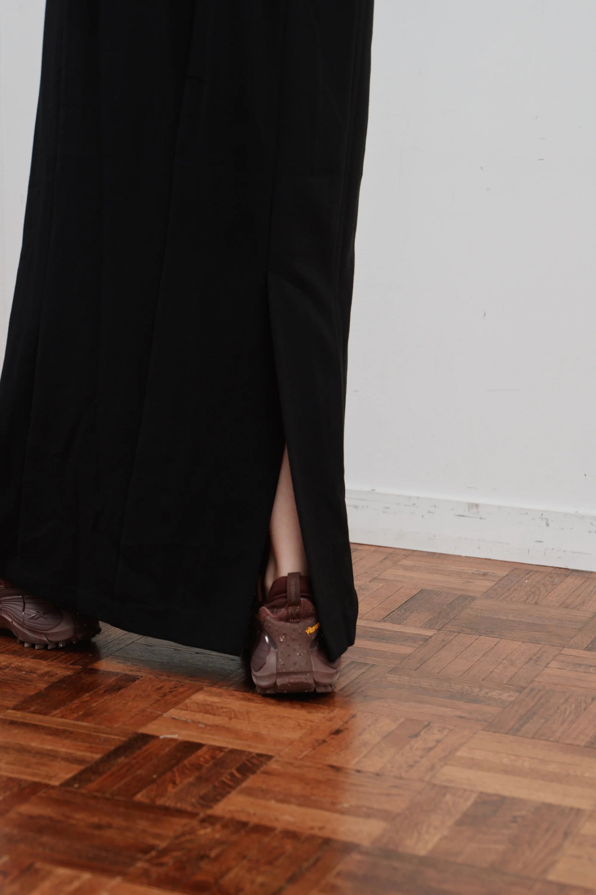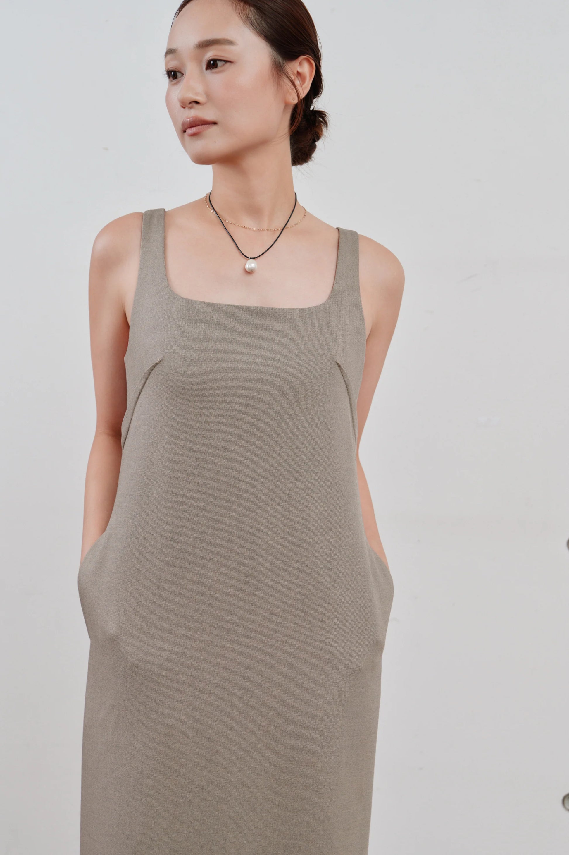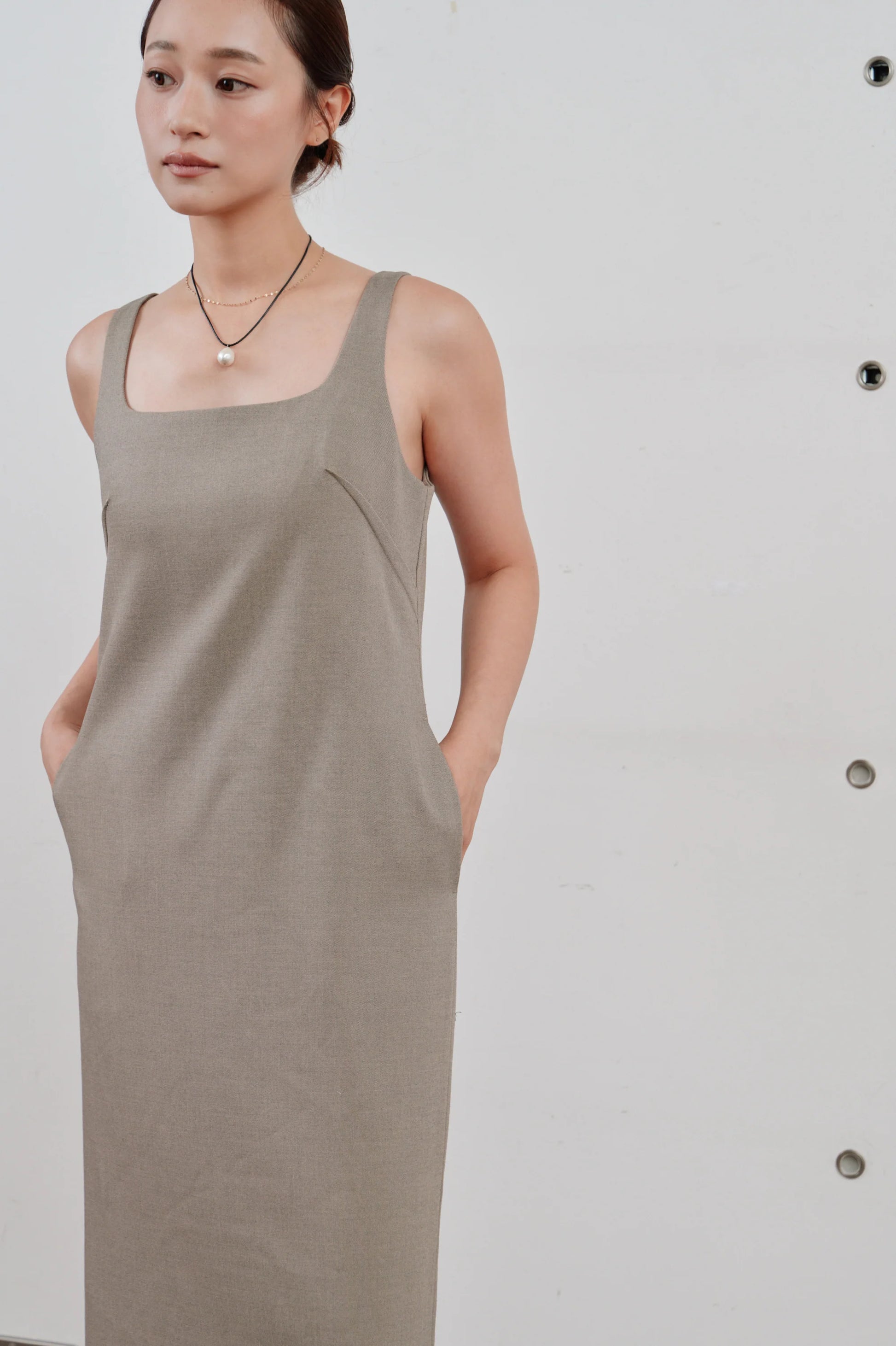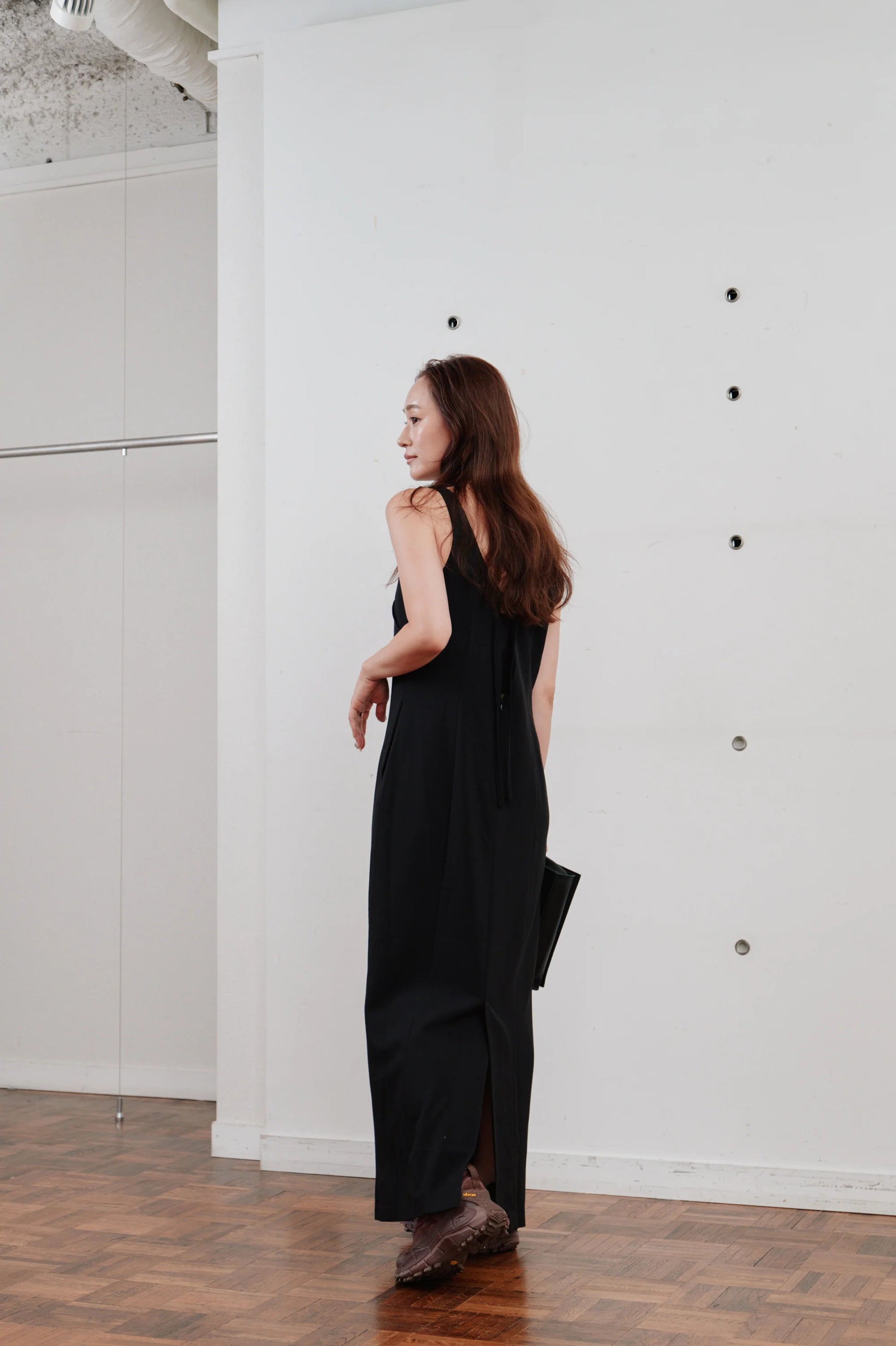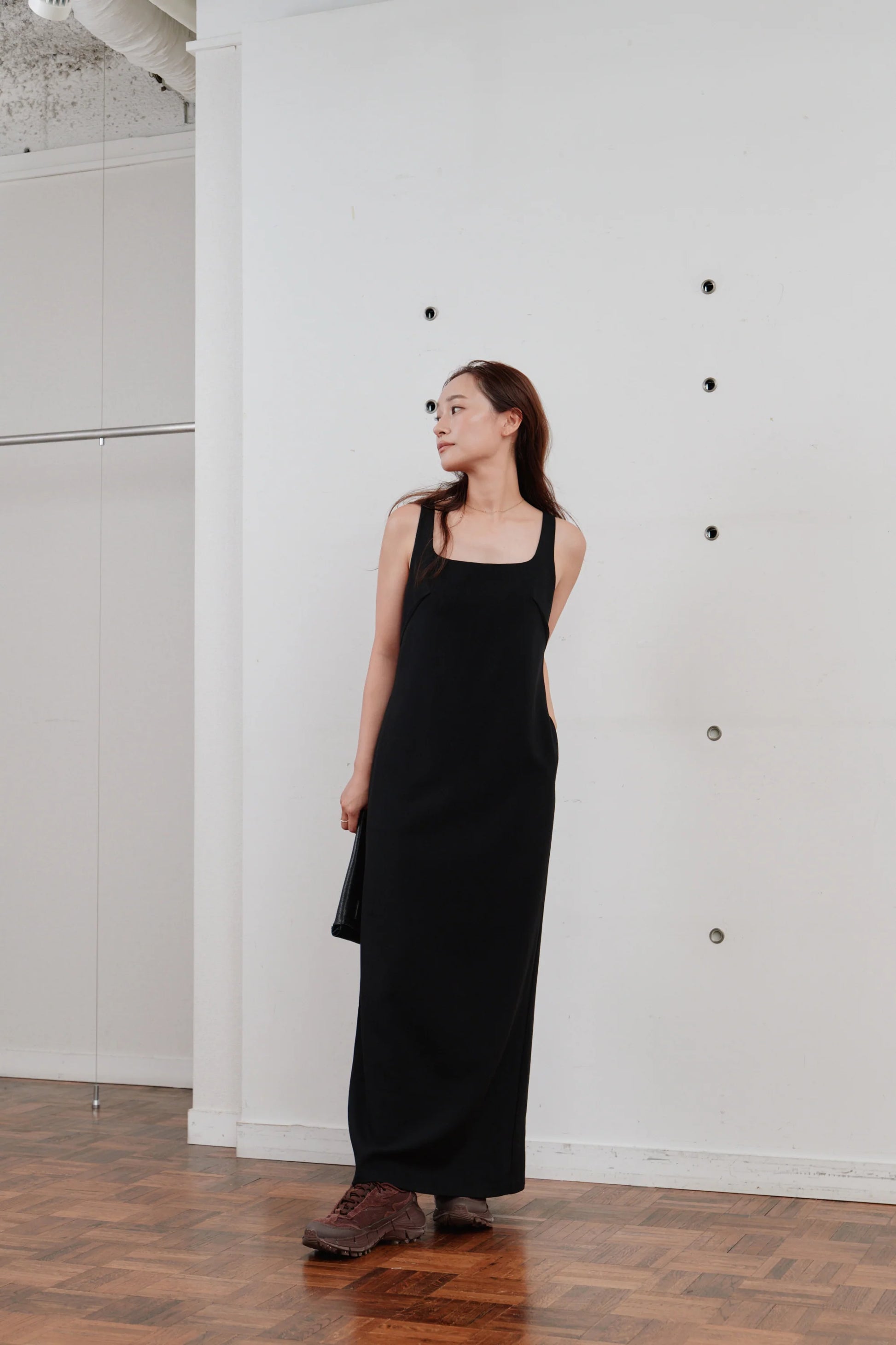洗練された印象を与える、ミニマルなロングワンピース。