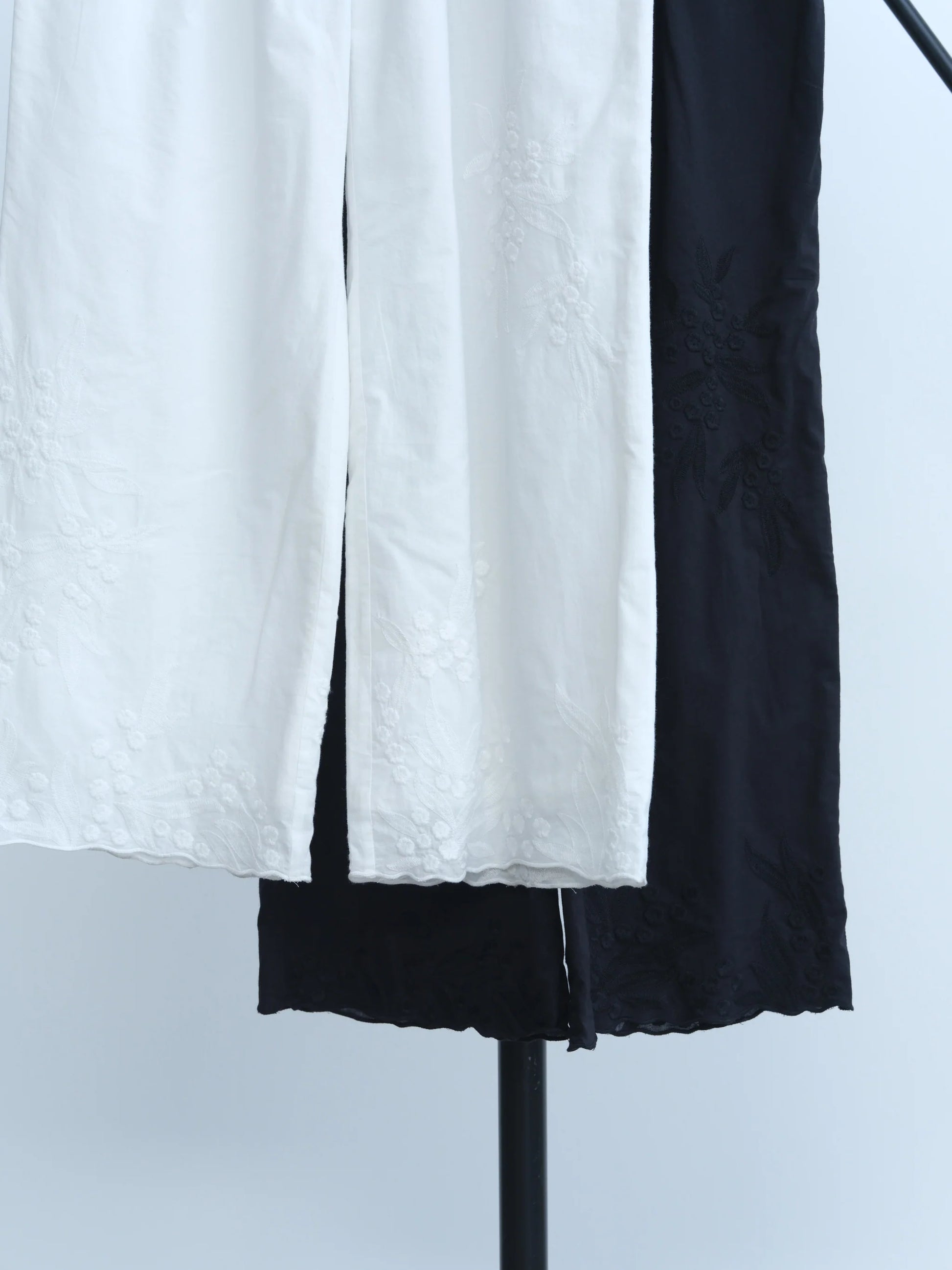 裾にさりげなく施されたフラワーモチーフが、足元に軽やかなニュアンスを添えます。