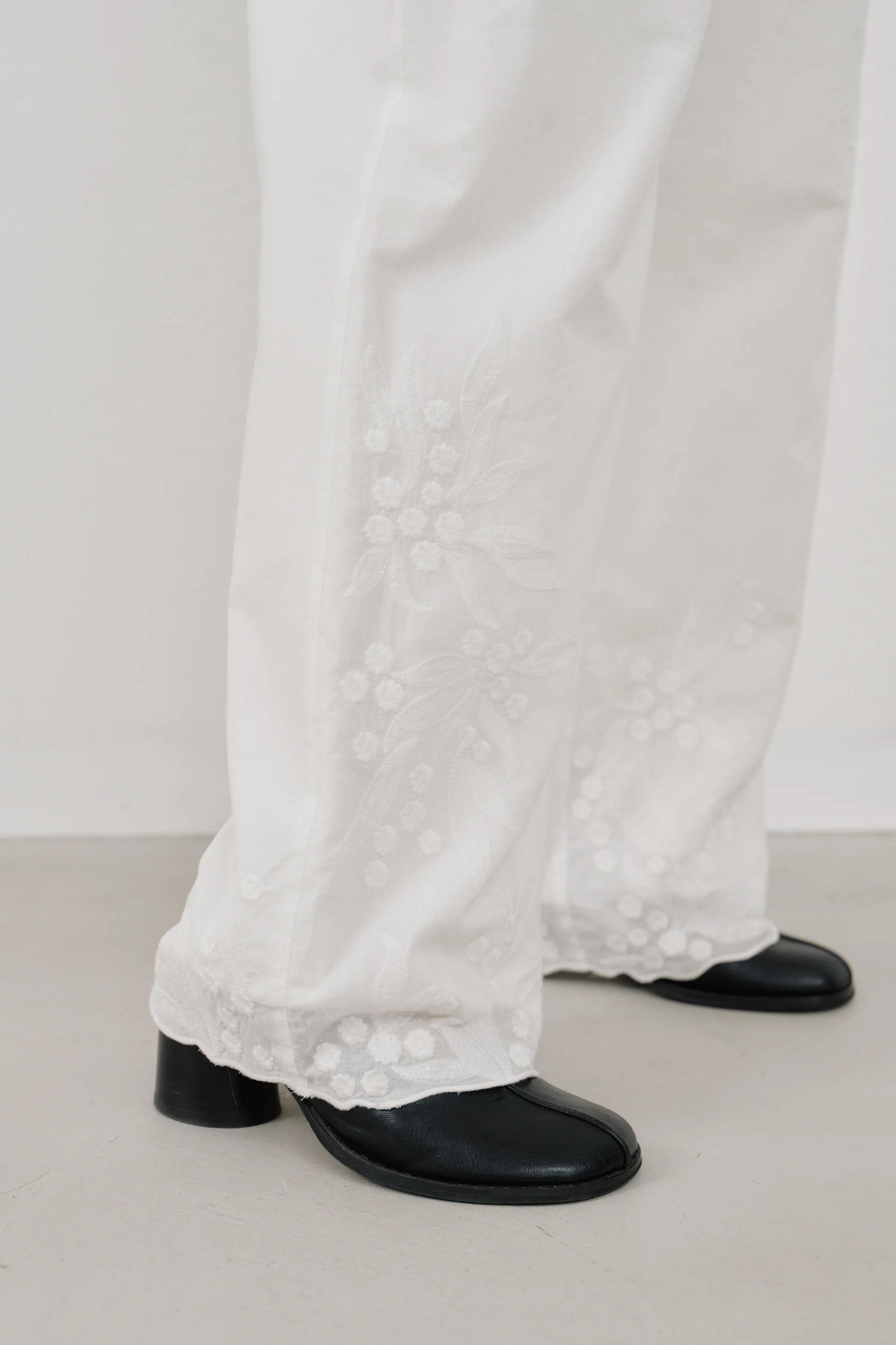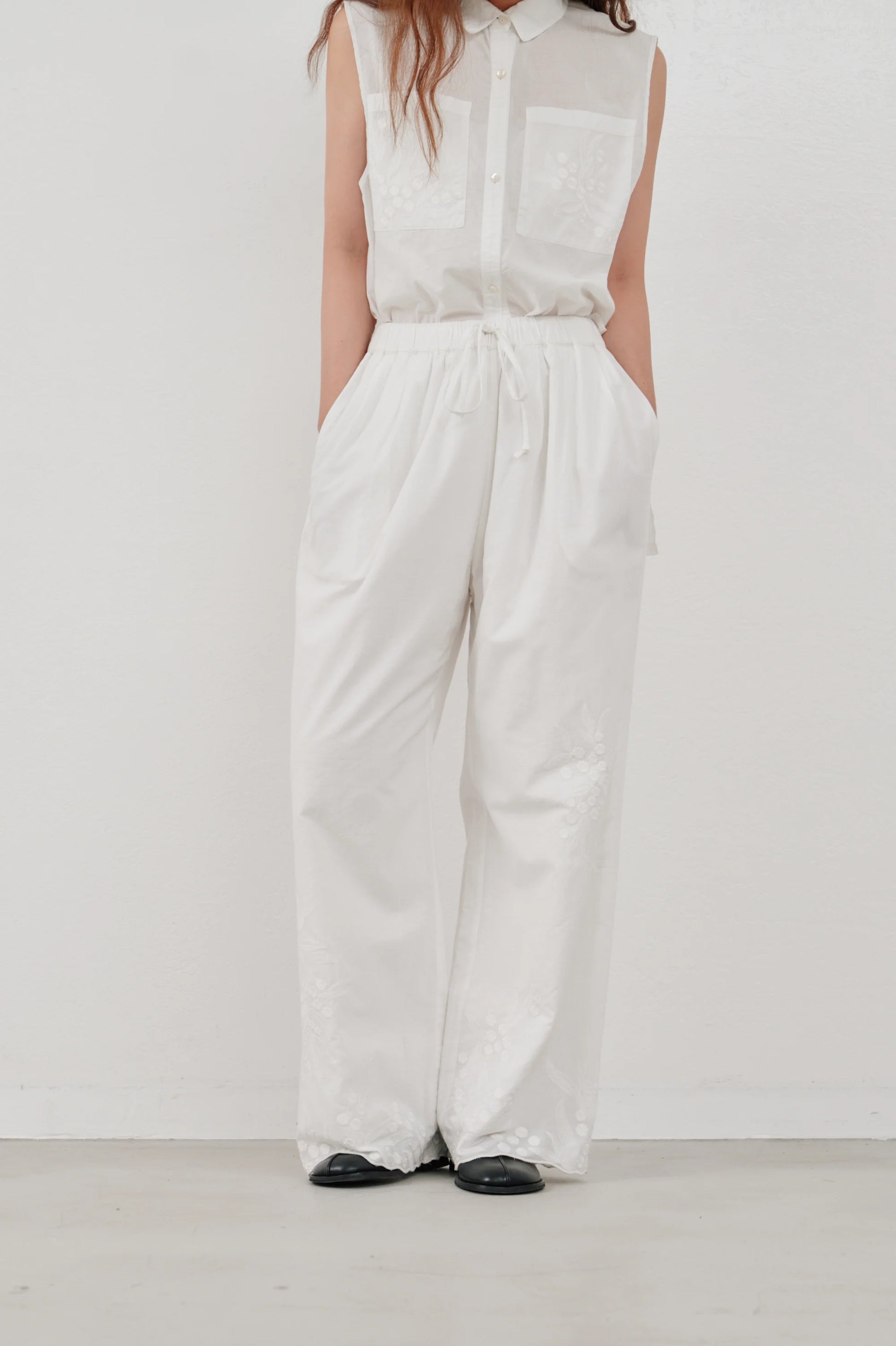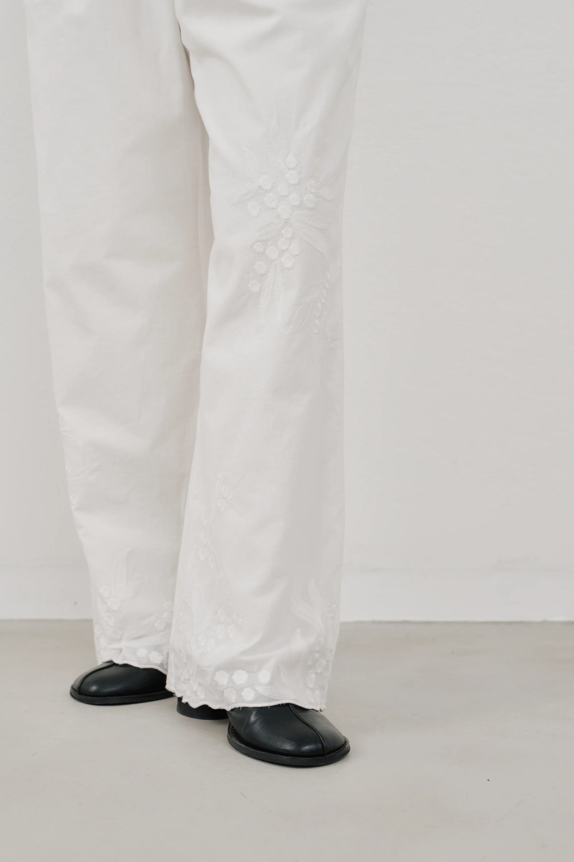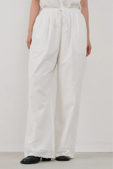 裾部分にあしらったオリジナル柄のインド刺繍が印象的な、ワイドシルエットのイージーパンツ。