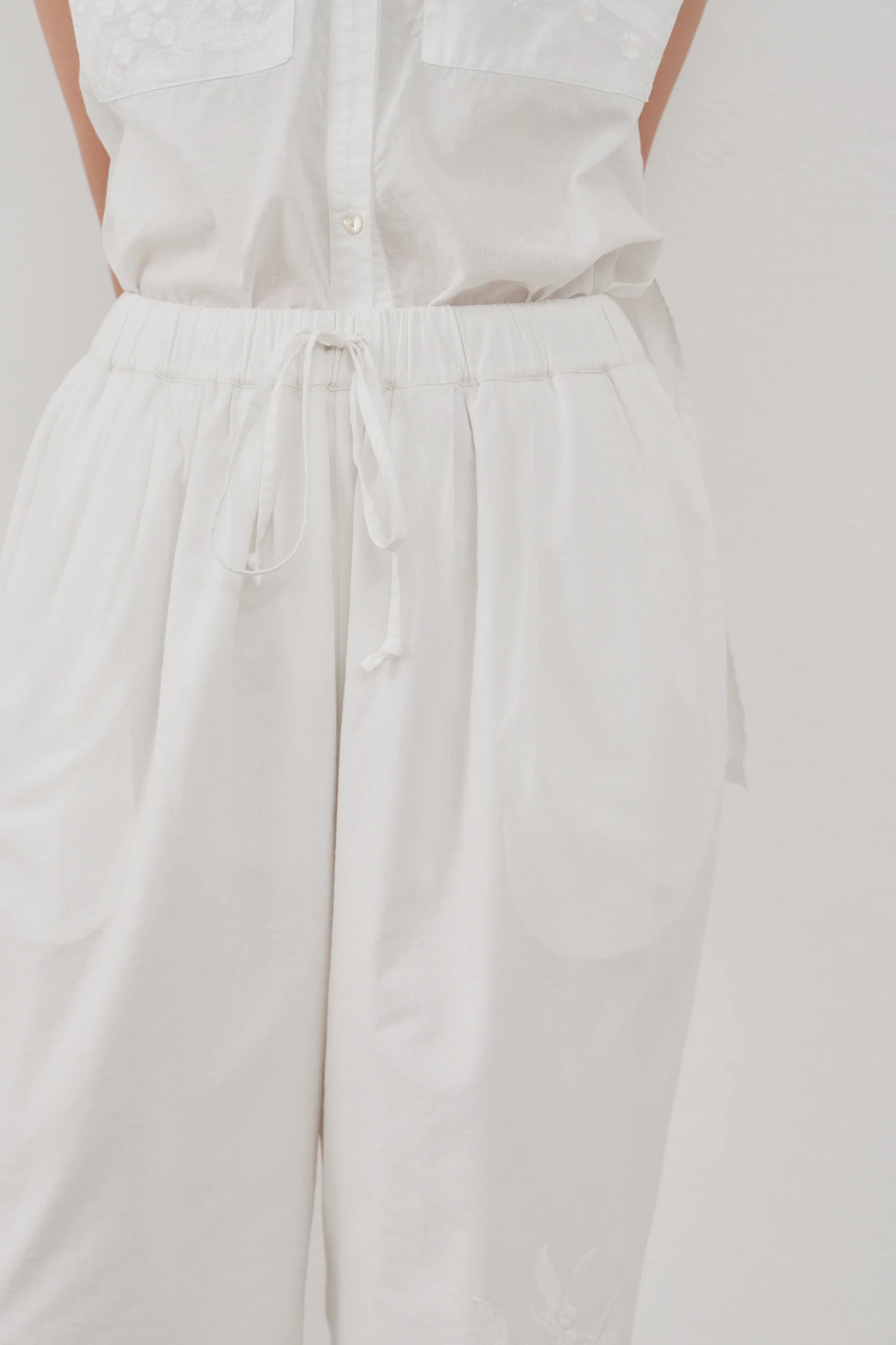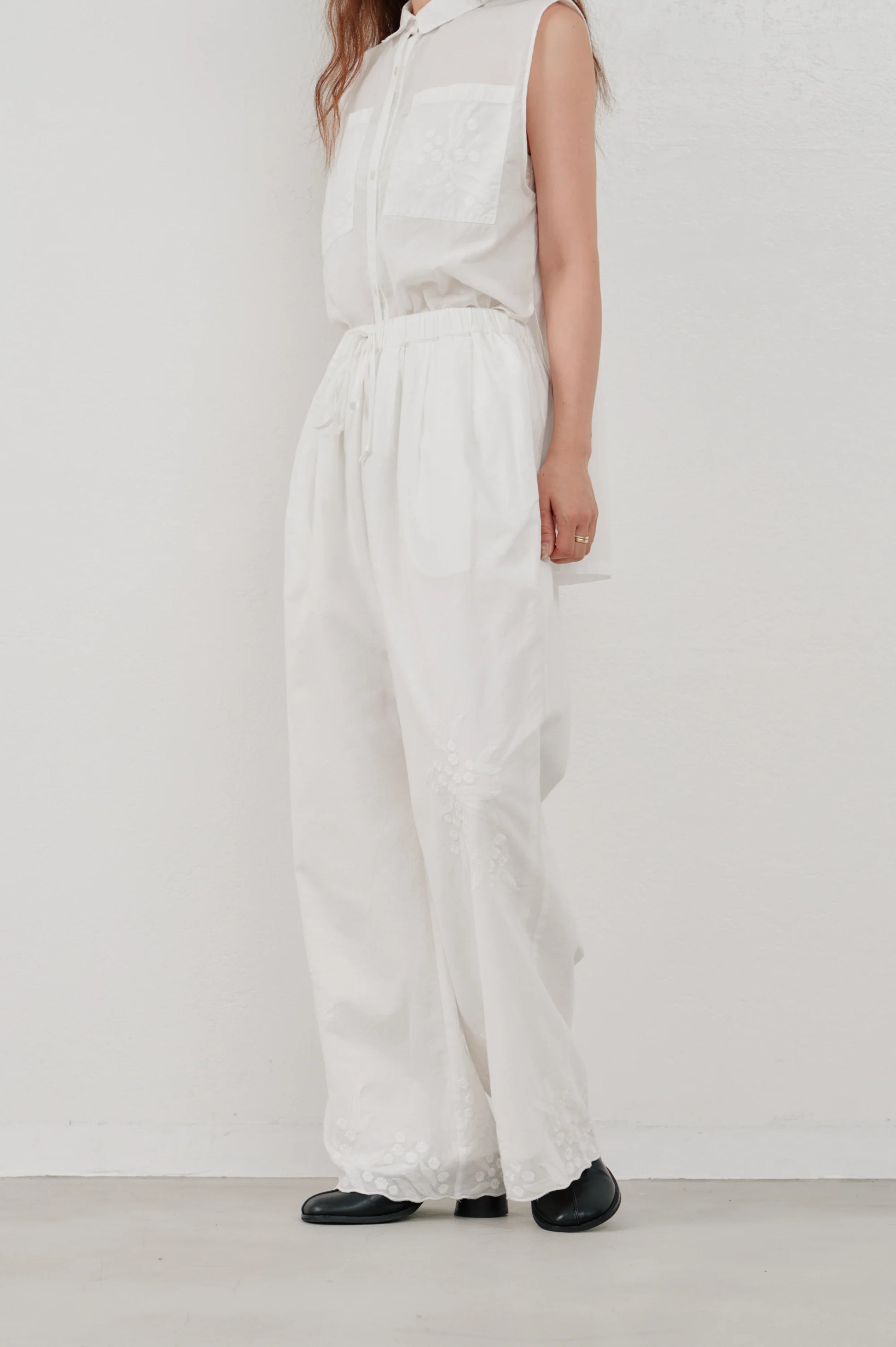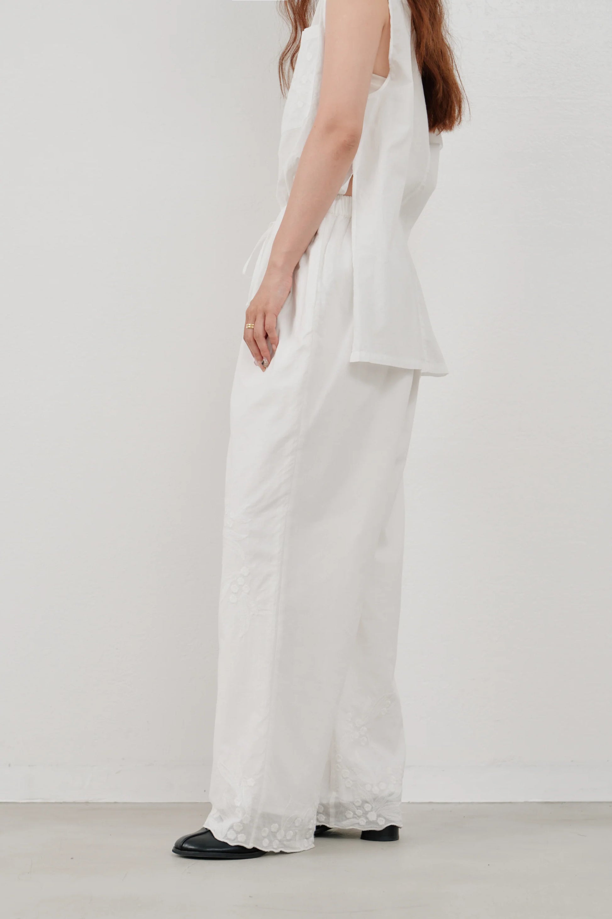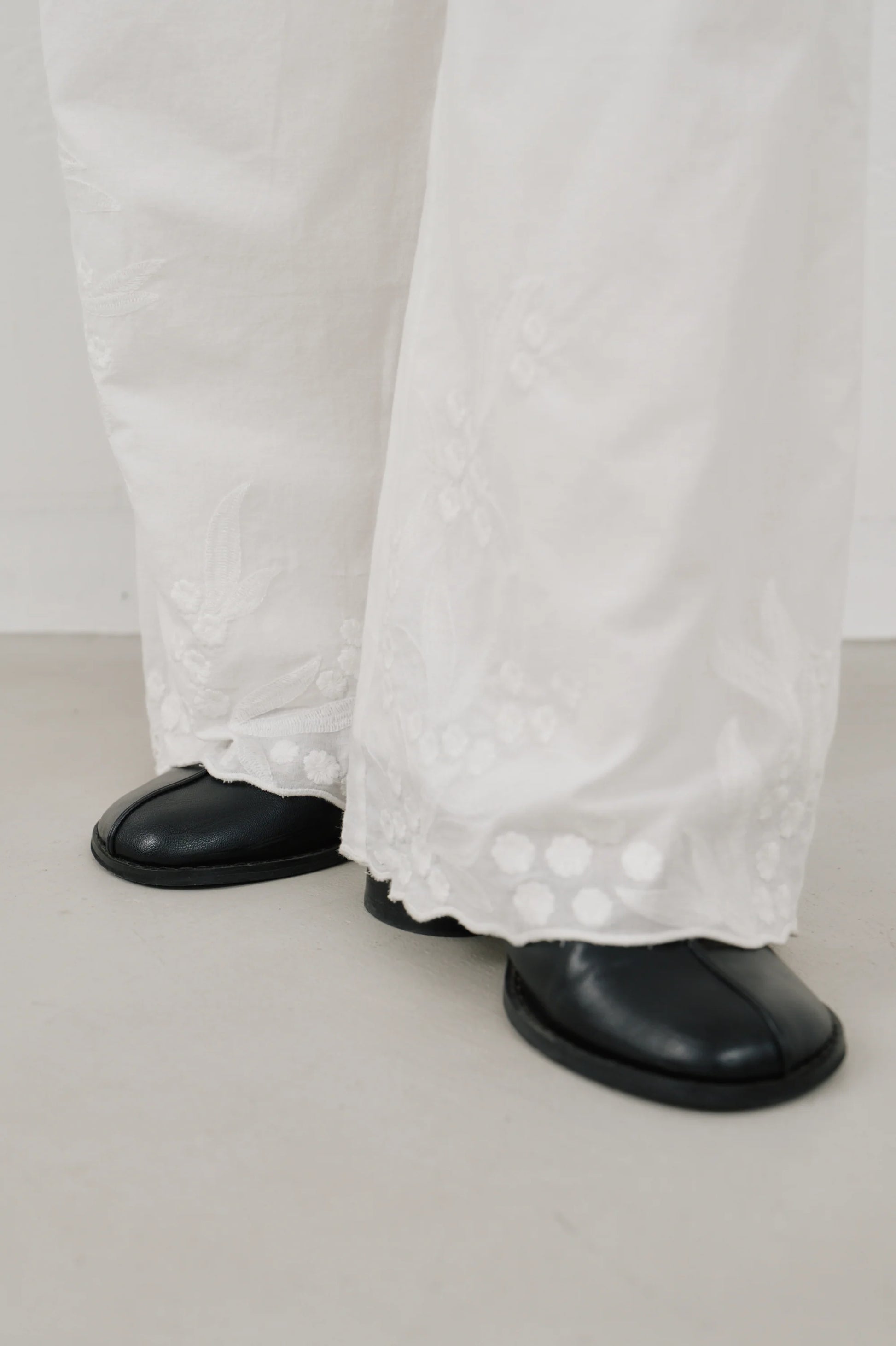 裾部分にあしらったオリジナル柄のインド刺繍が印象的な、ワイドシルエットのイージーパンツ。