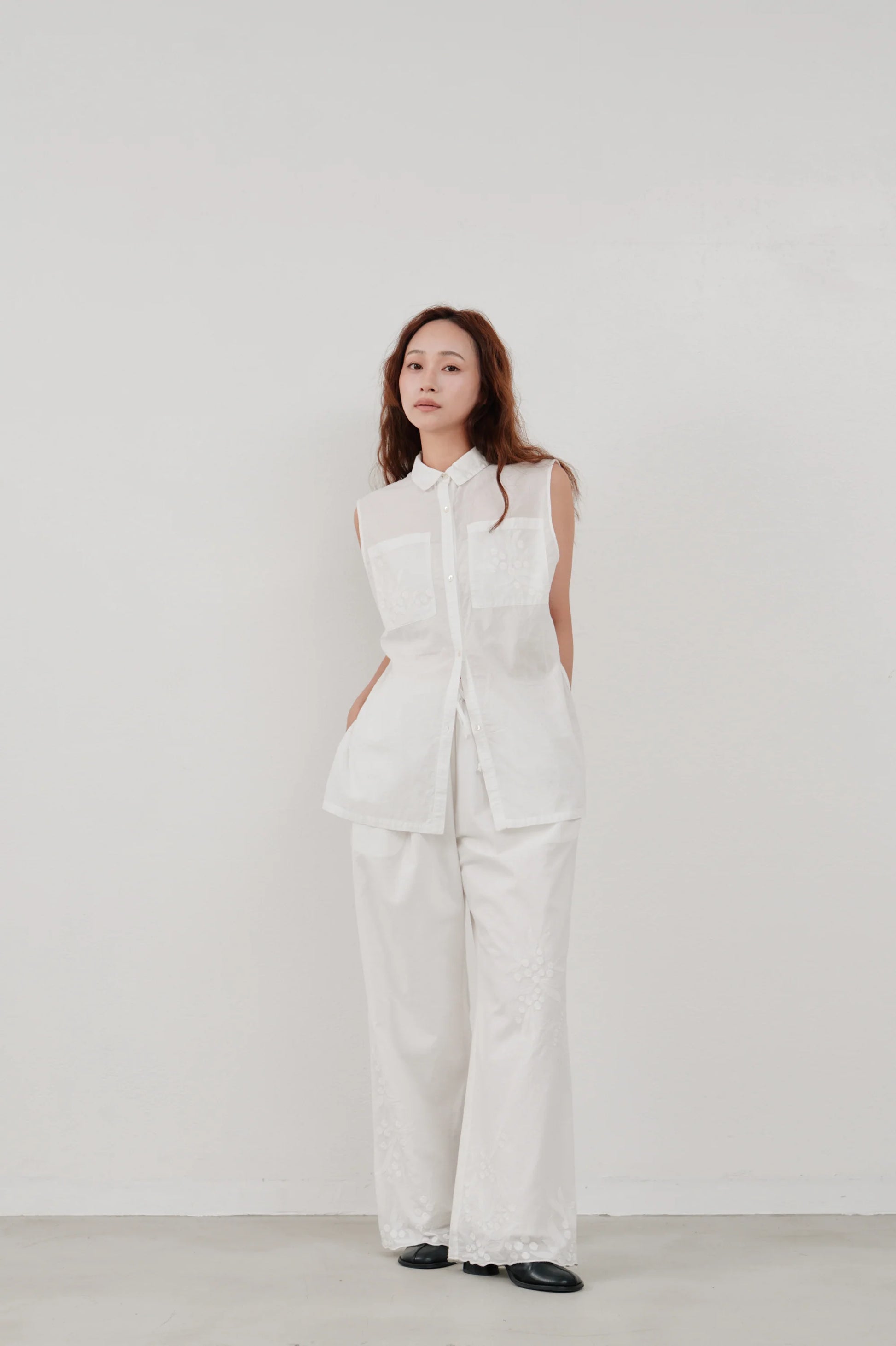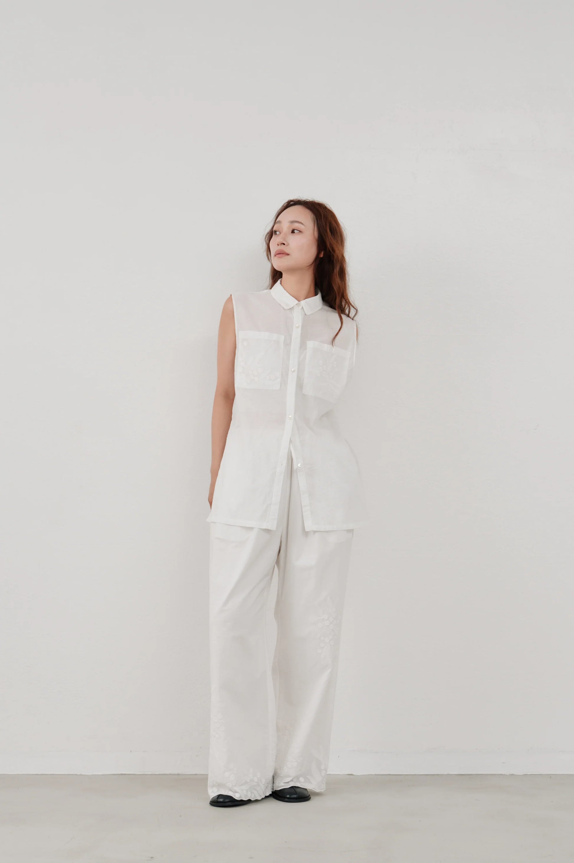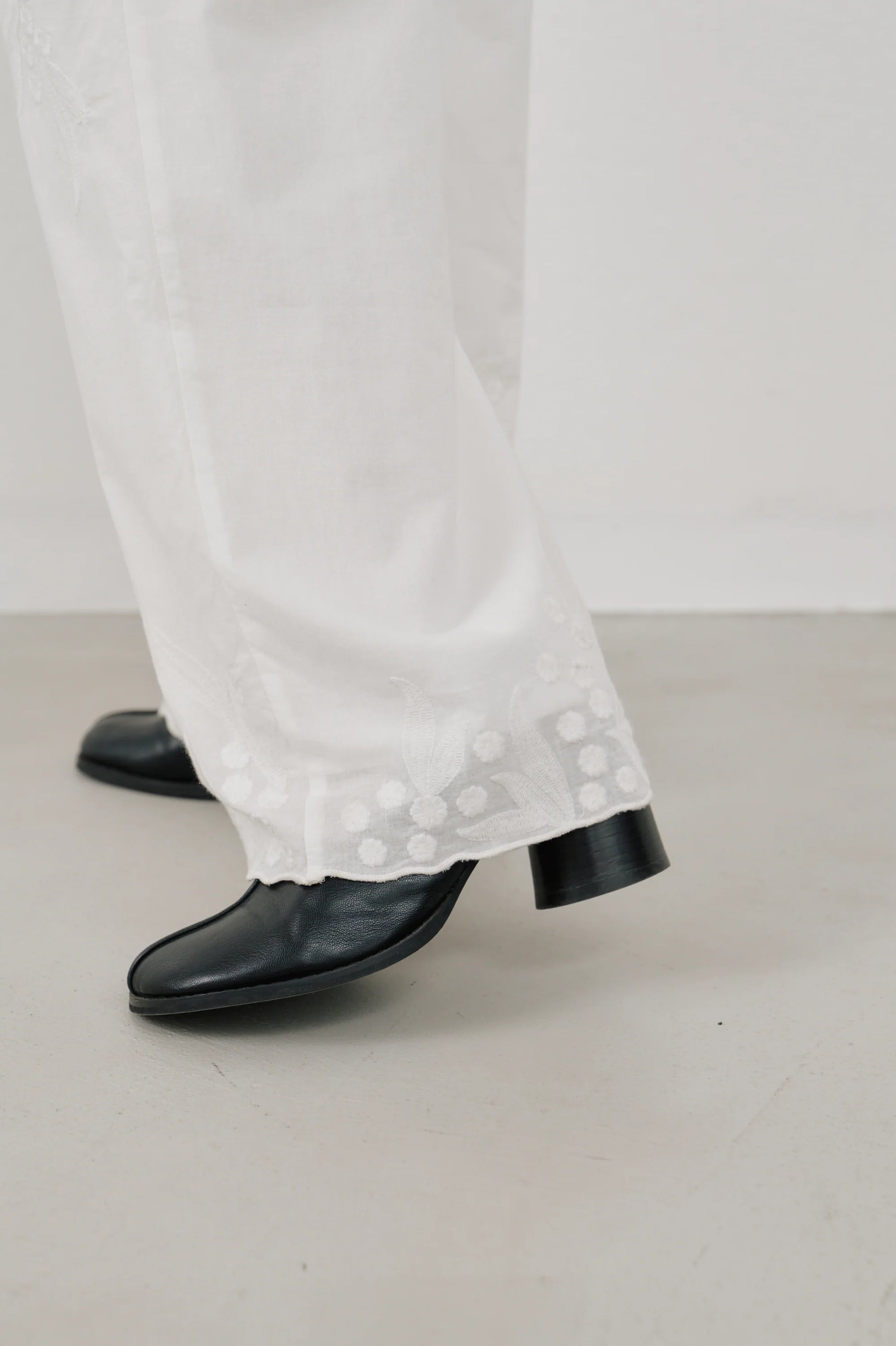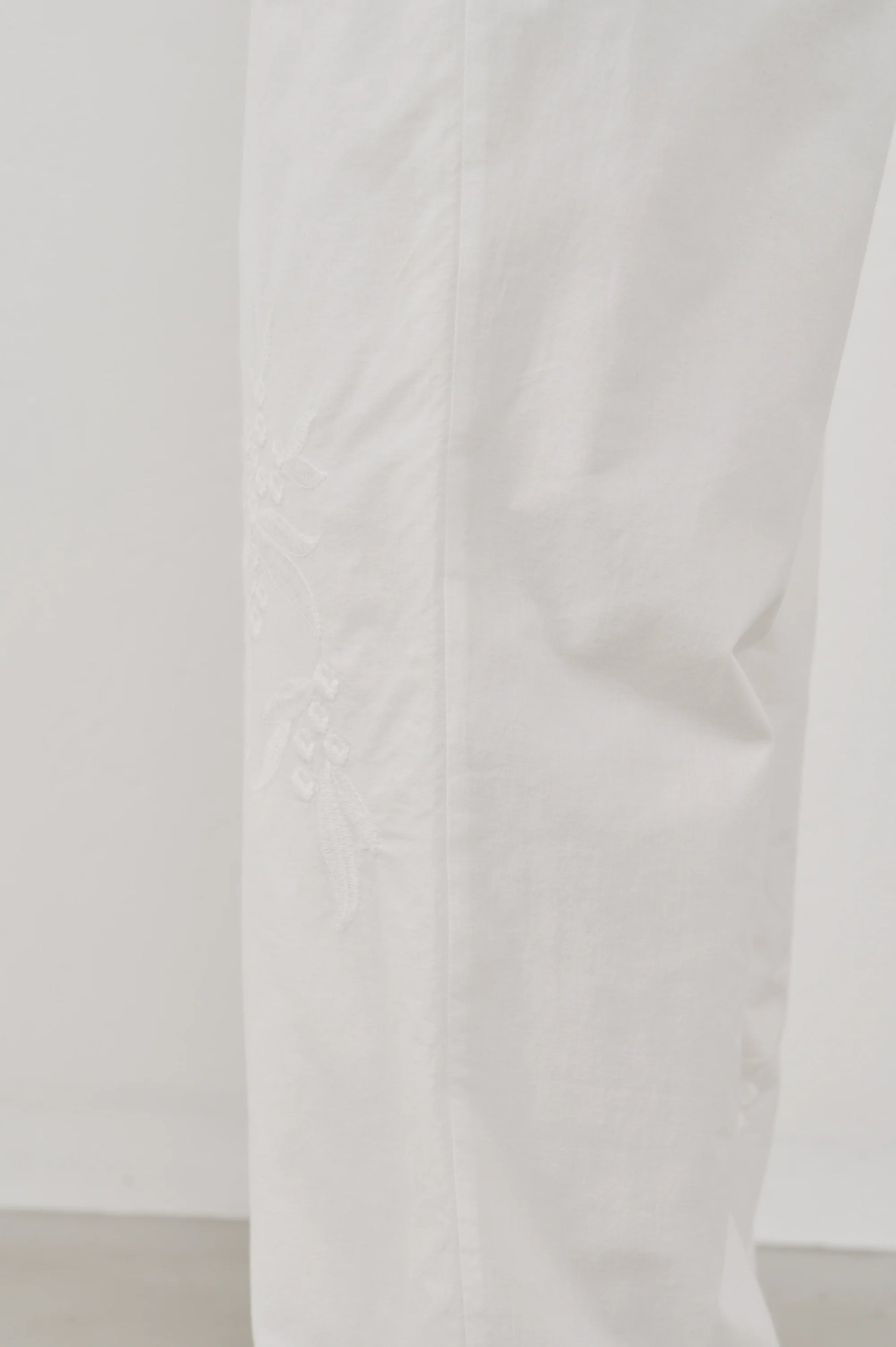 裾部分にあしらったオリジナル柄のインド刺繍が印象的な、ワイドシルエットのイージーパンツ。