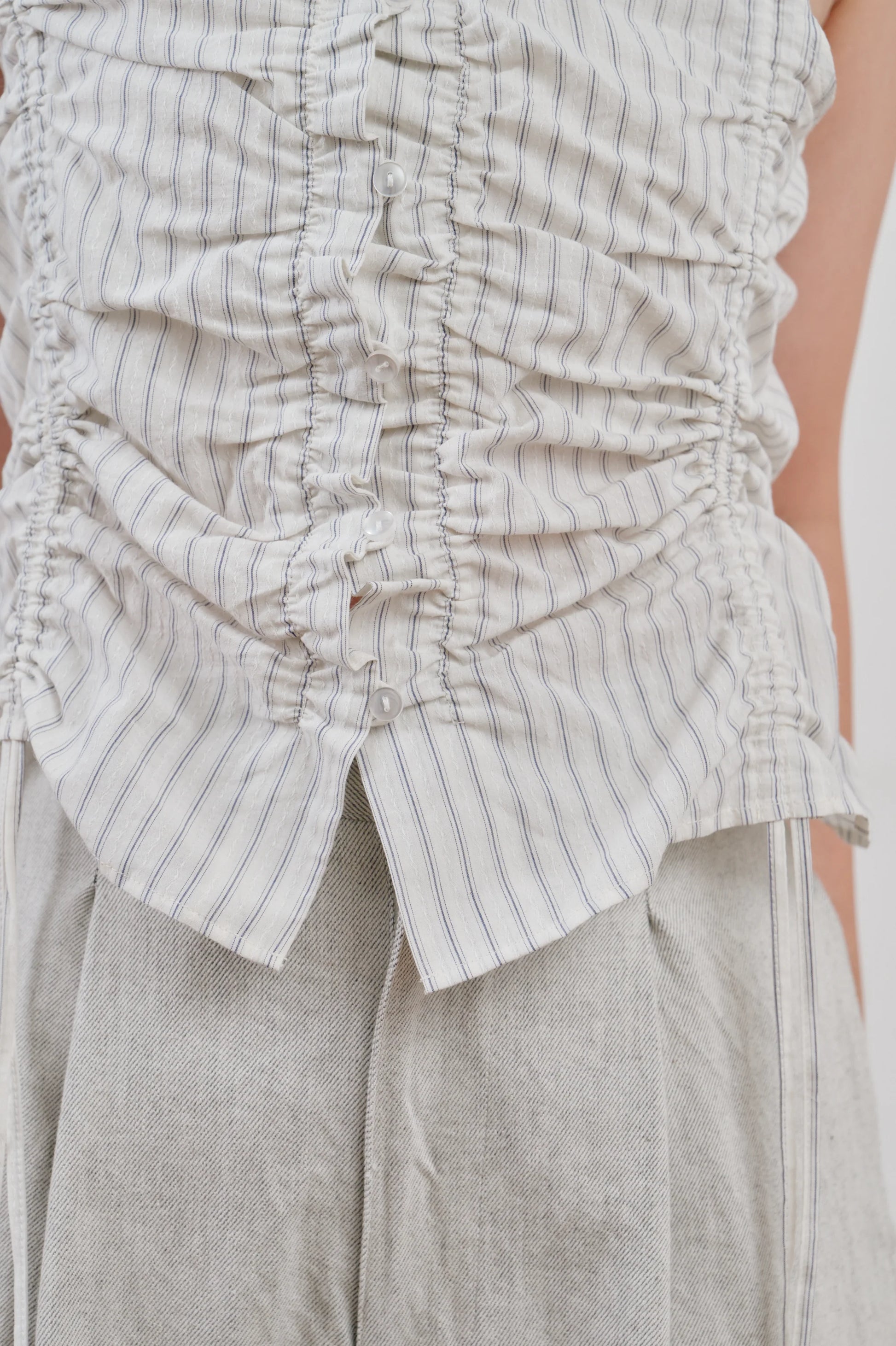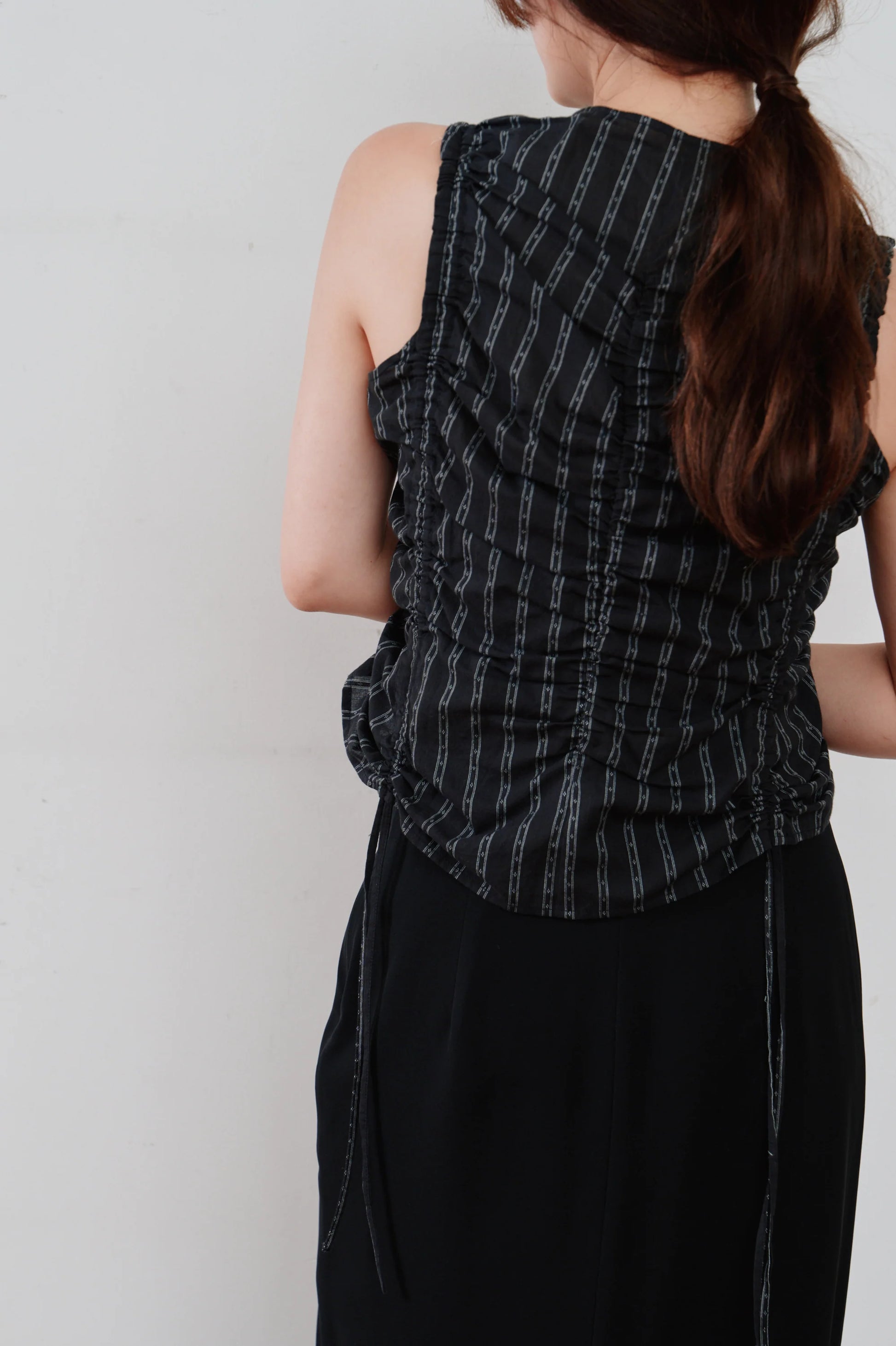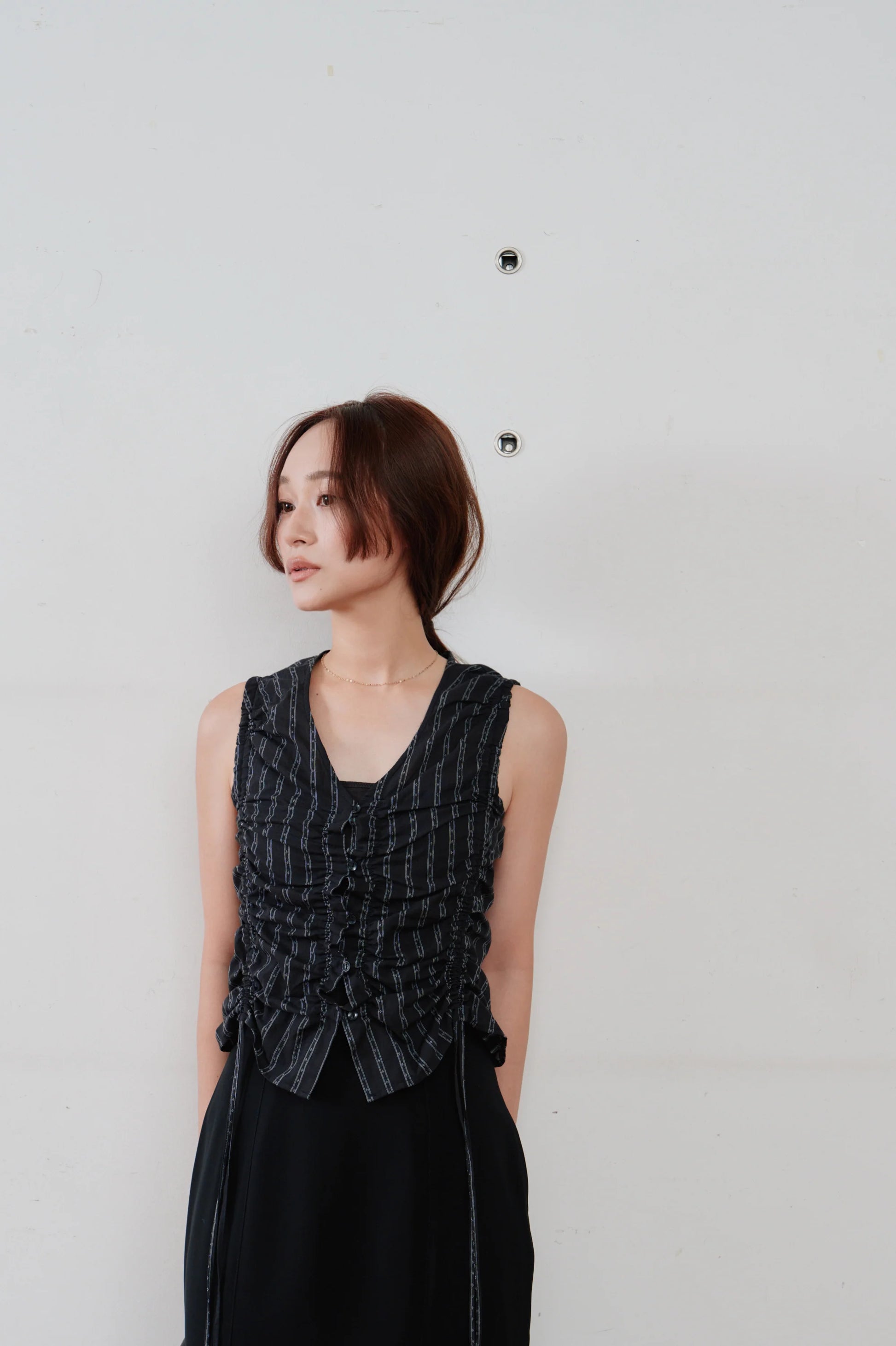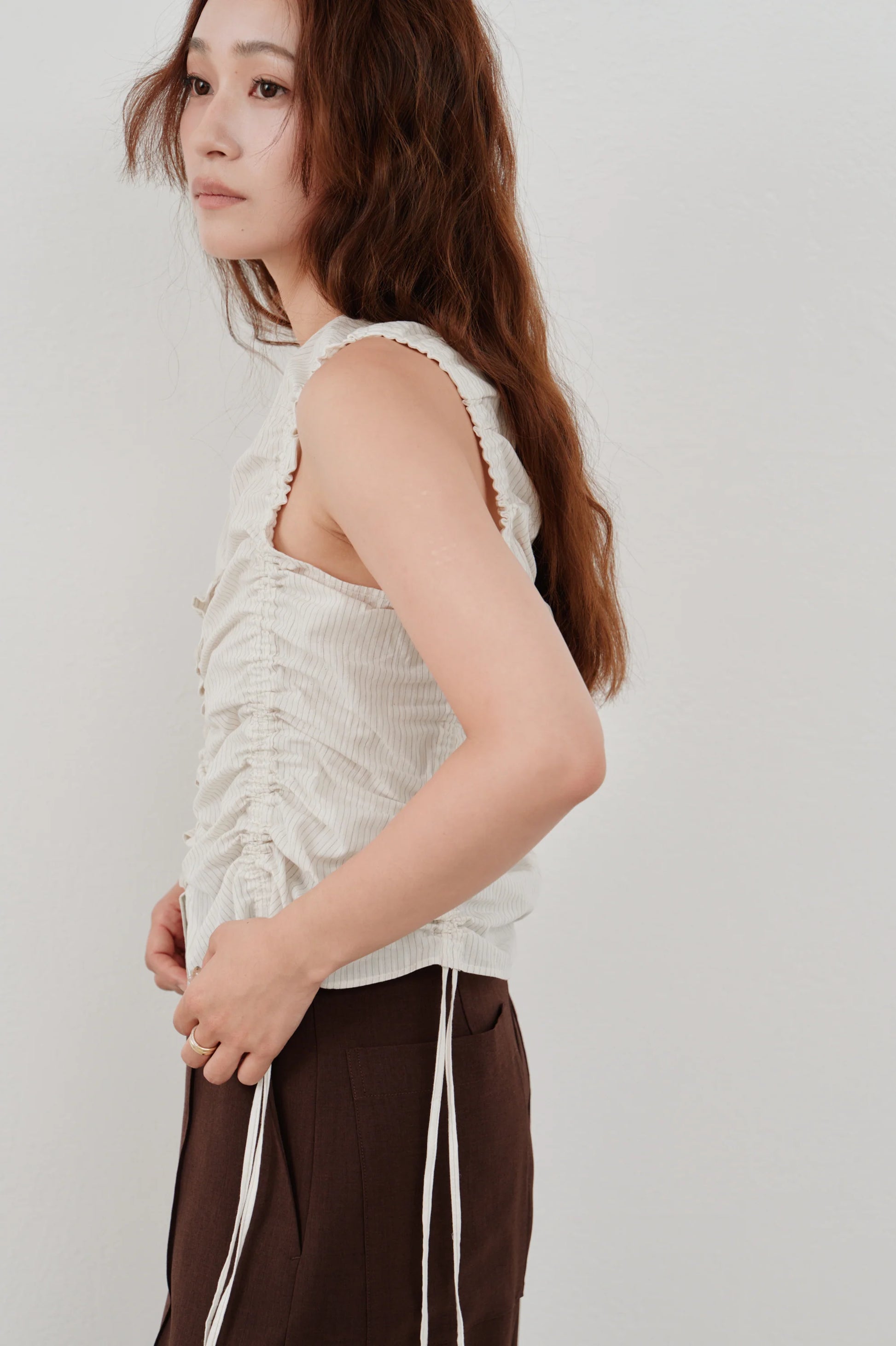 フロントに寄せたギャザーが目を引くノースリーブブラウス。