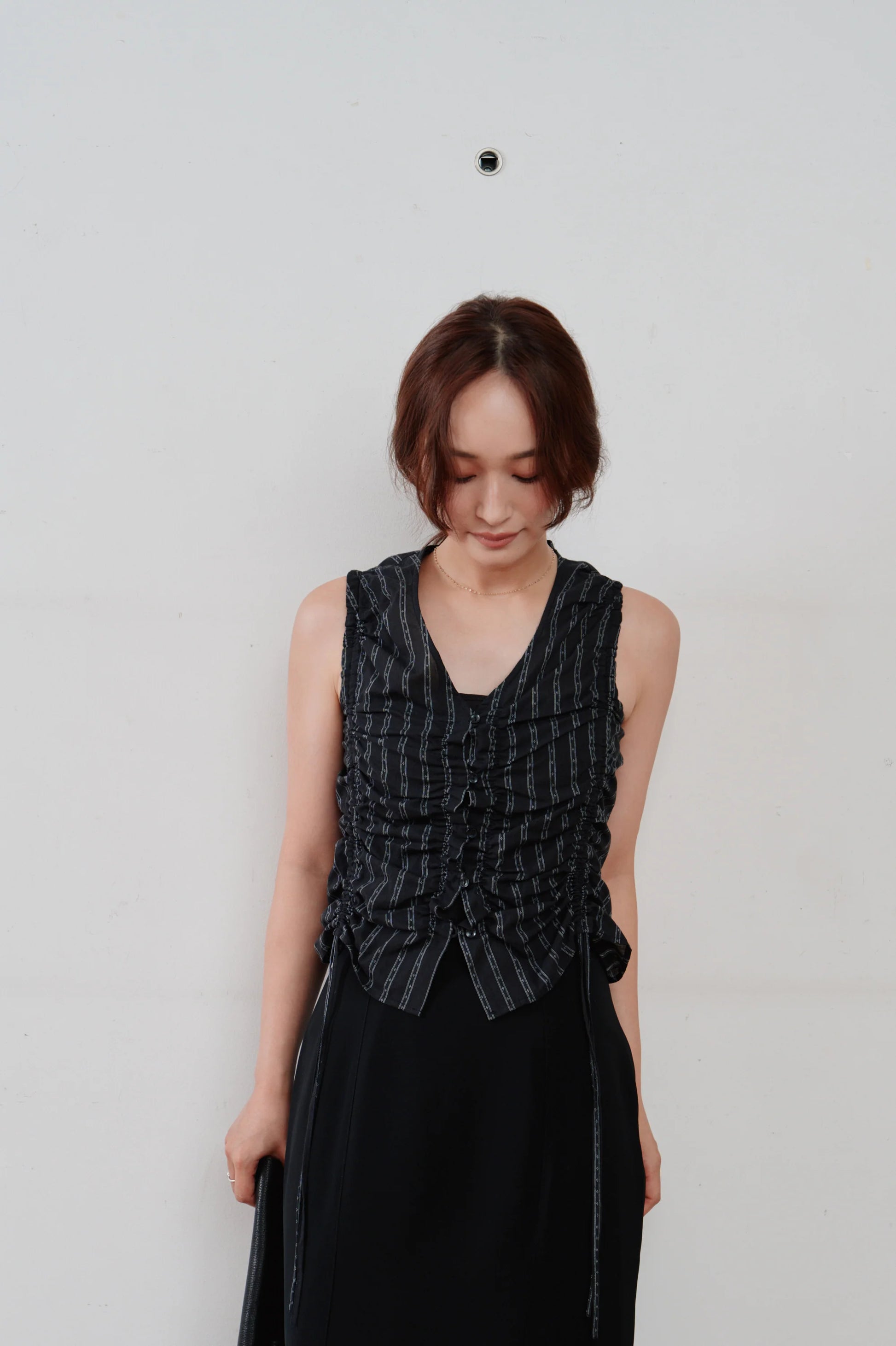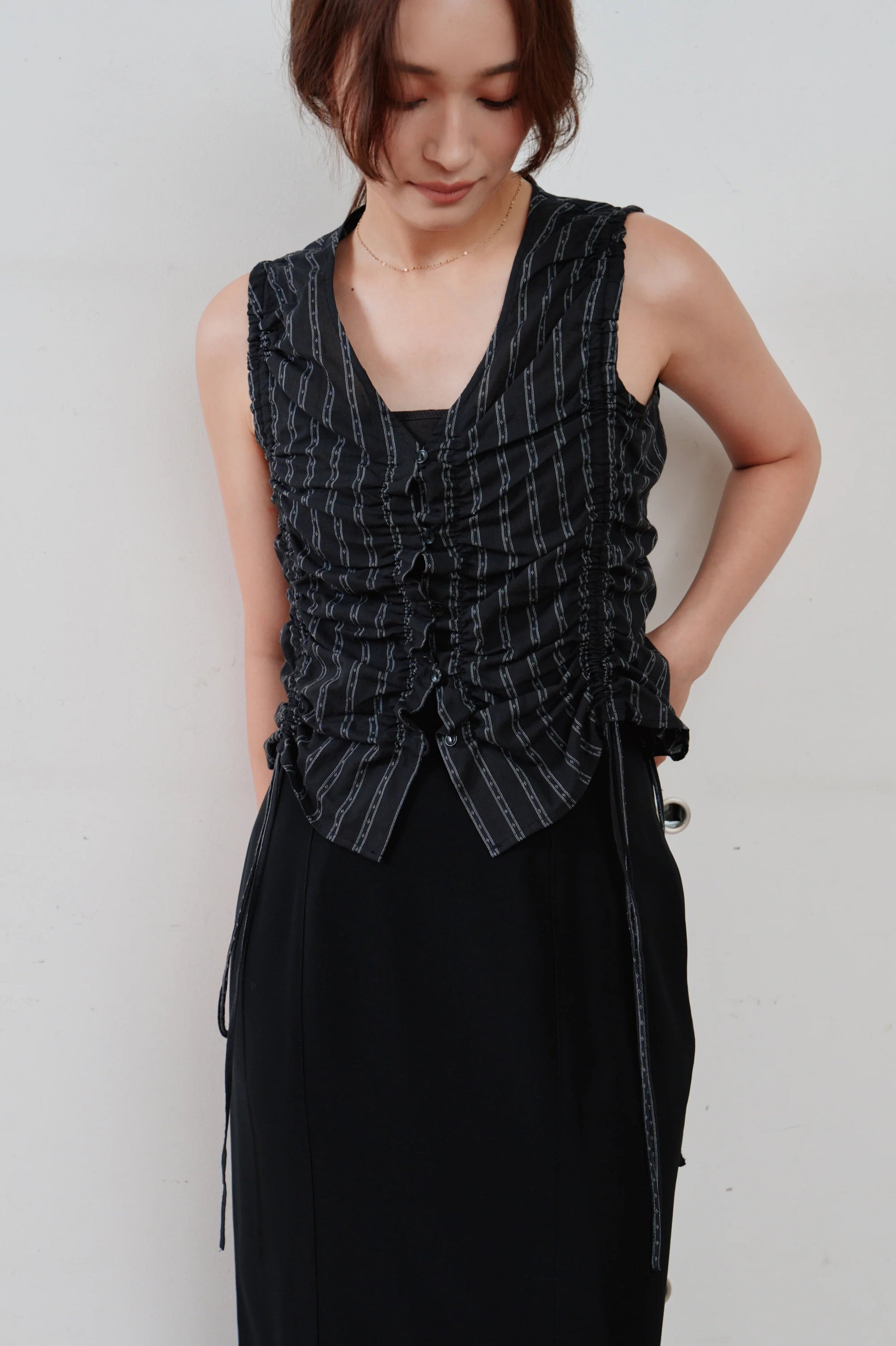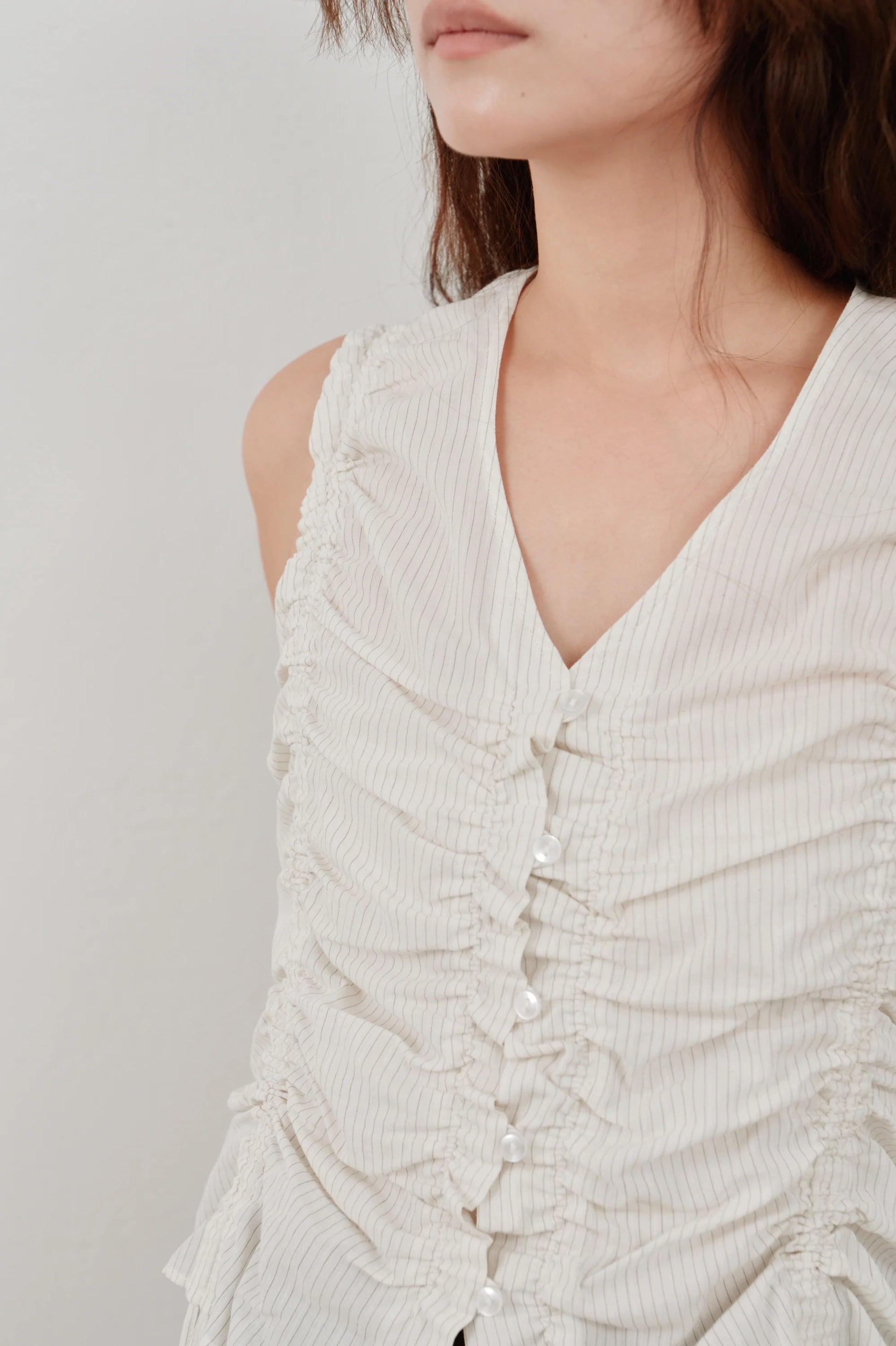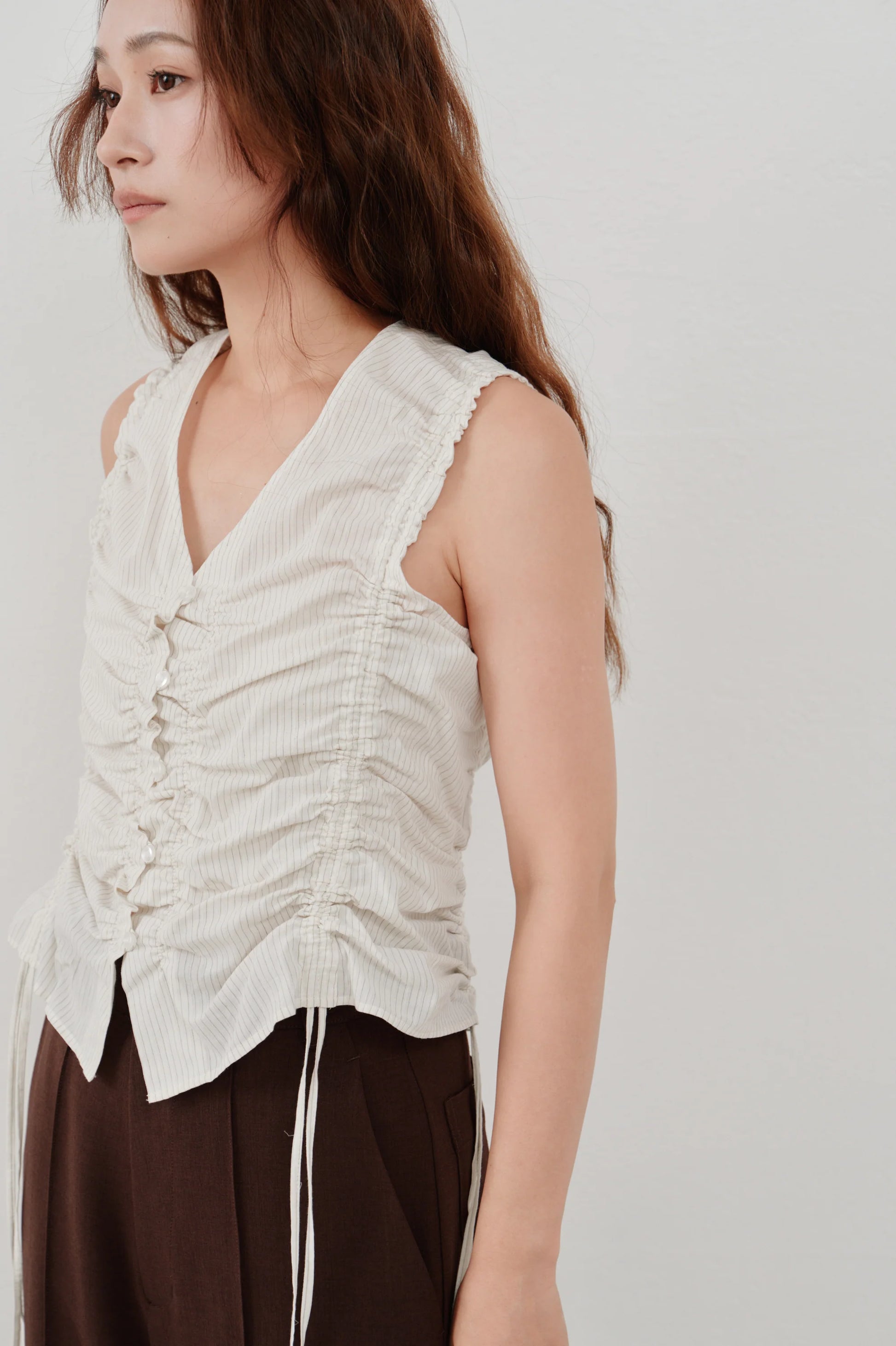 フロントに寄せたギャザーが目を引くノースリーブブラウス。