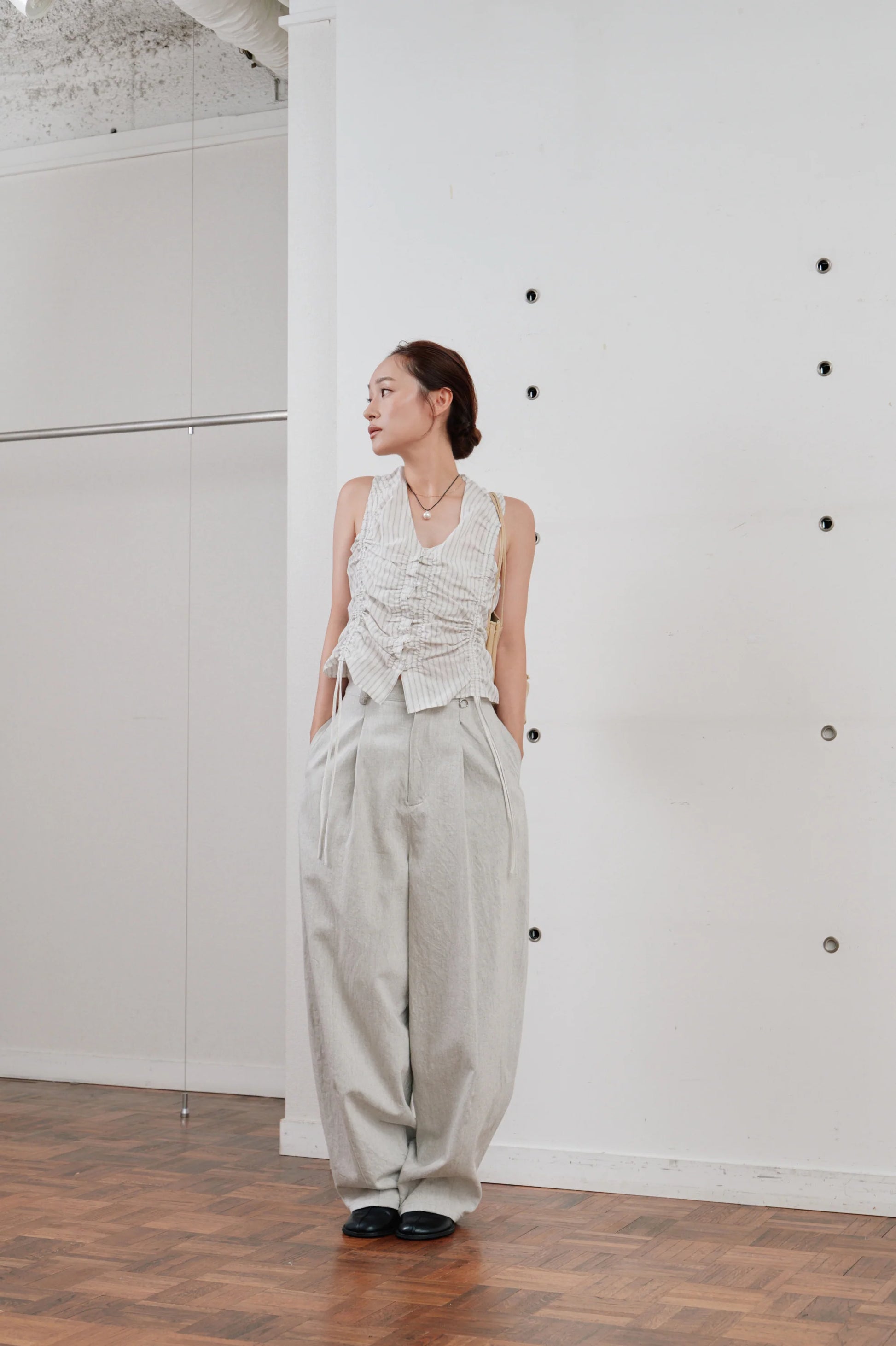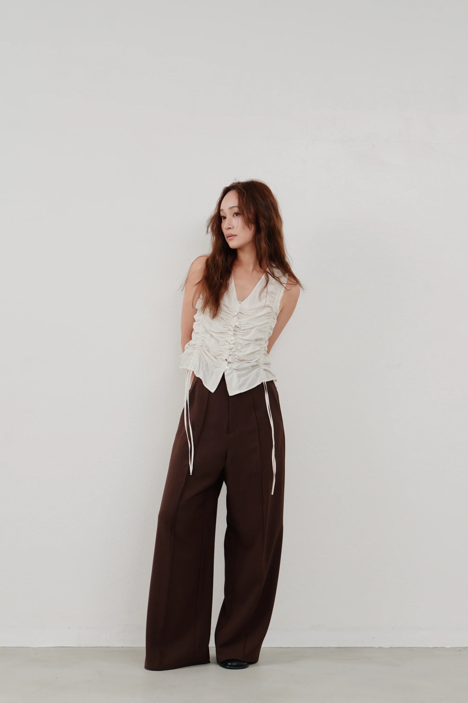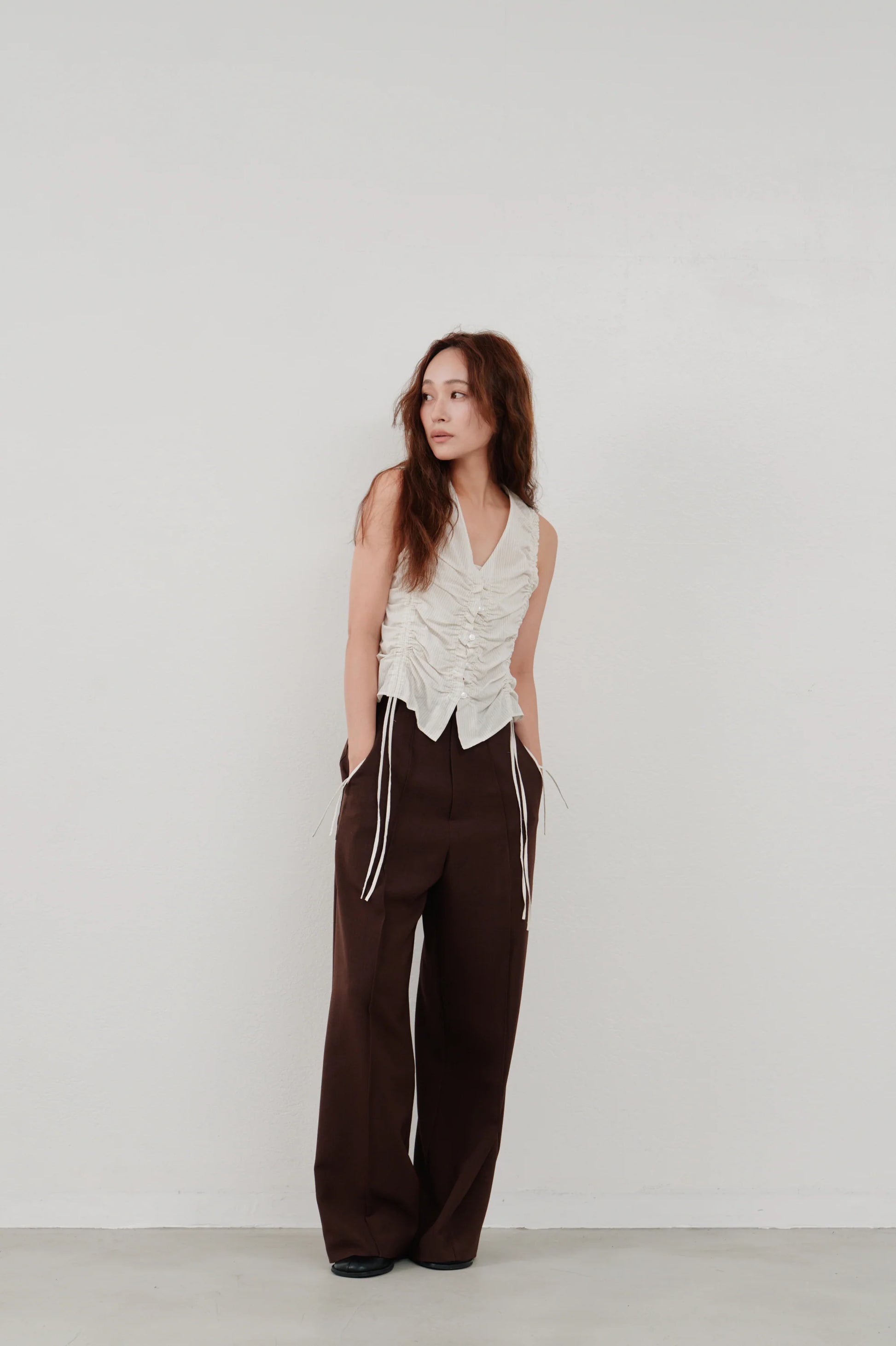 ドローストリングデザインがウエスト周りに自然な立体感を生み出し、すっきりと見えるシルエットに。
