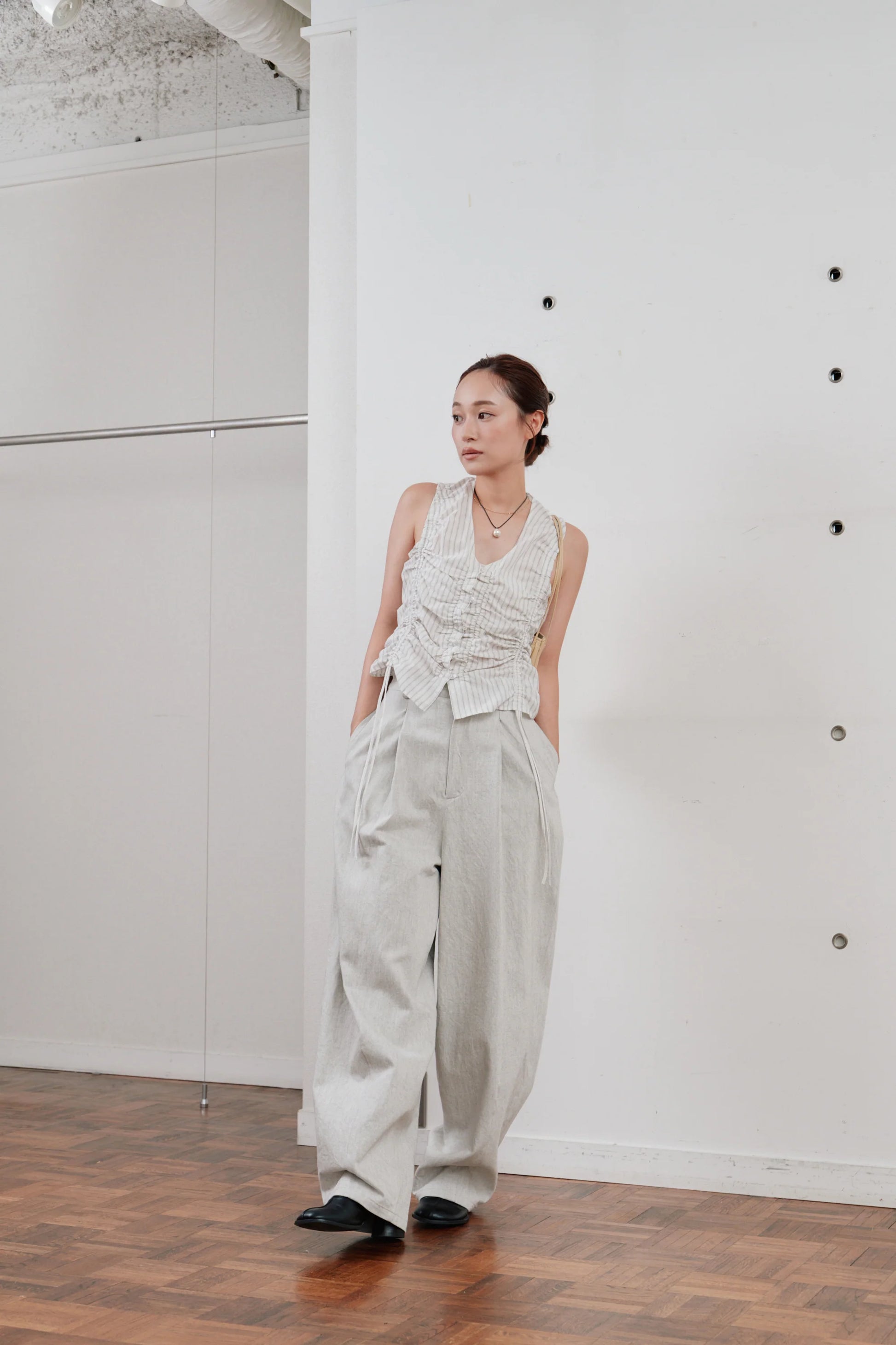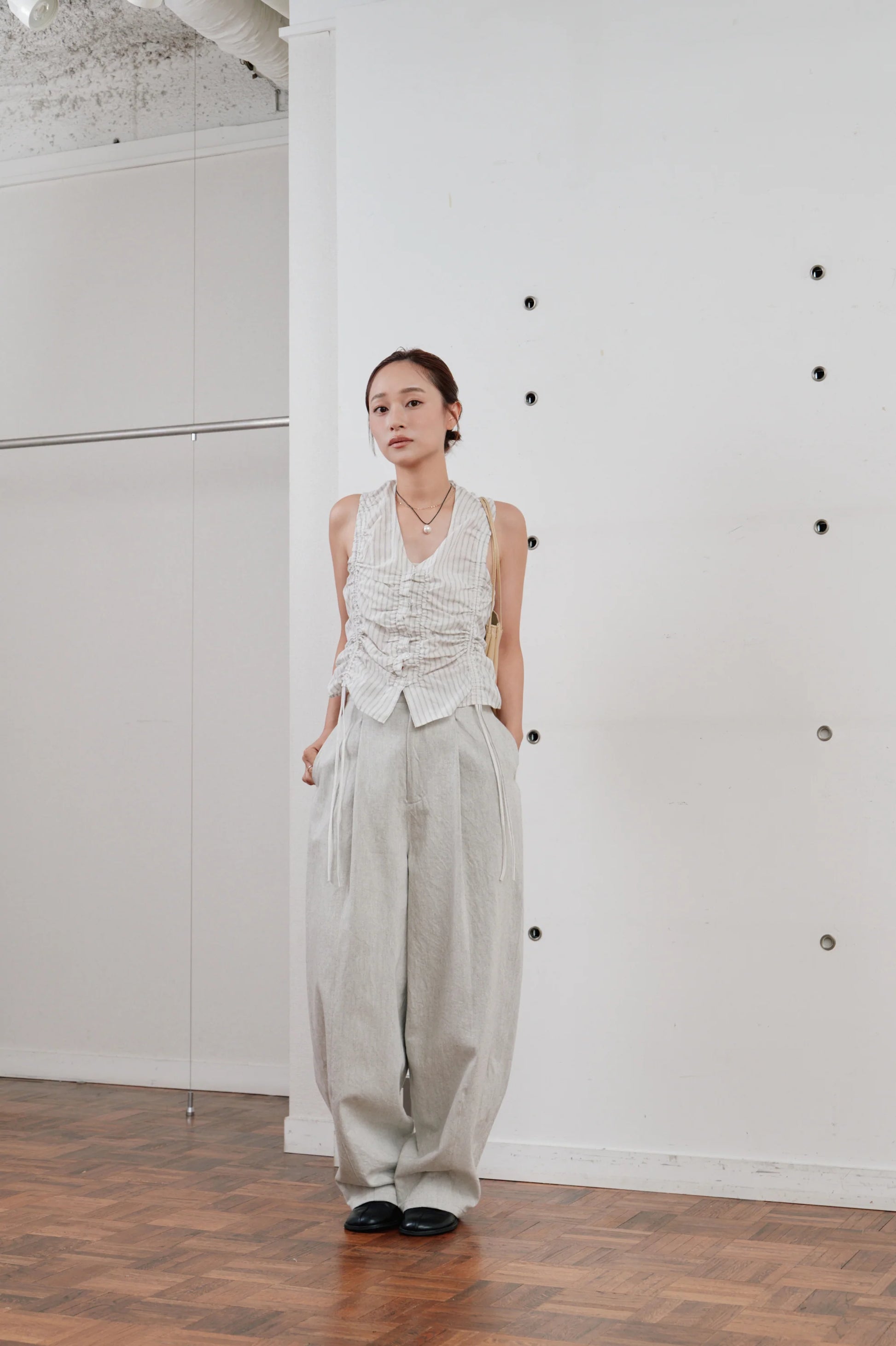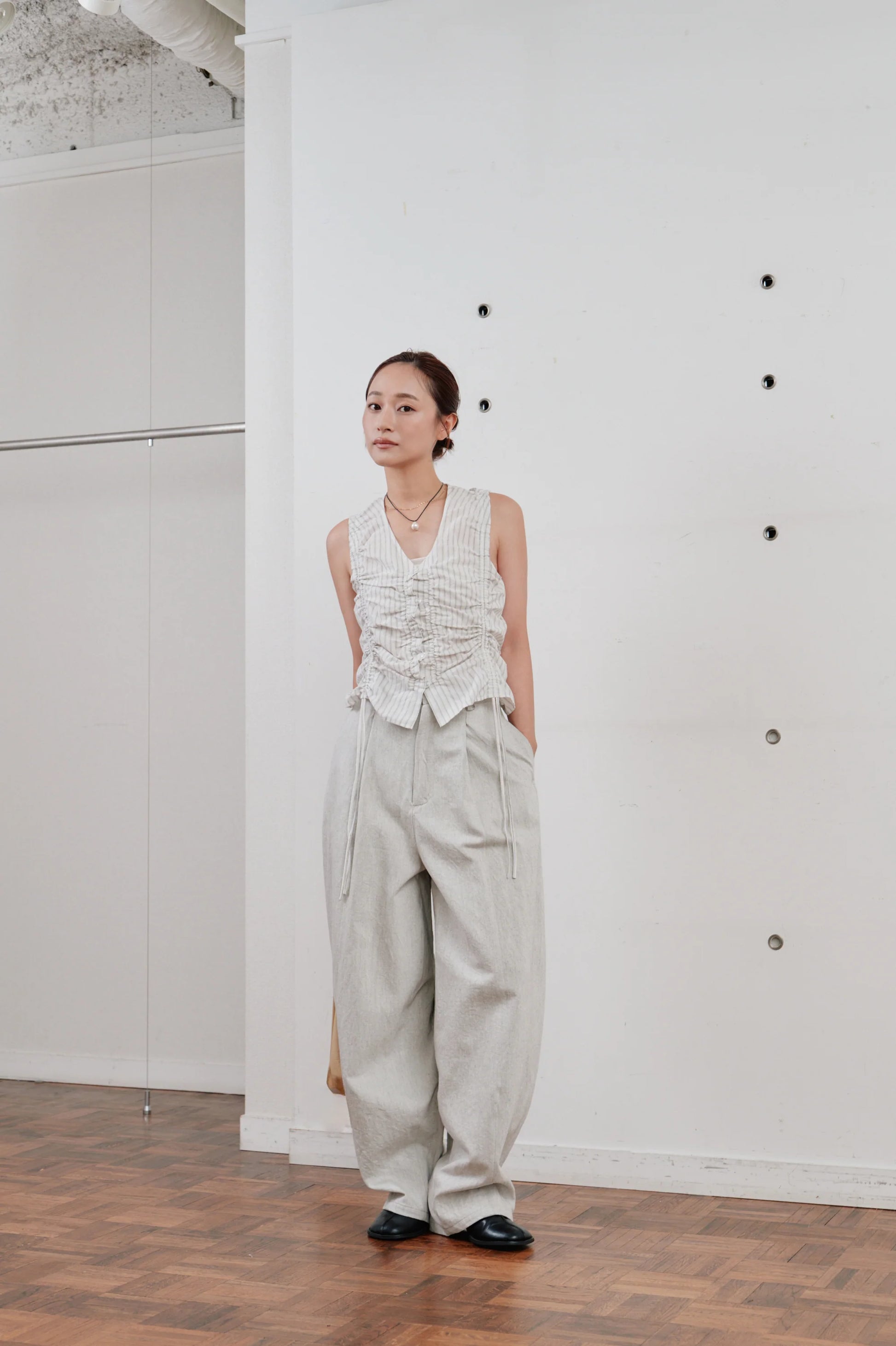 フロントのタックが腰回りにゆとりを持たせ、リラックス感のある佇まいに。