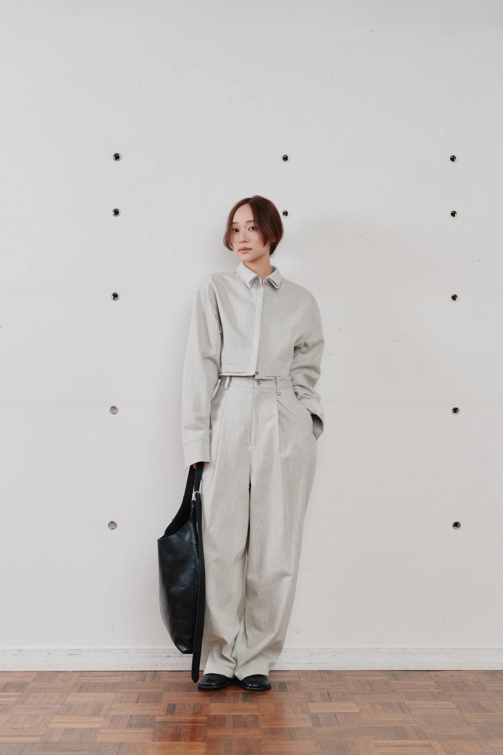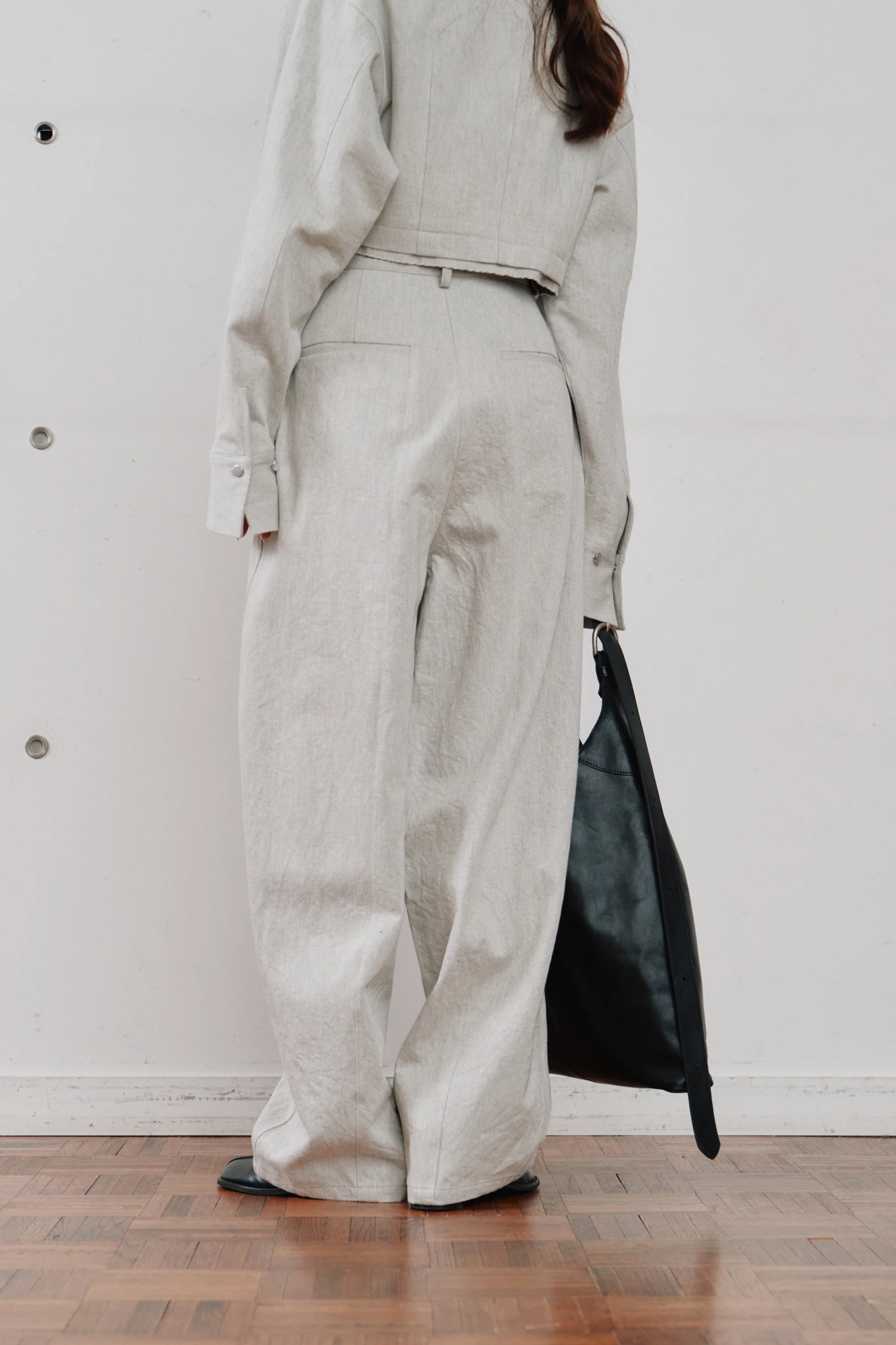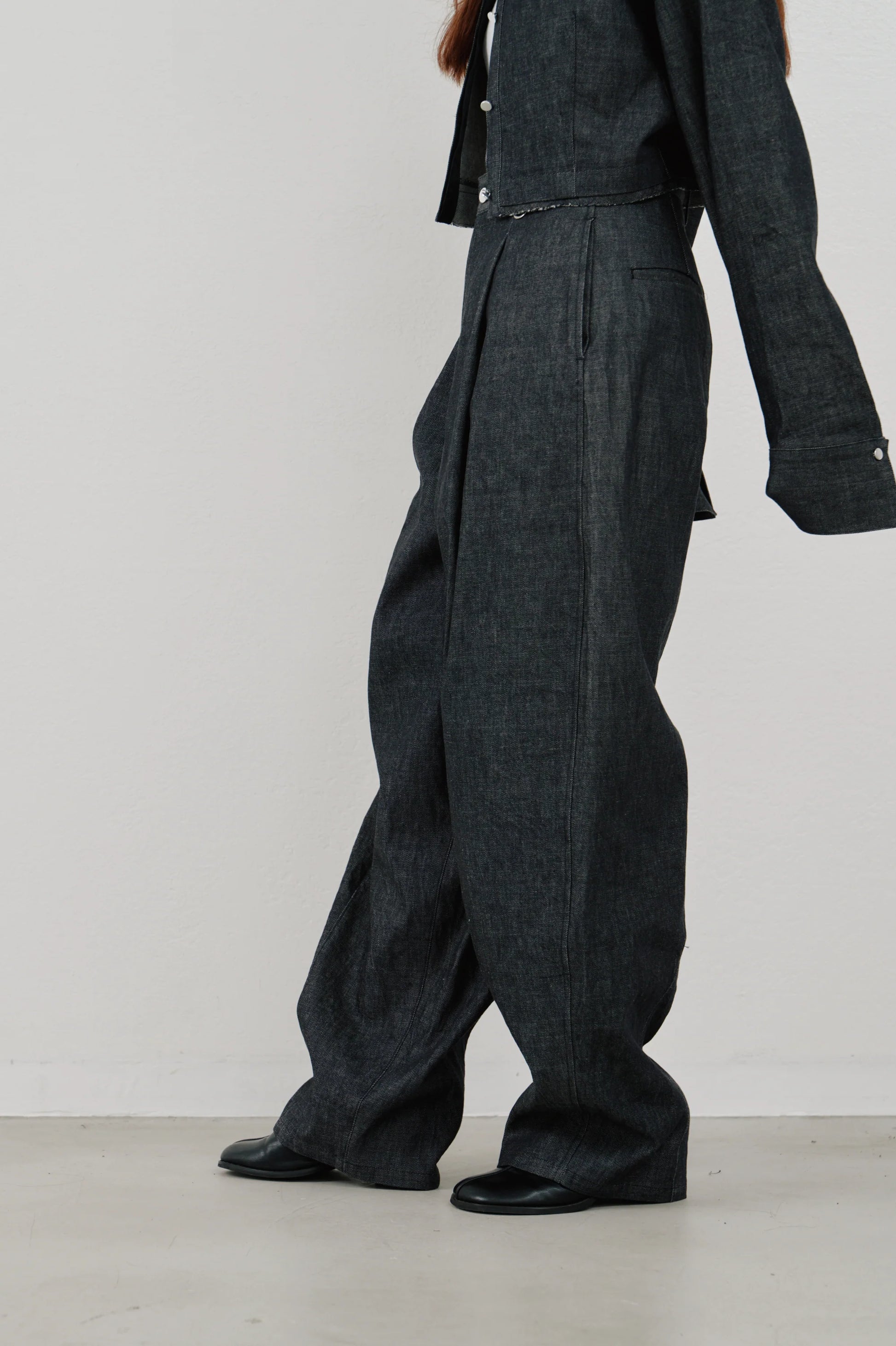 フロントのタックが腰回りにゆとりを持たせ、リラックス感のある佇まいに。
