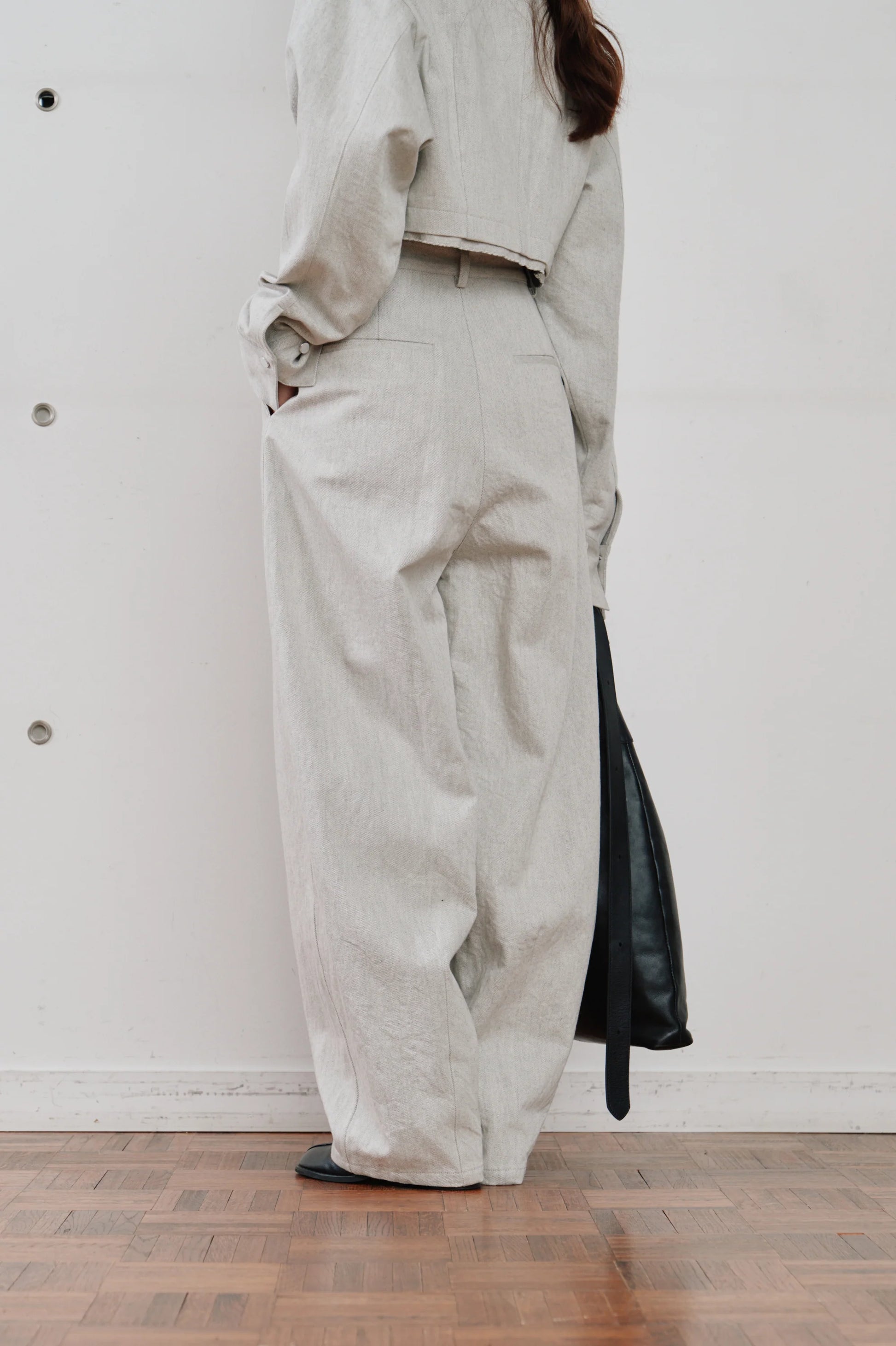 裾に施されたダーツによって作り出されるコクーンシルエットが、脚をすっきりと演出。