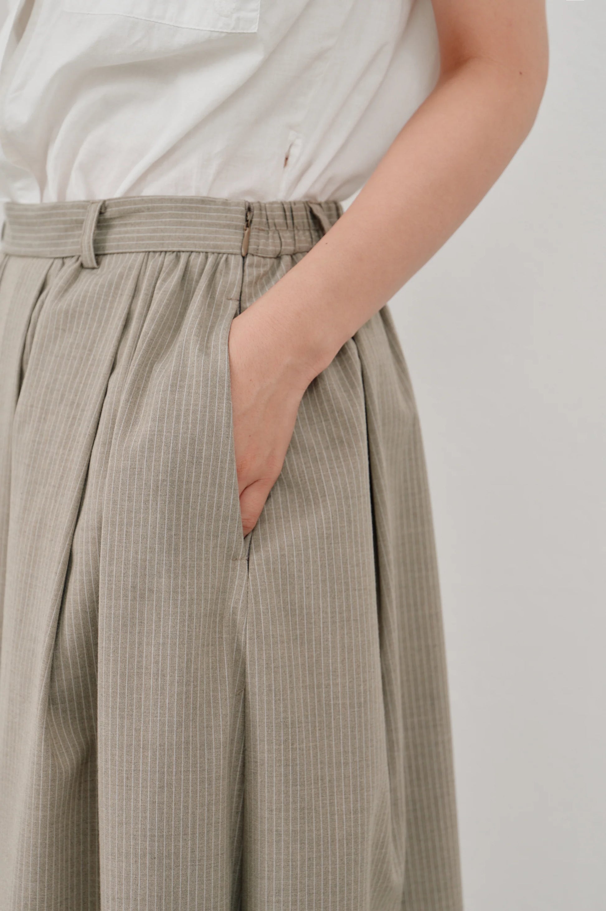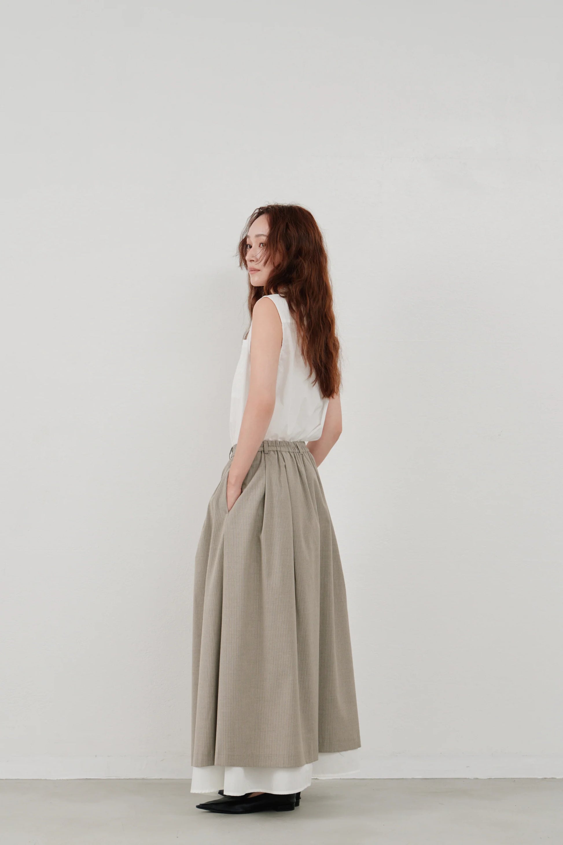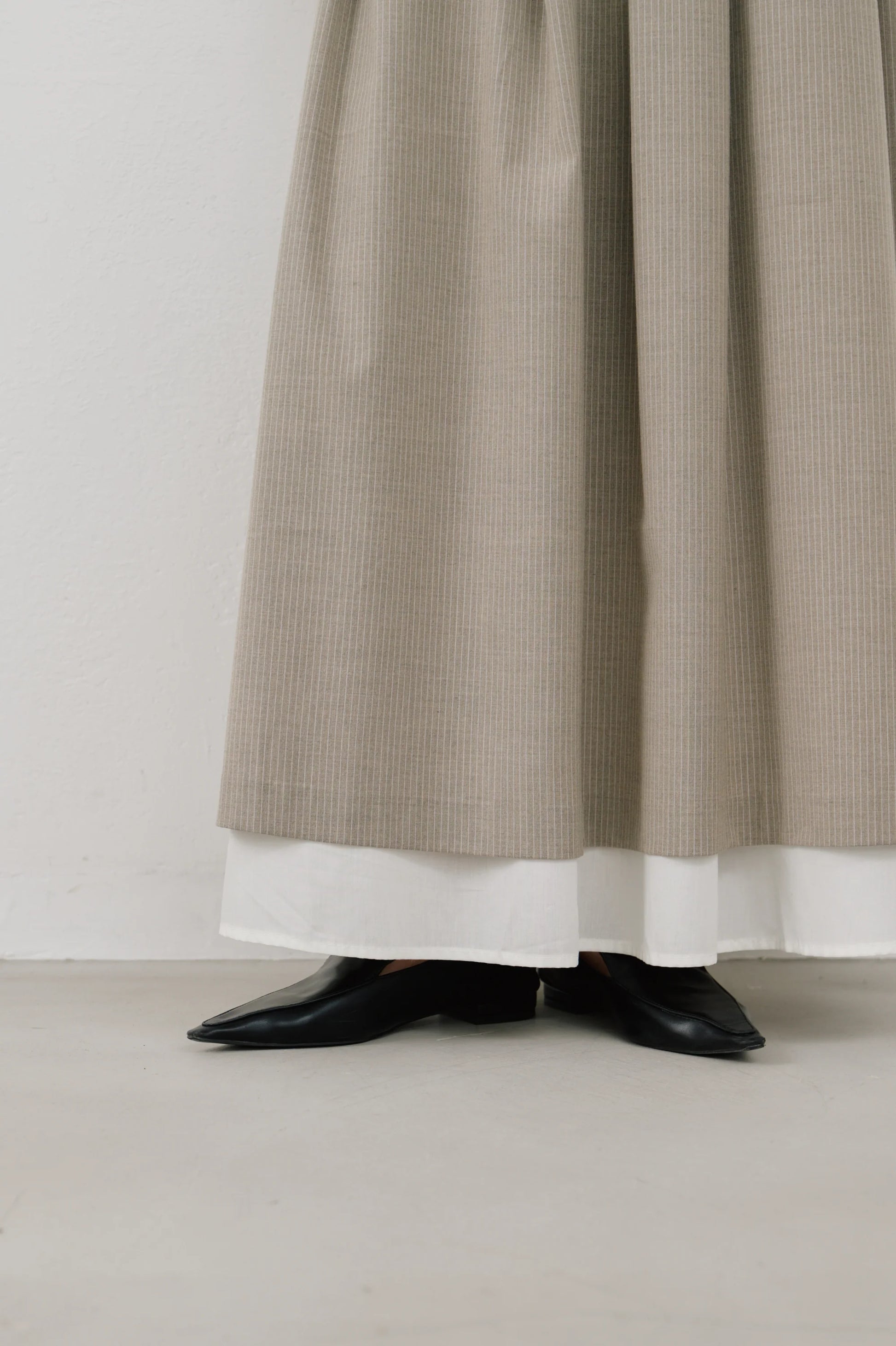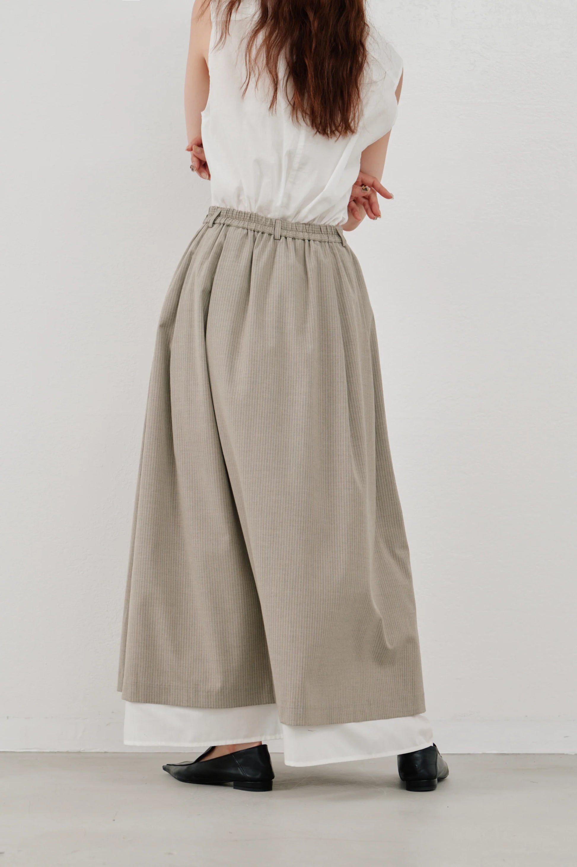 繊細なストライプ柄のウールライク素材に、裾から覗くホワイトの裏地がポイント。