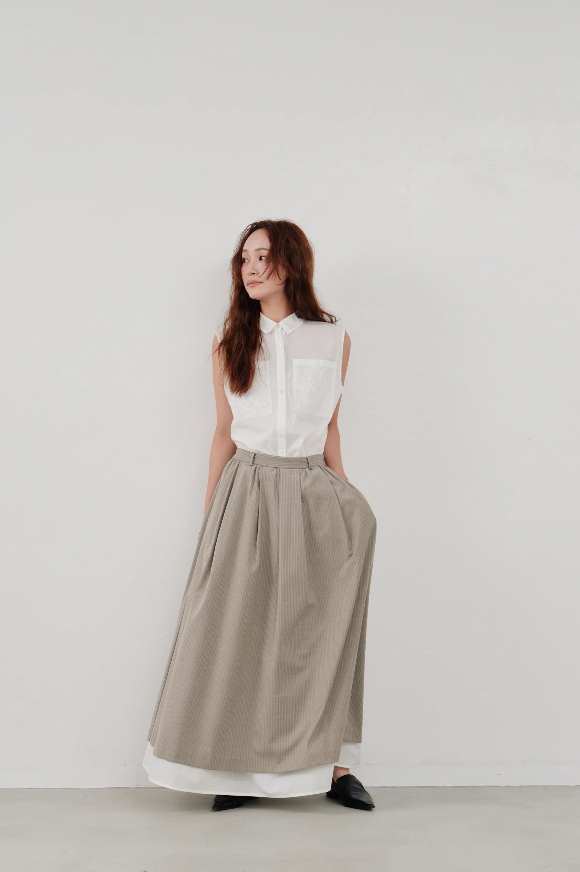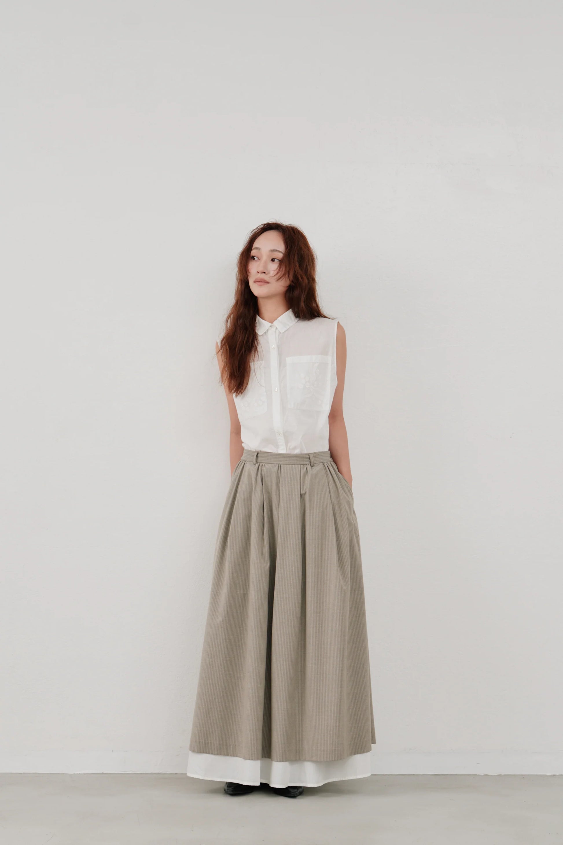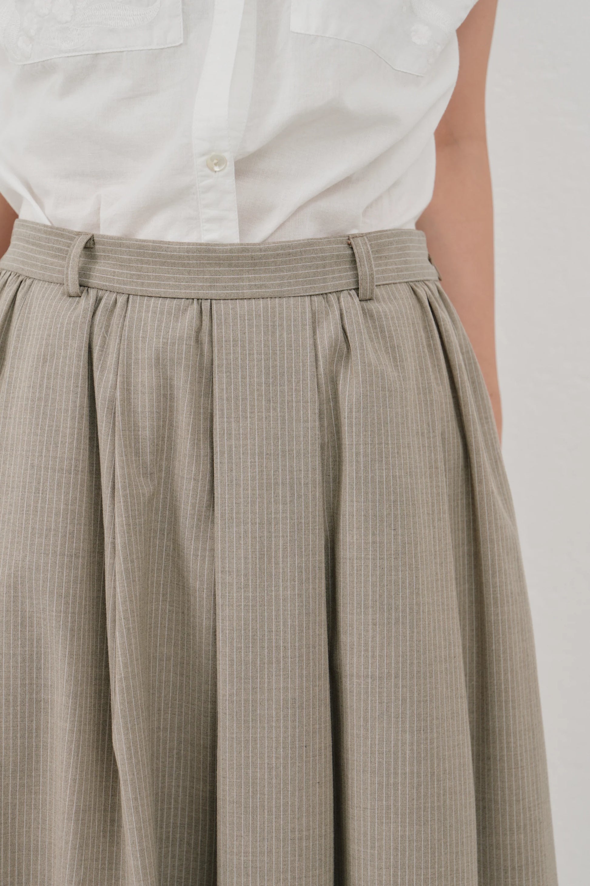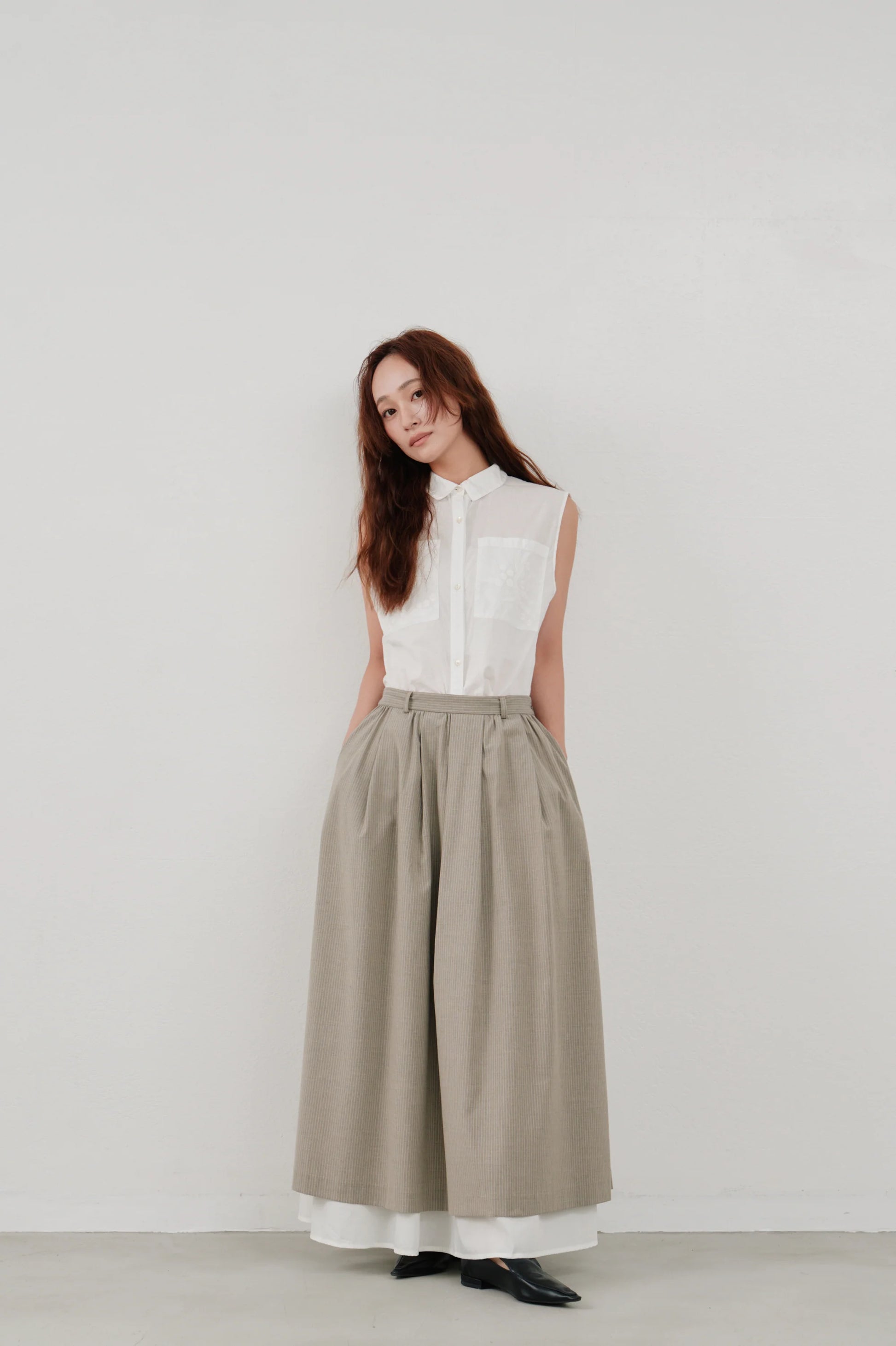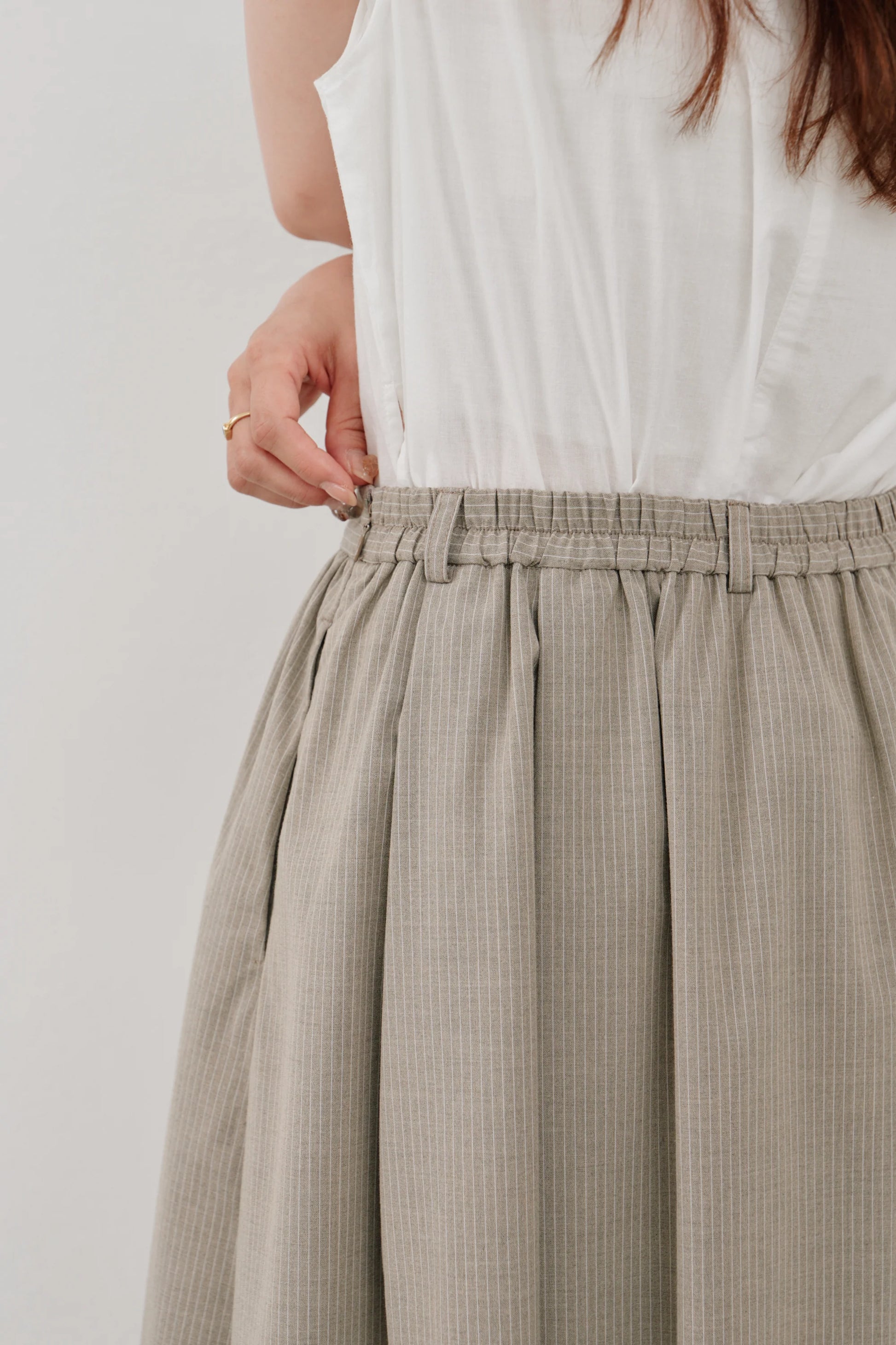 繊細なストライプ柄のウールライク素材に、裾から覗くホワイトの裏地がポイント。