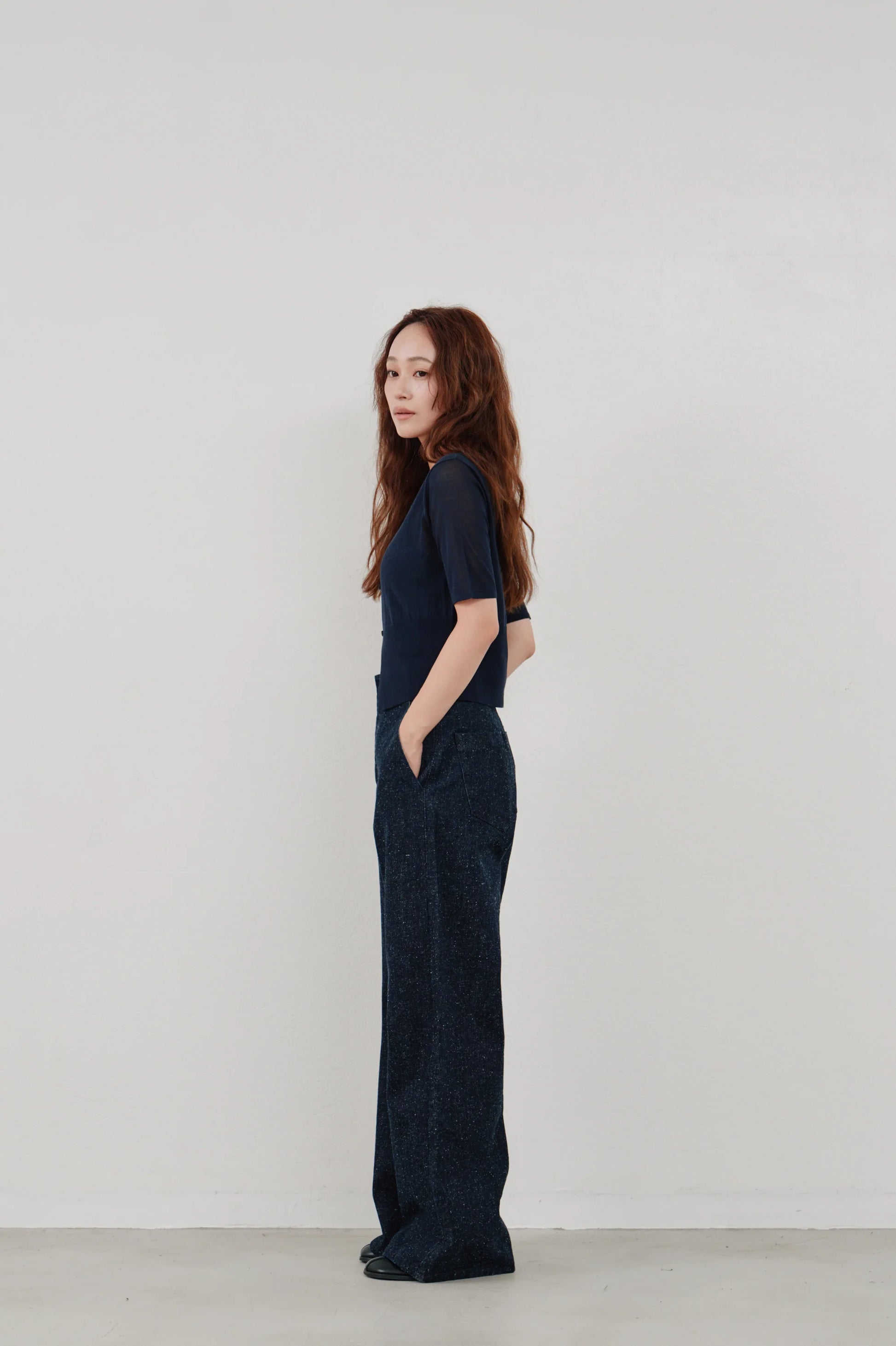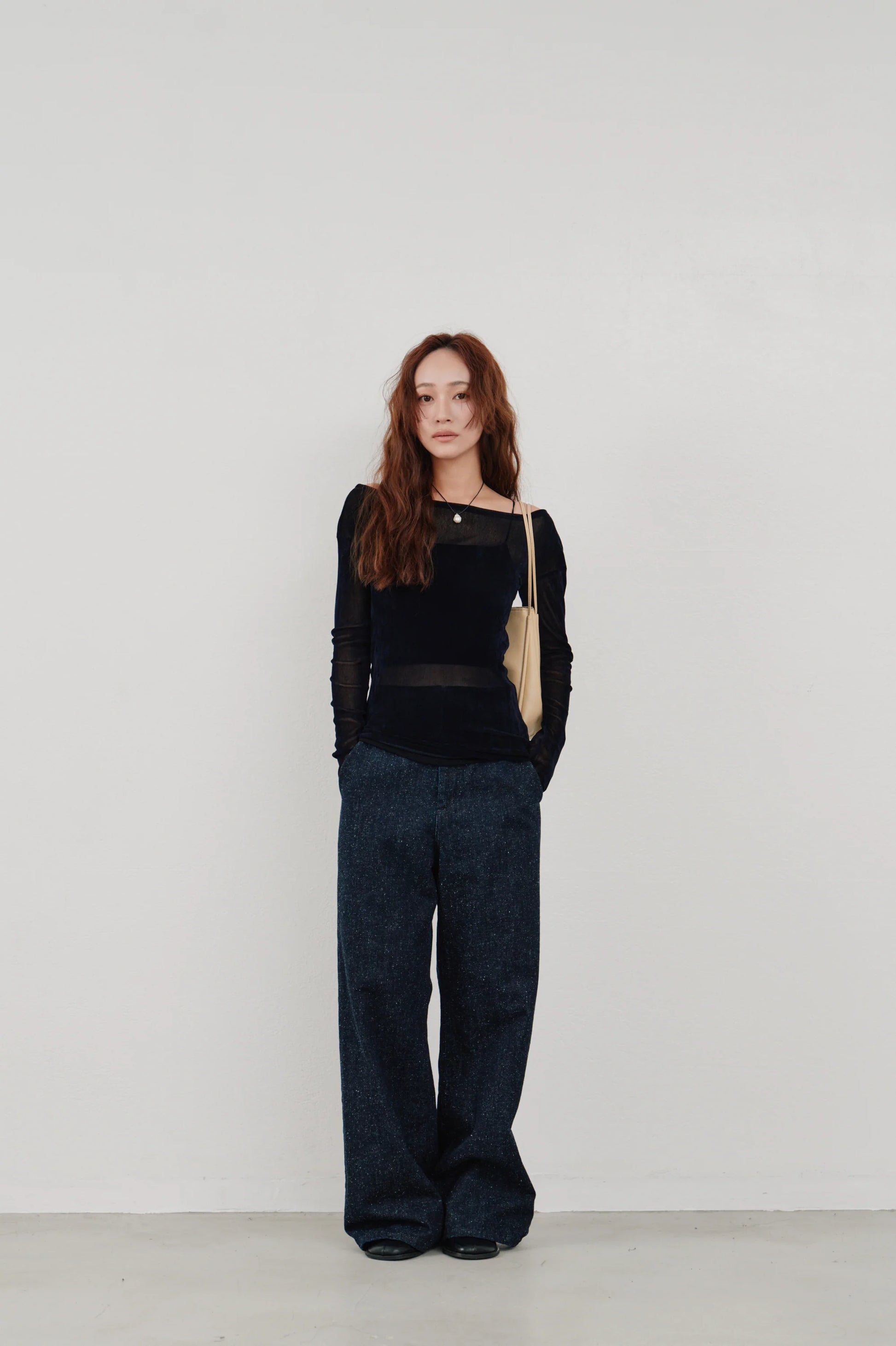 ミニマルなトップスと合わせると、より一層洗練された印象に。