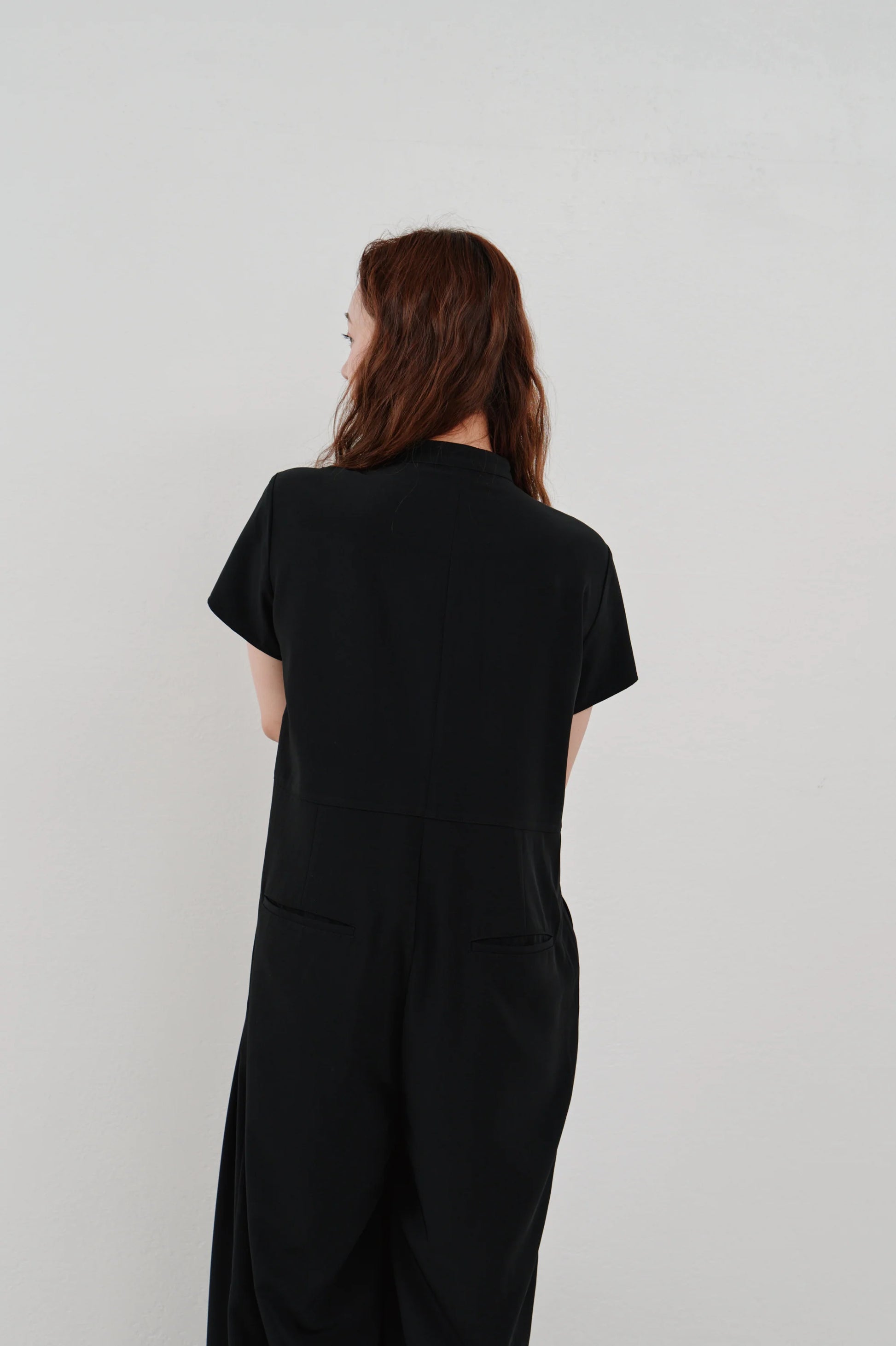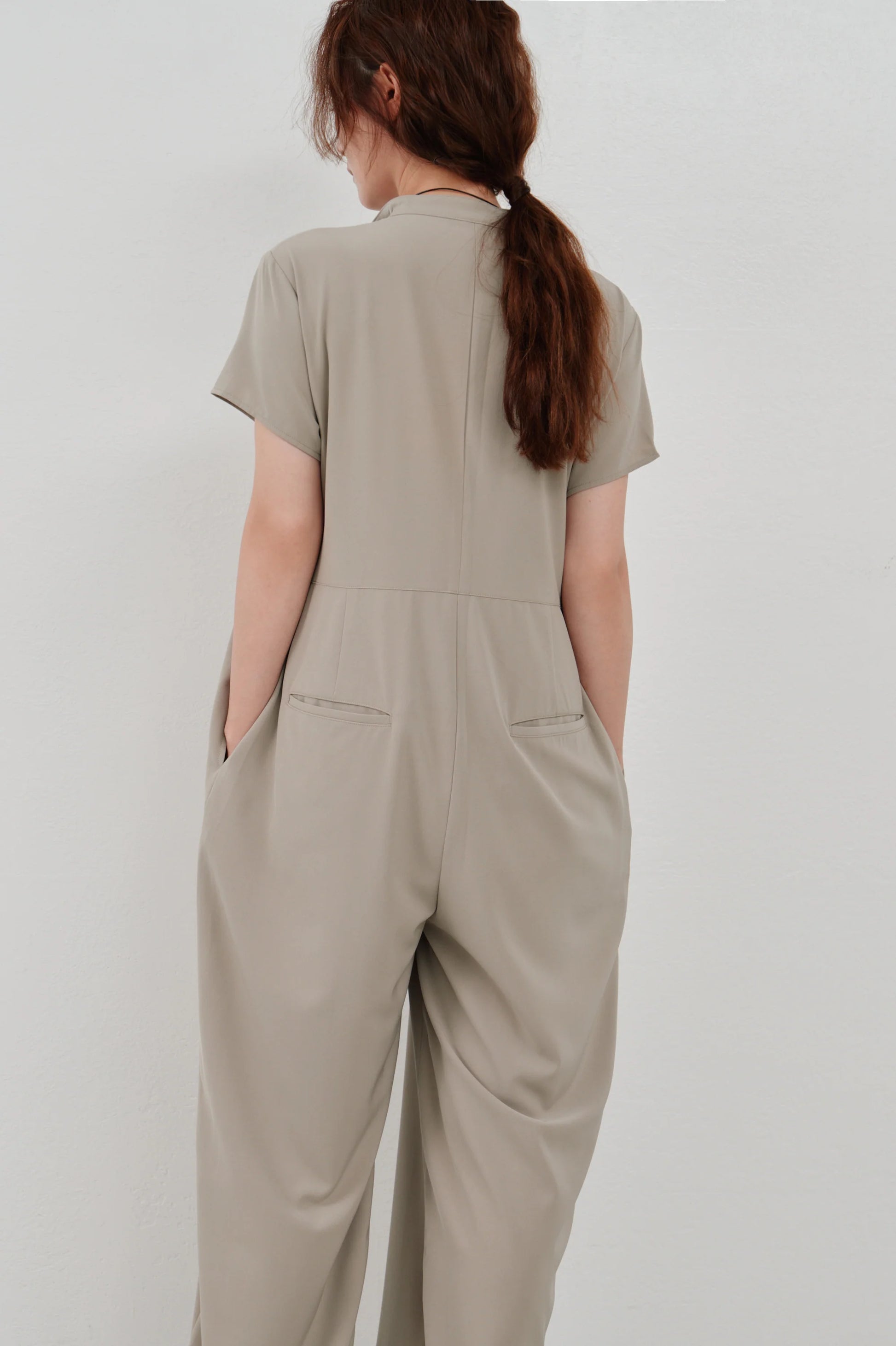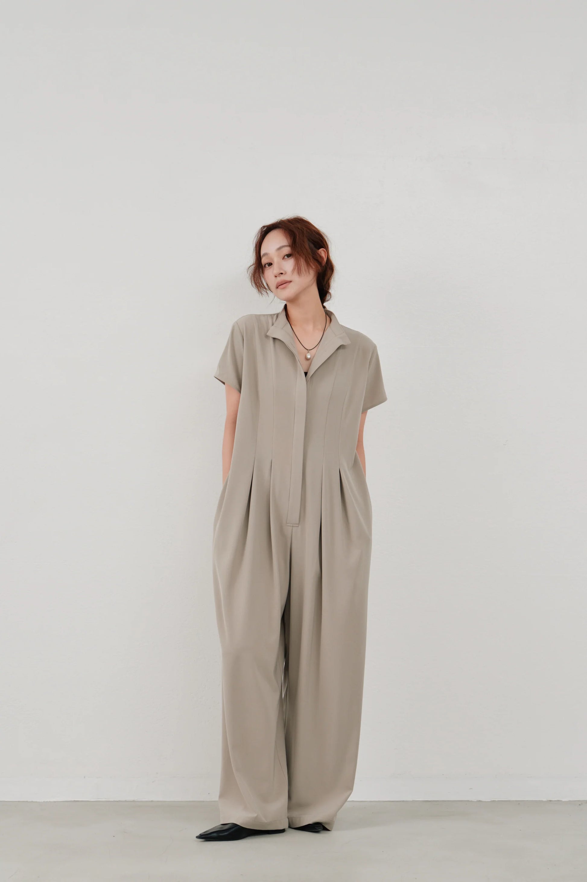 スタンドカラーが印象的な、ミニマルデザインのコンビネゾン。