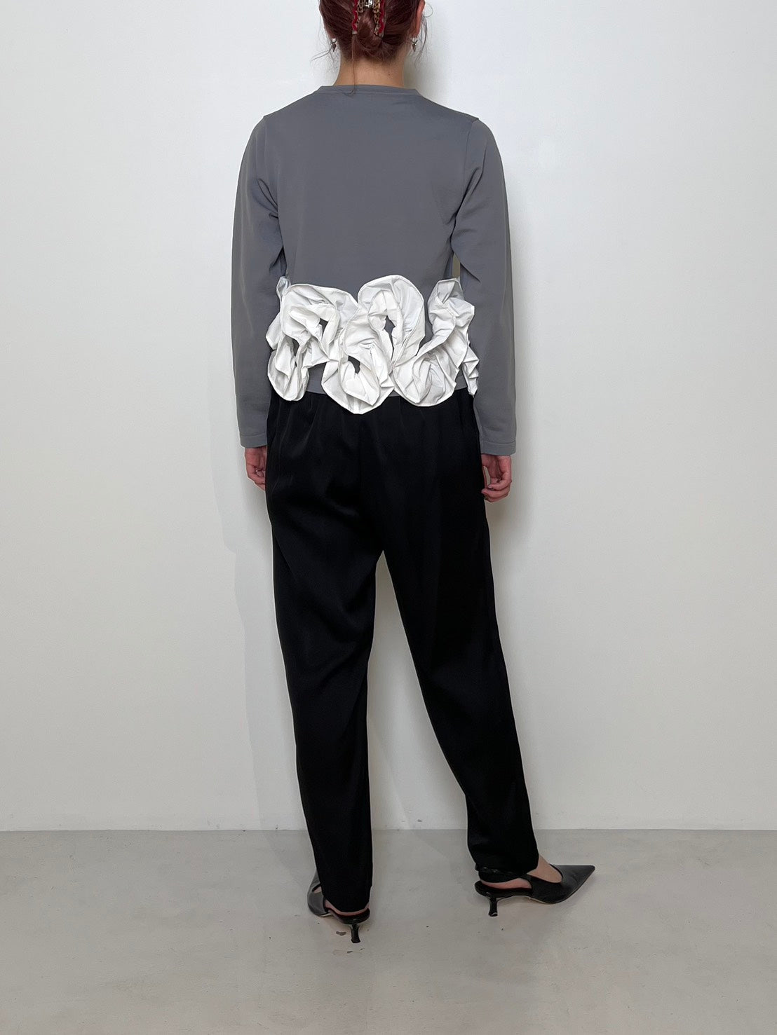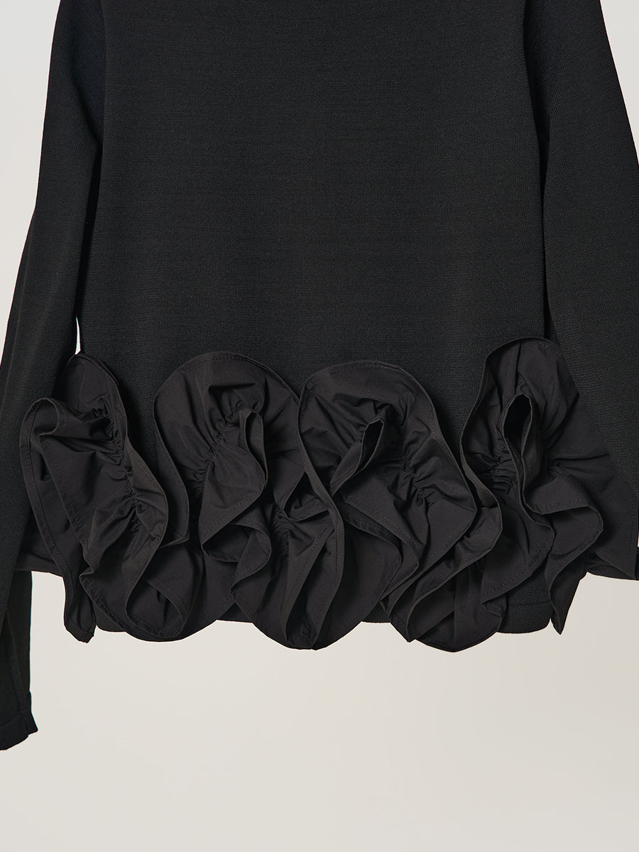 裾にはたっぷりとあしらわれたフリルが、まるで花びらのようにふんわり揺れて、目を惹くデザインに。