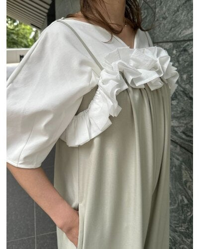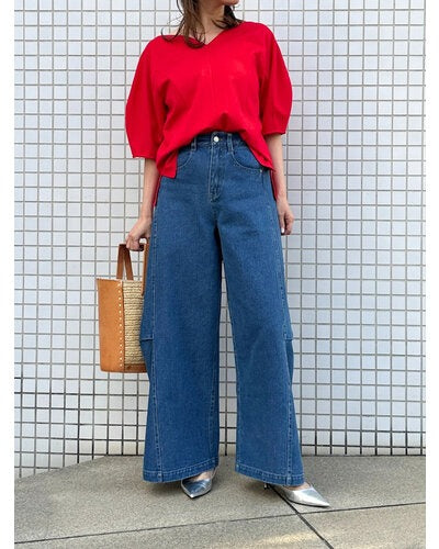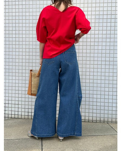 デコルテがきれいに見える開き具合で、同色展開をしているパッド付きキャミをインすれば、抜け感のあるヘルシーな肌見せが完成。